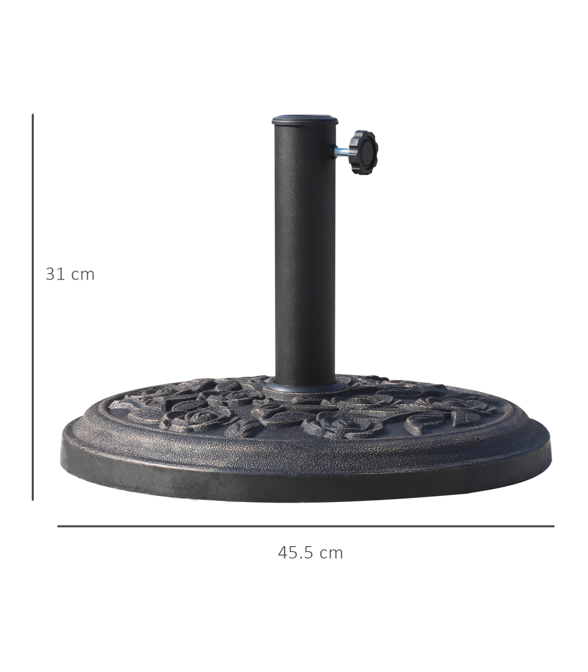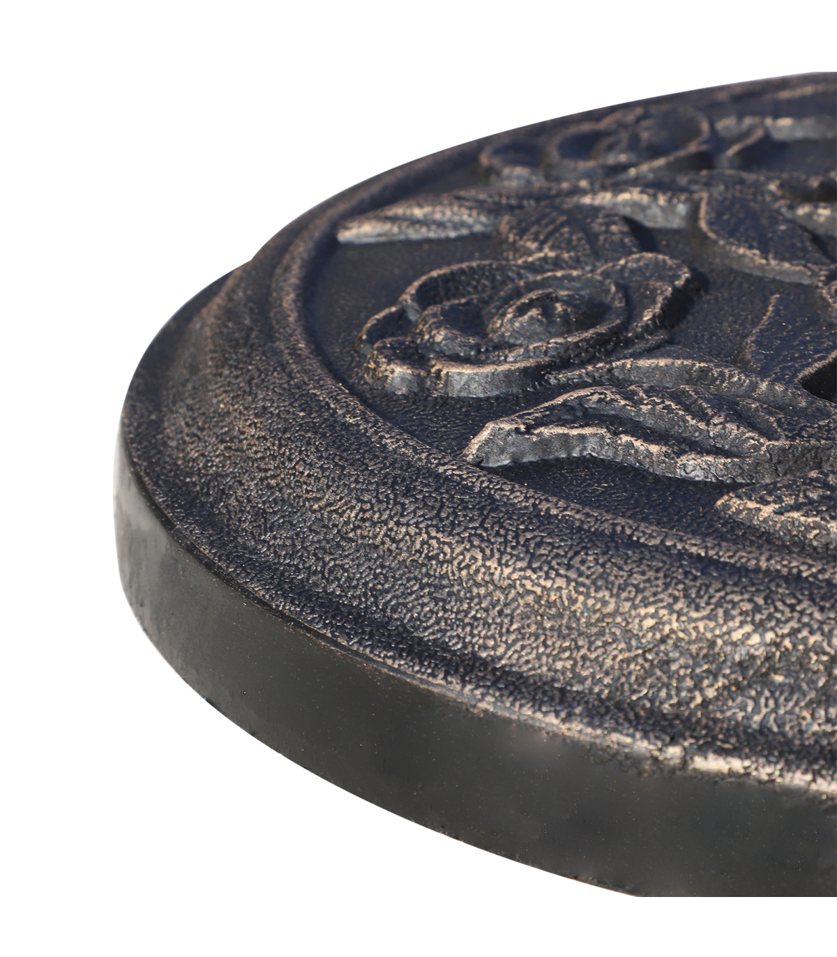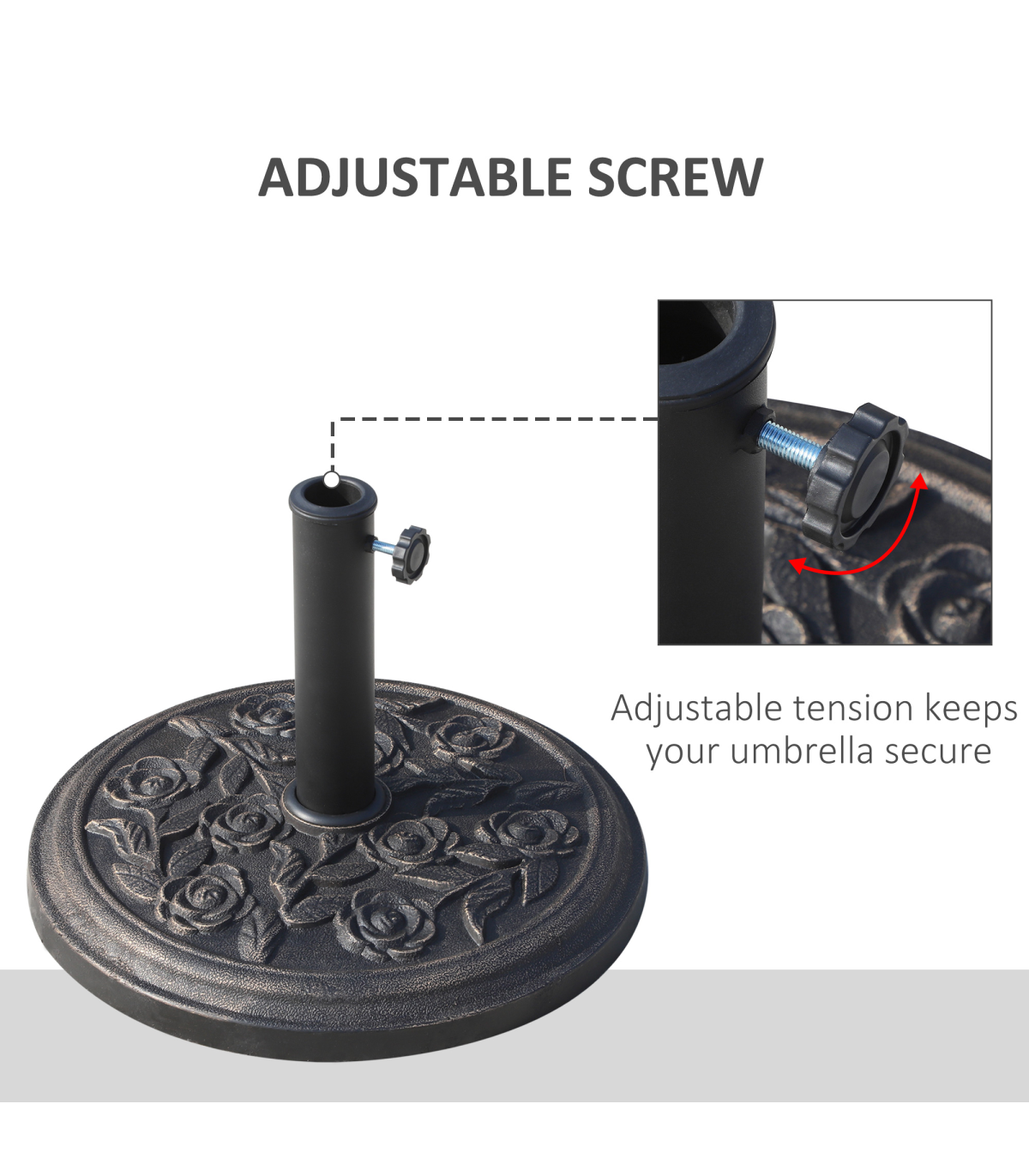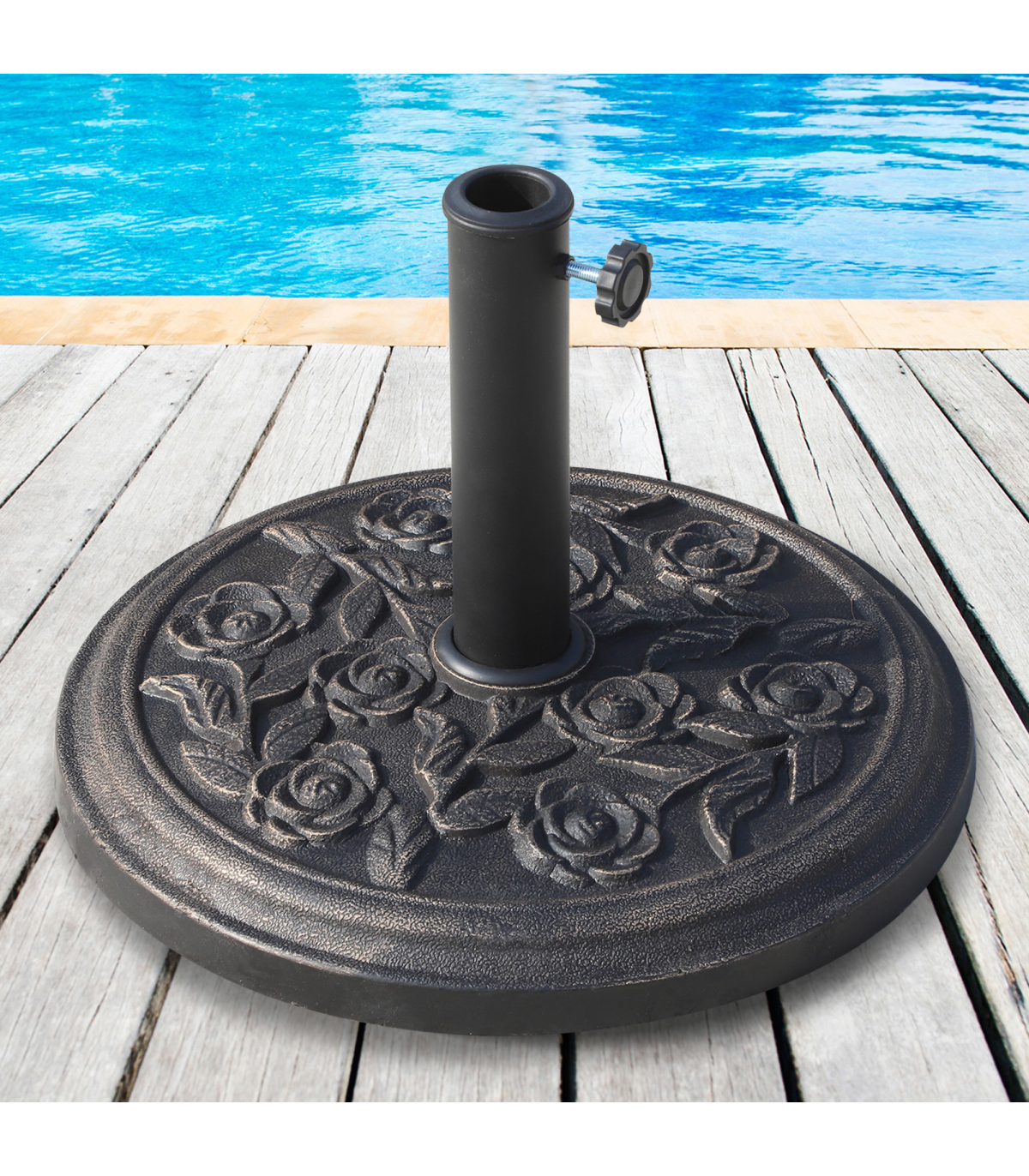 This attractive decorative rose pattern umbrella base combines aesthetic appeal with practical functionality. Crafted from durable rust-resistant resin, it securely holds your patio umbrella in place, ensuring stability and elegance in your outdoor spaces.