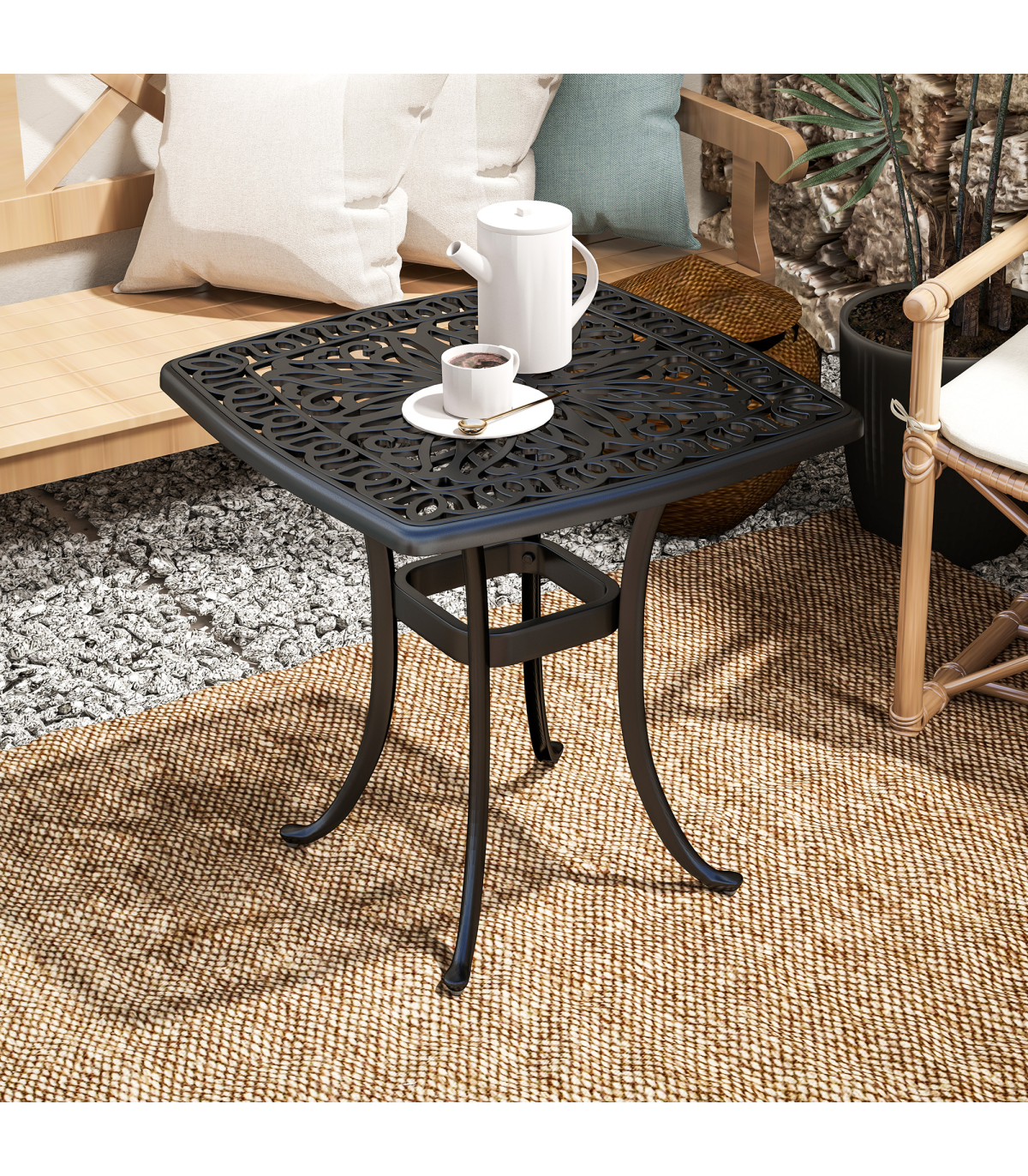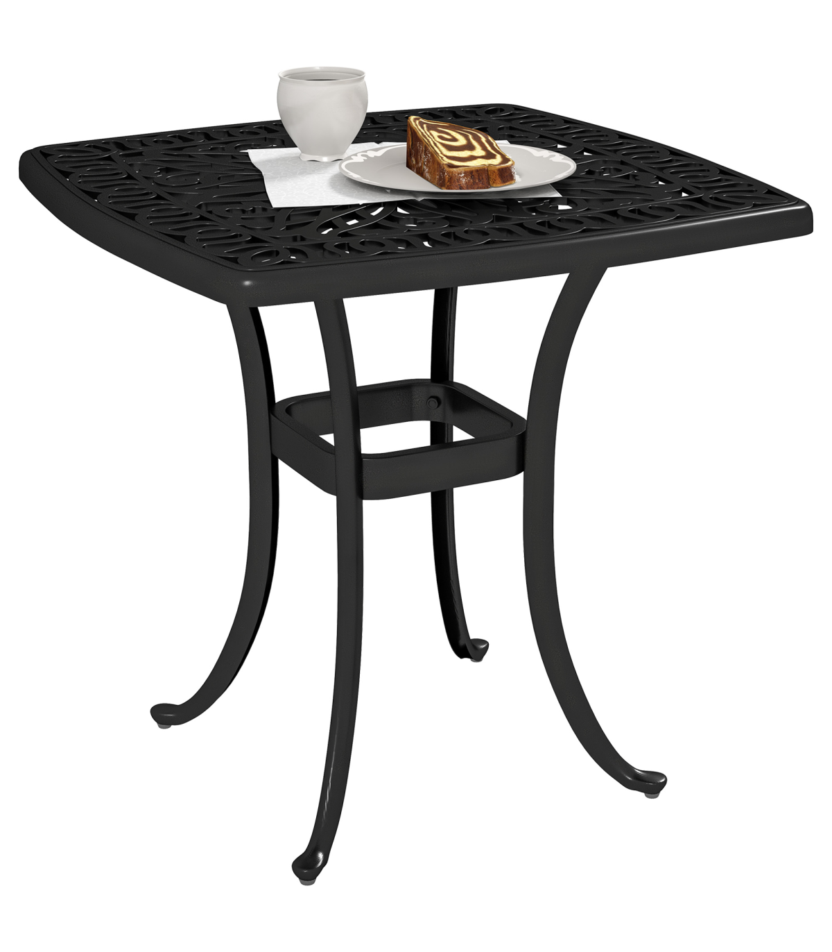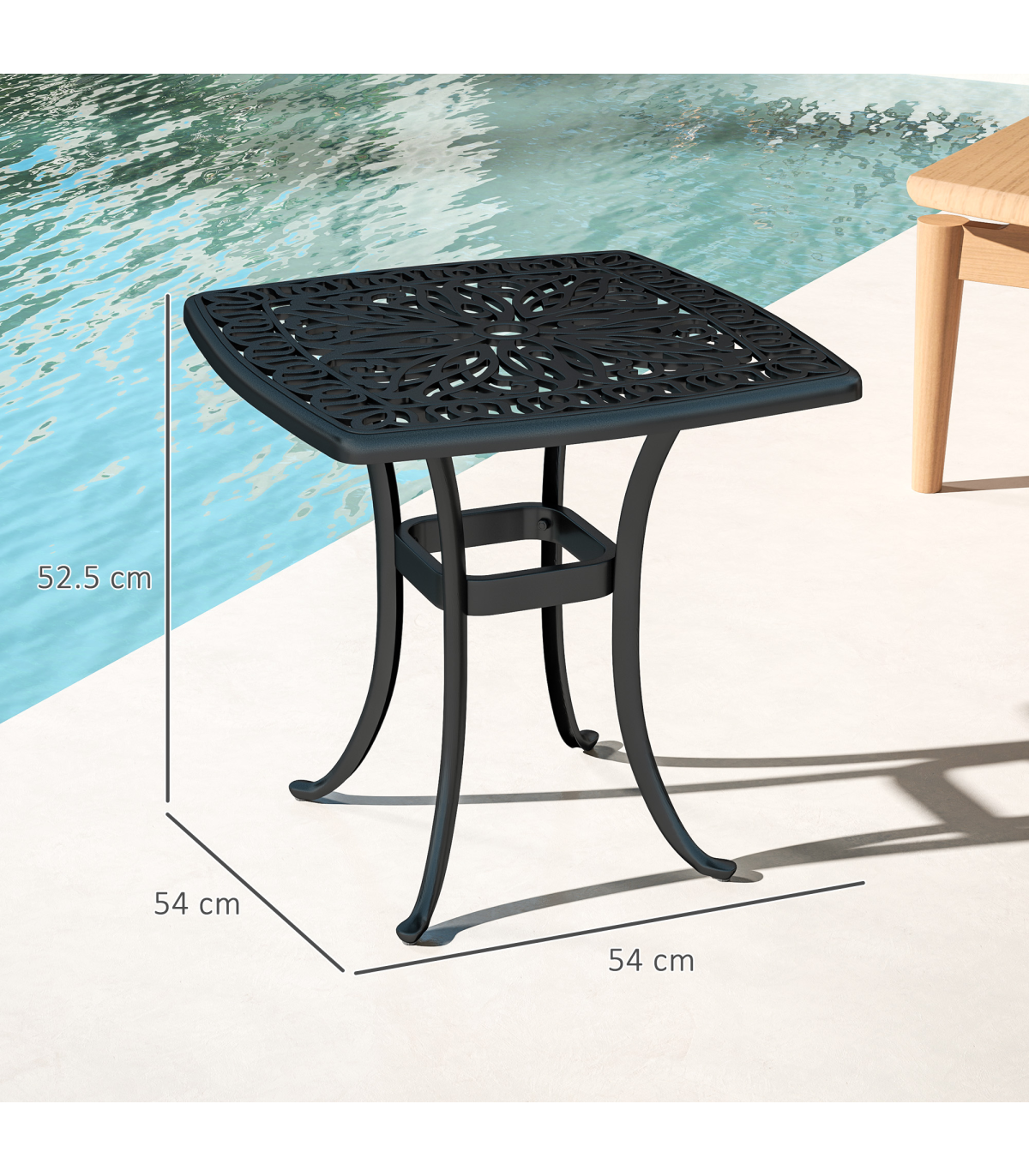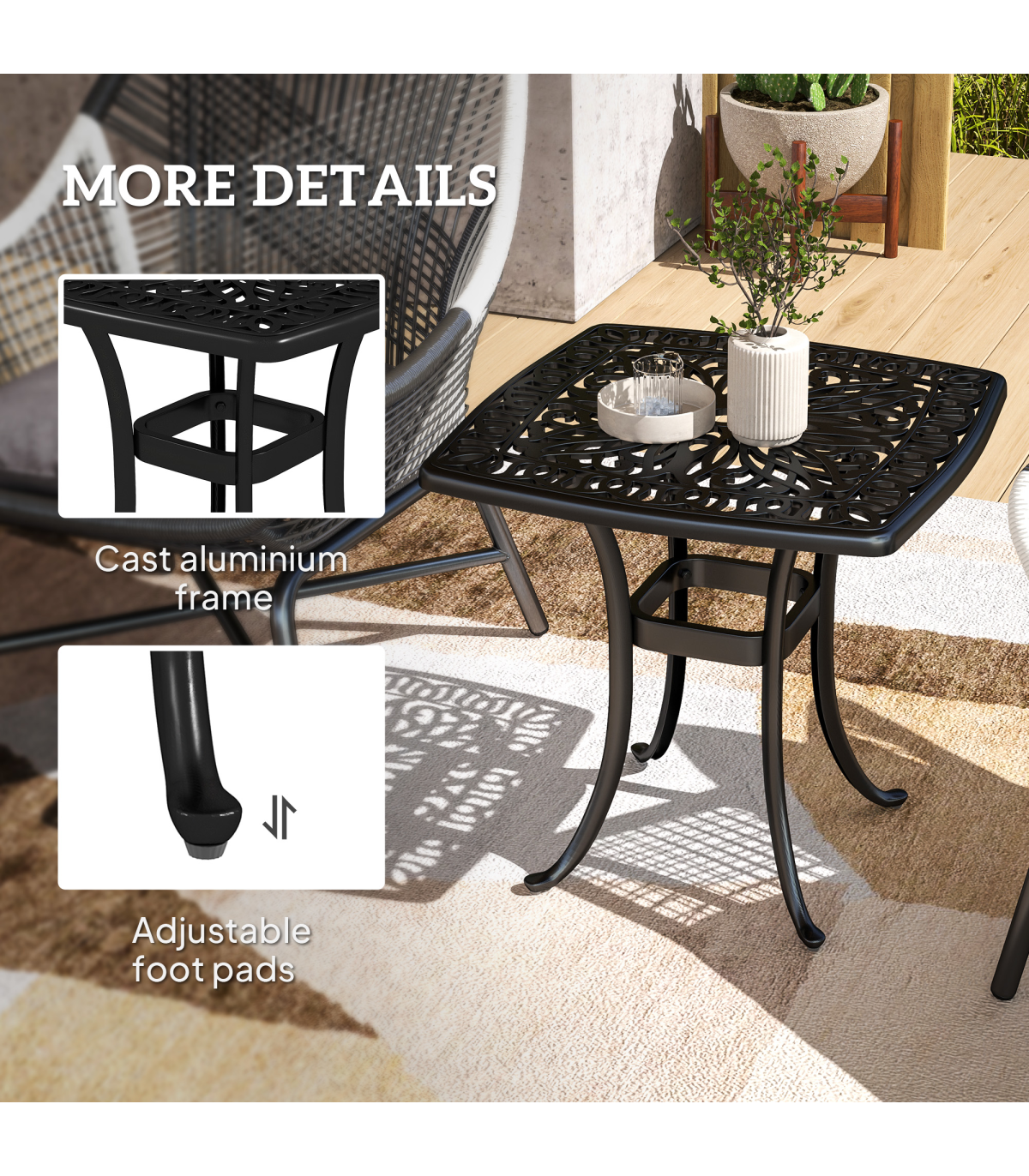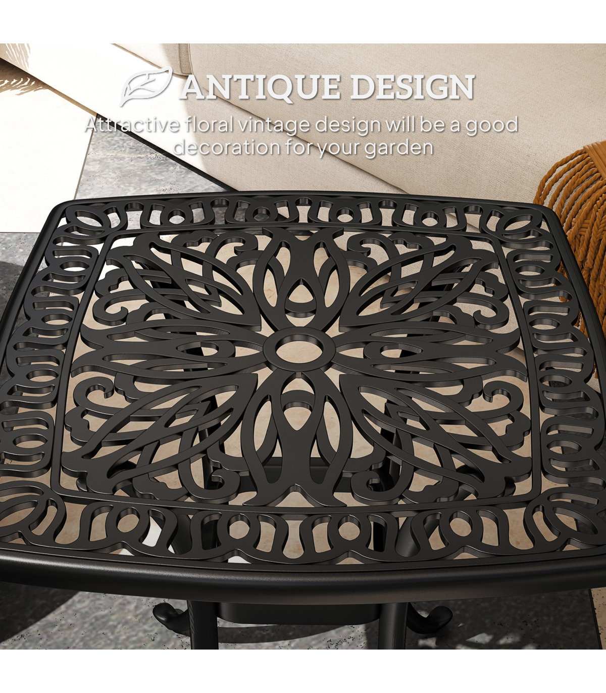 Enhance your outdoor space with our stylish aluminium bistro table, featuring a dedicated 38mm central hole for securing a parasol umbrella. Its elegant floral cut-out design and black finish add a touch of antique charm to any balcony or patio setting.