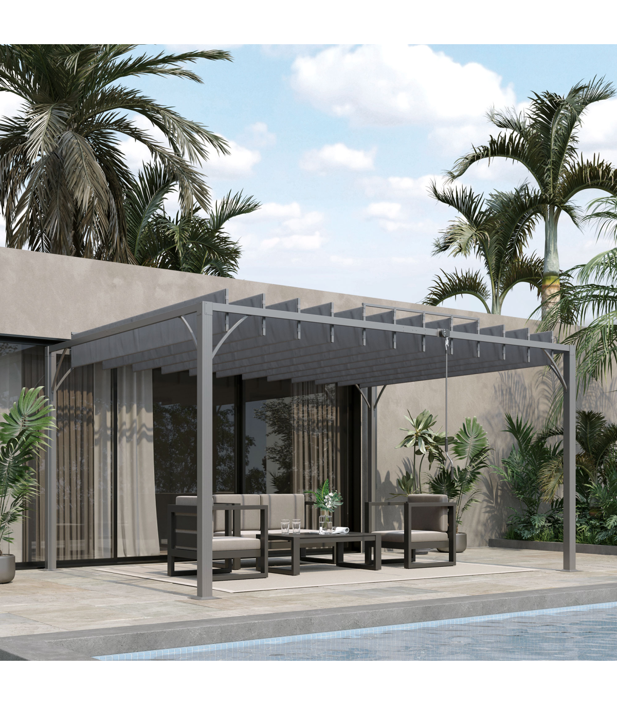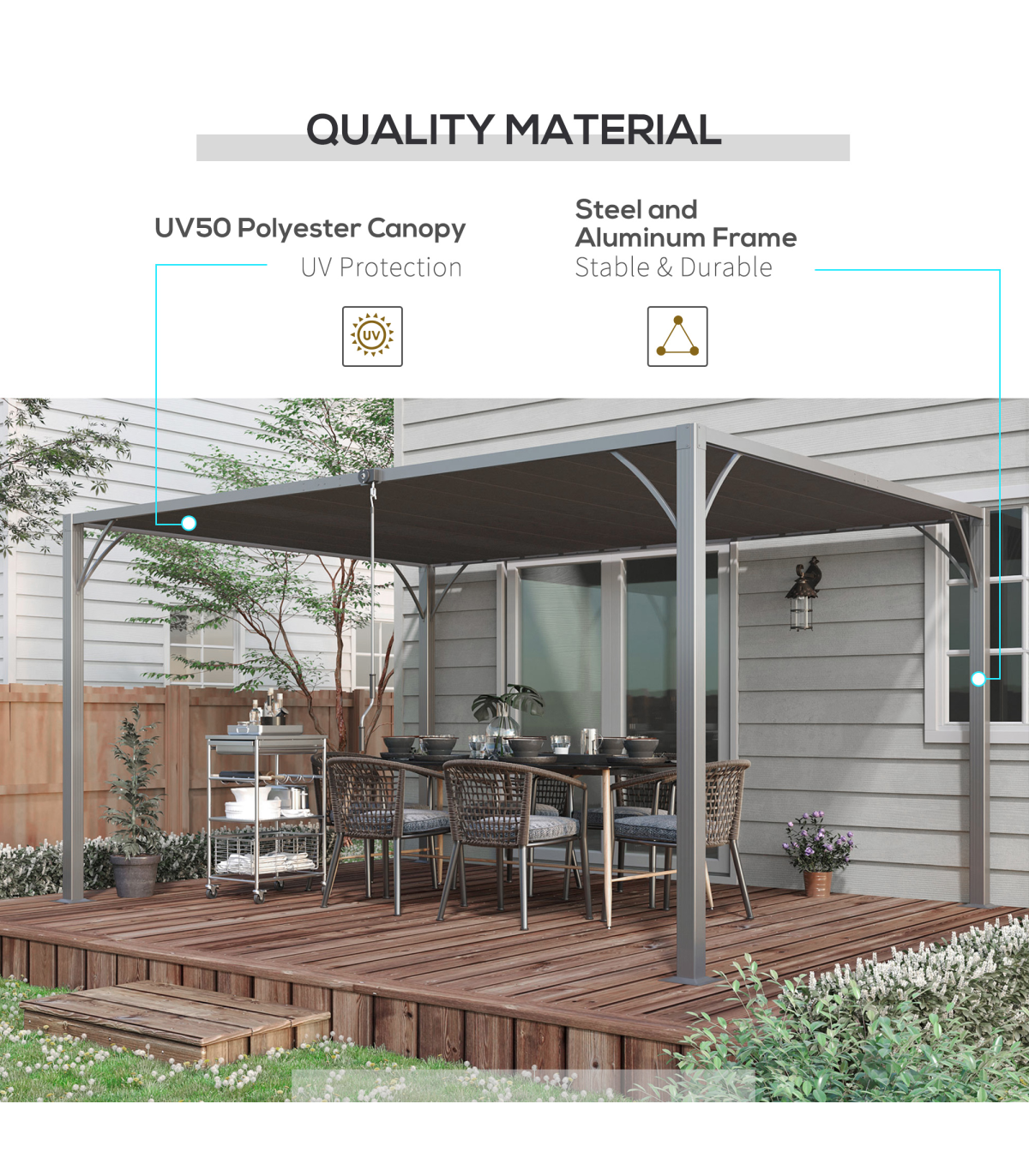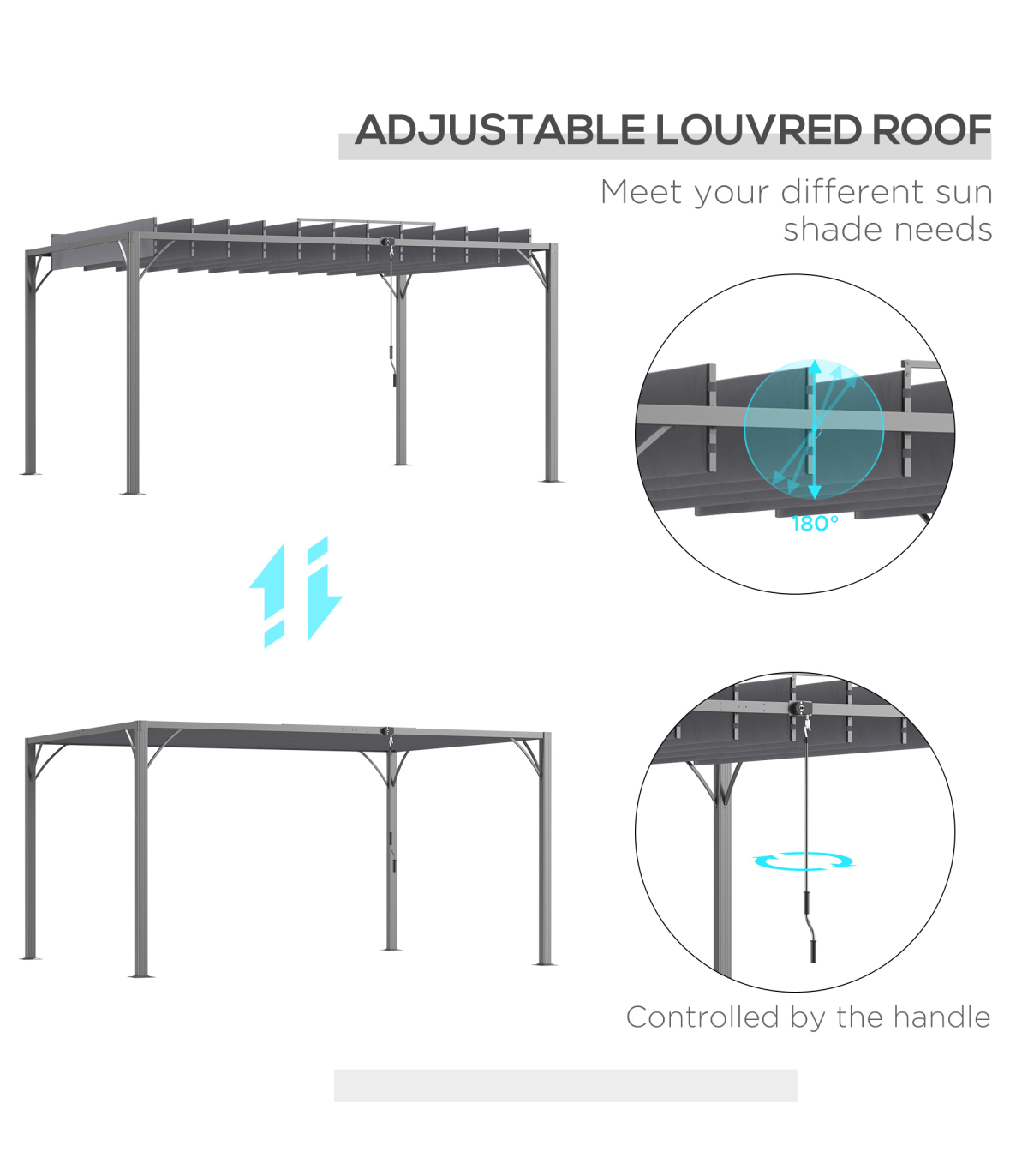 ● 135° louvred roof with UV50+ protection shields from sunlight and UV rays