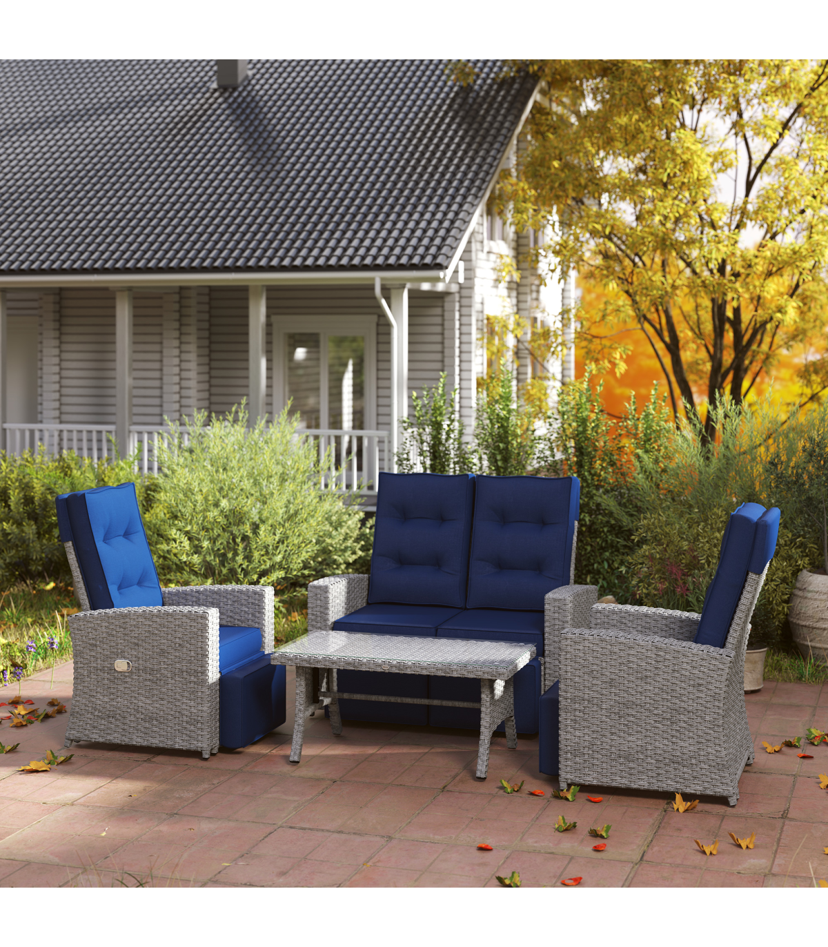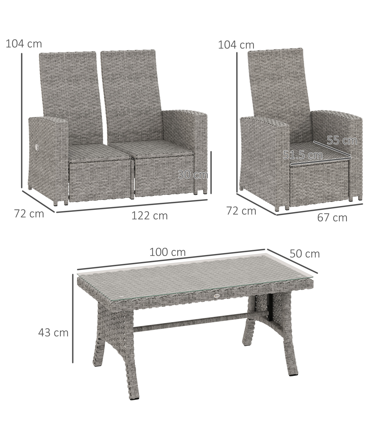 Transform your outdoor space with this stylish Grey Rattan Garden Furniture Set. This four-piece set includes a reclining loveseat, two armchairs, and a matching coffee table, perfect for relaxation and social gathering.