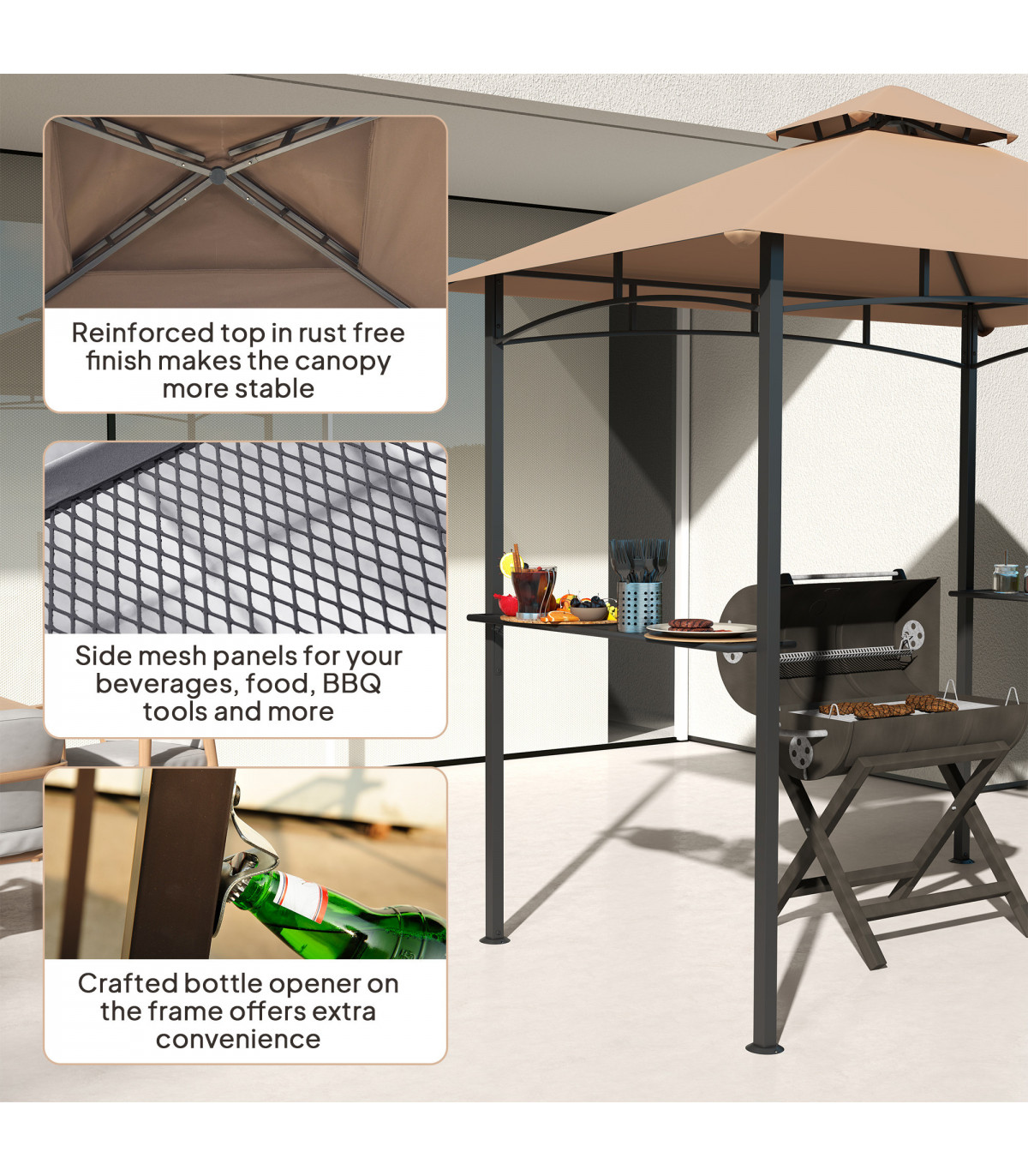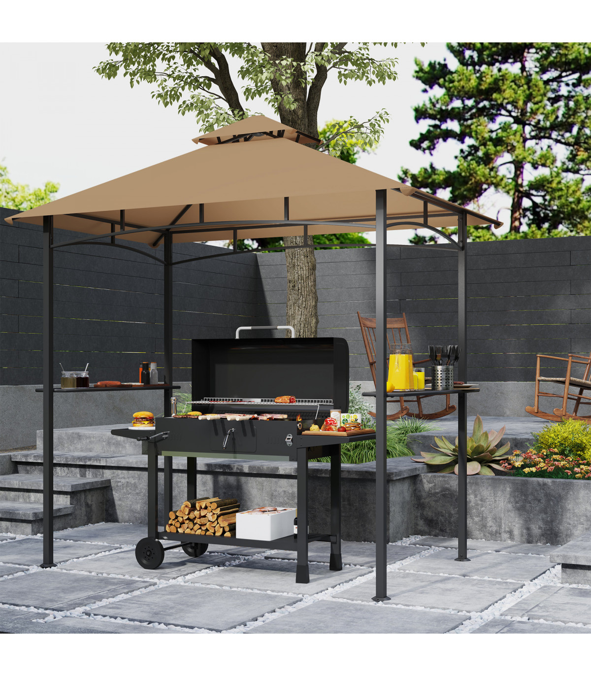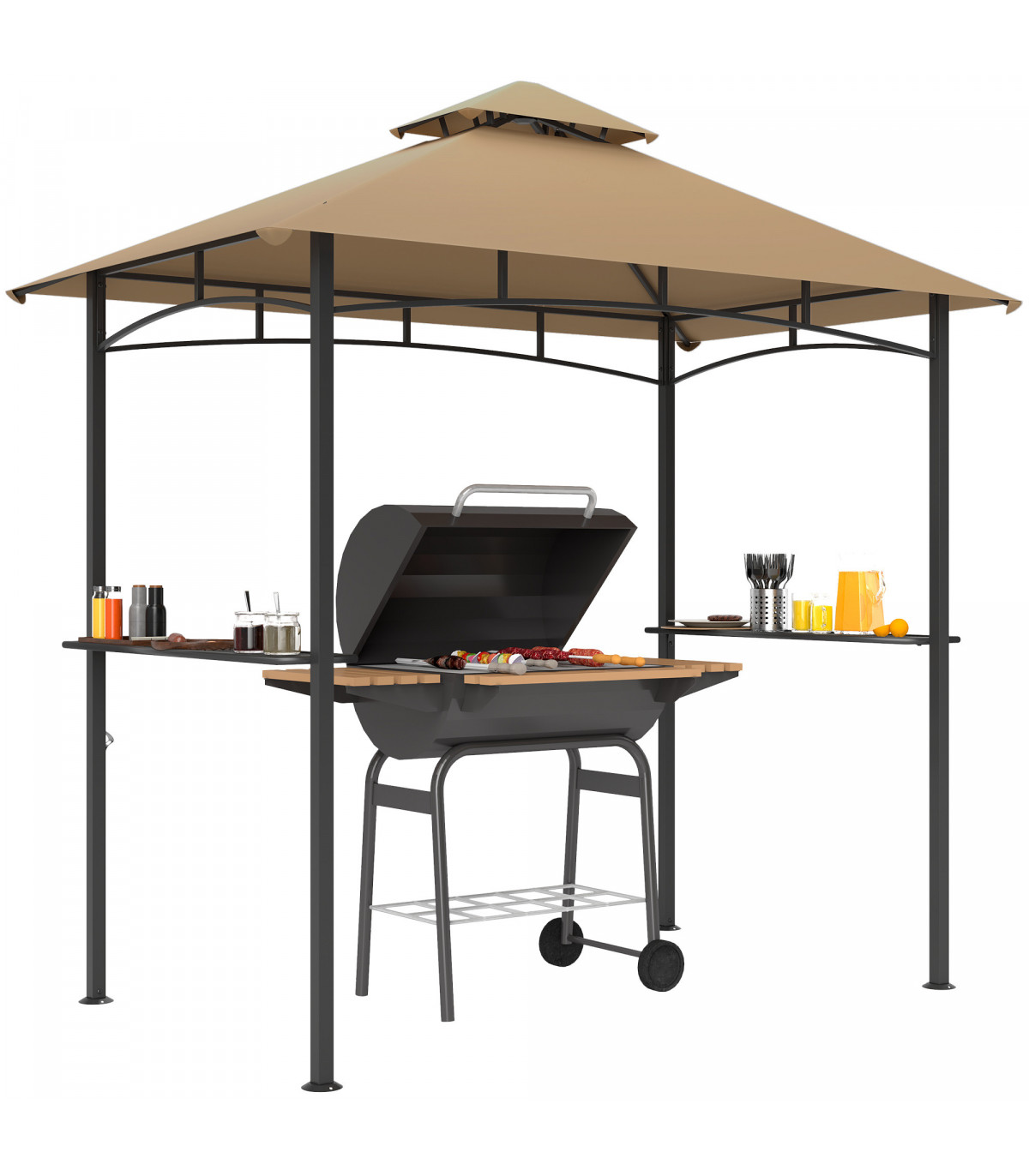 ● Two side shelves to hold food, cooking tools, drinks and more