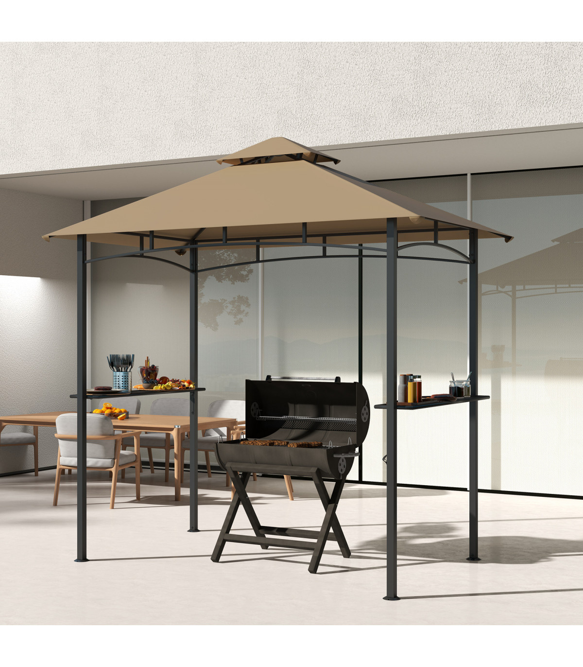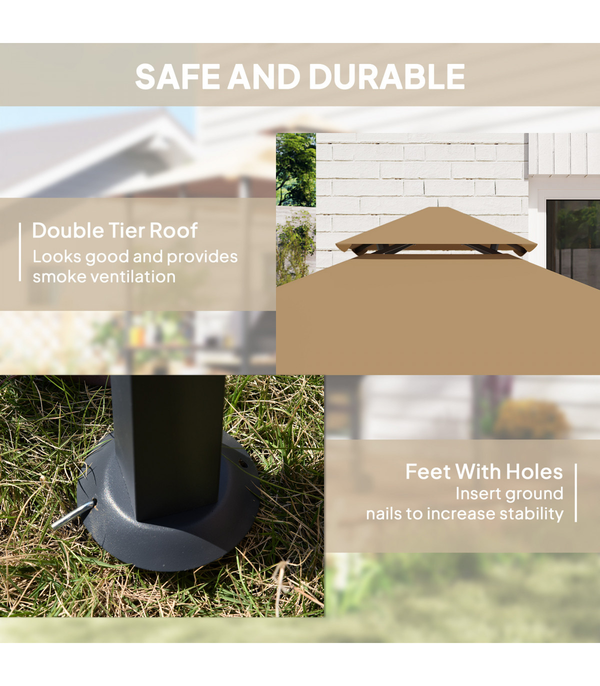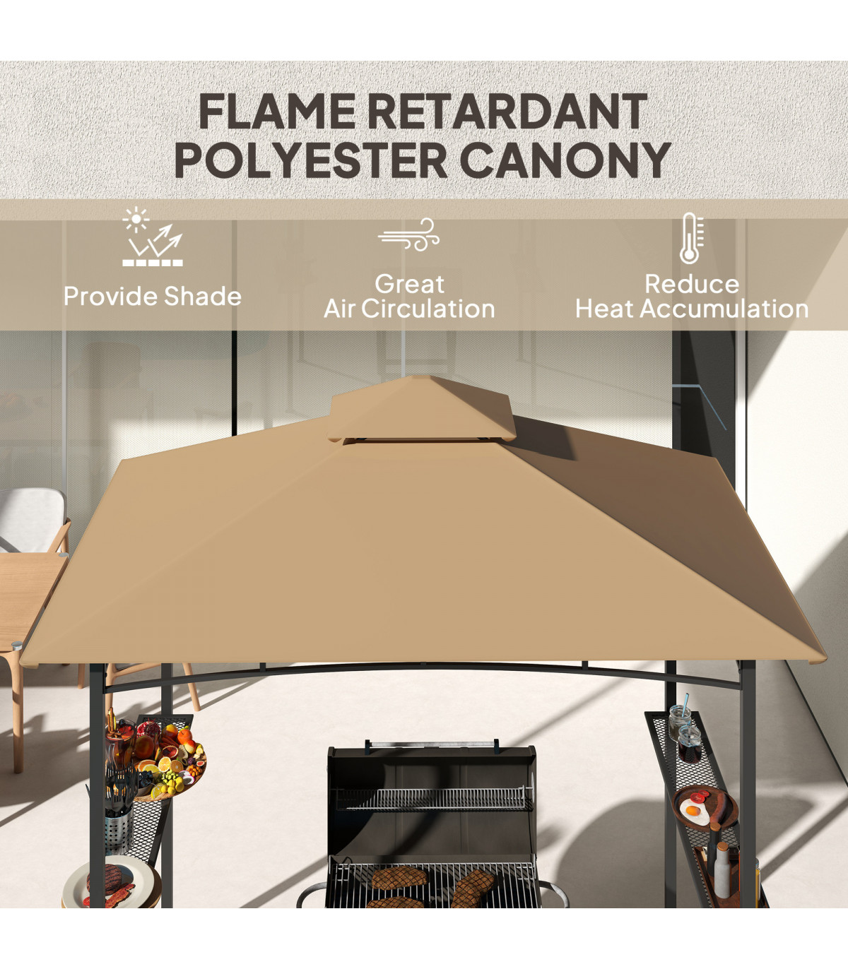 ● Double-tier polyester roof allows air and smoke out