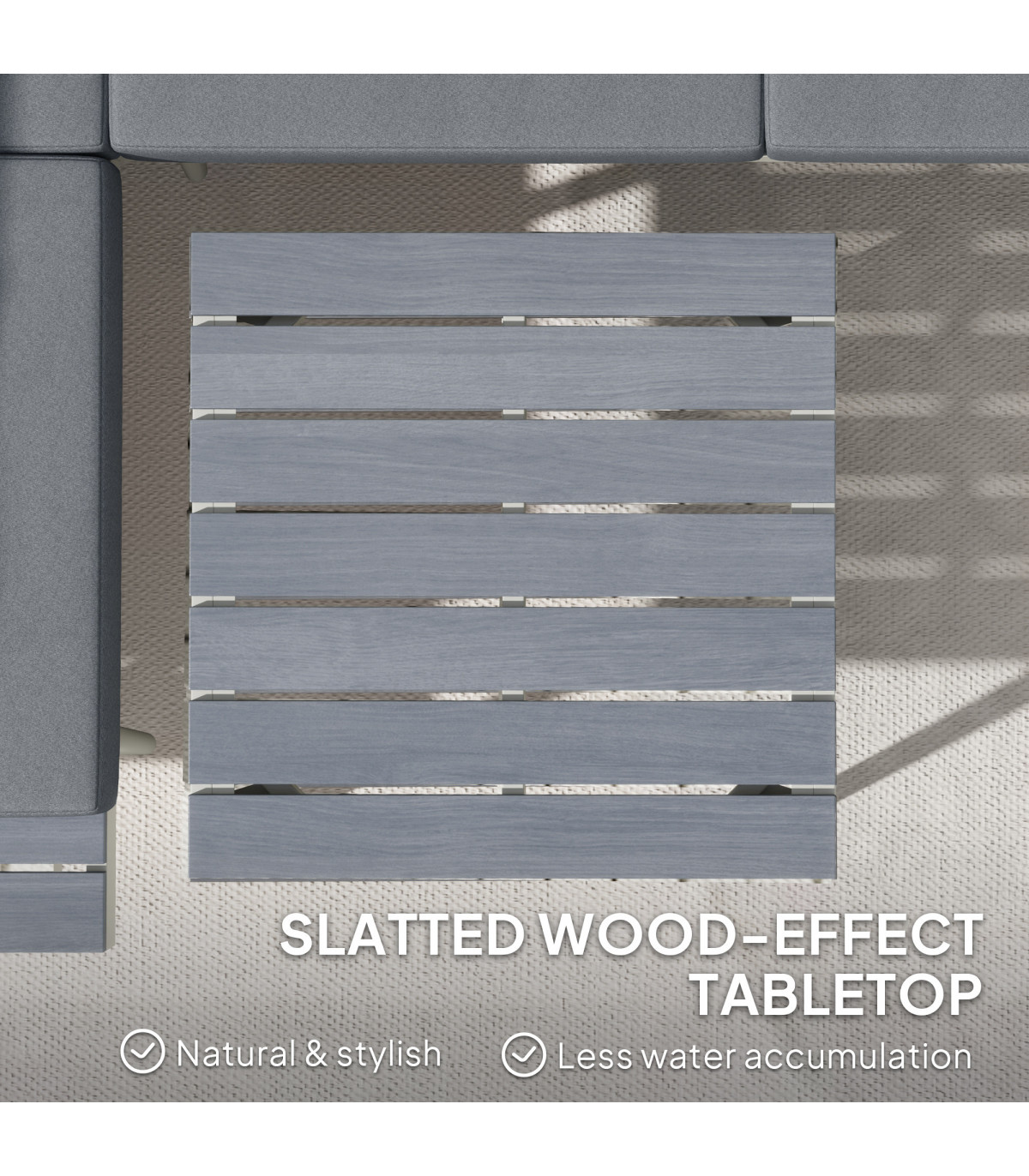 ● Slatted wood-effect tabletop and side trays add style and functionality