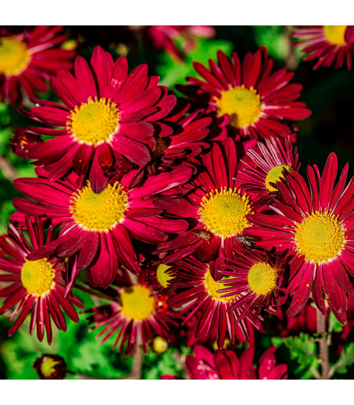 ✓ Daisy like flowers above bright green, ferny foliage