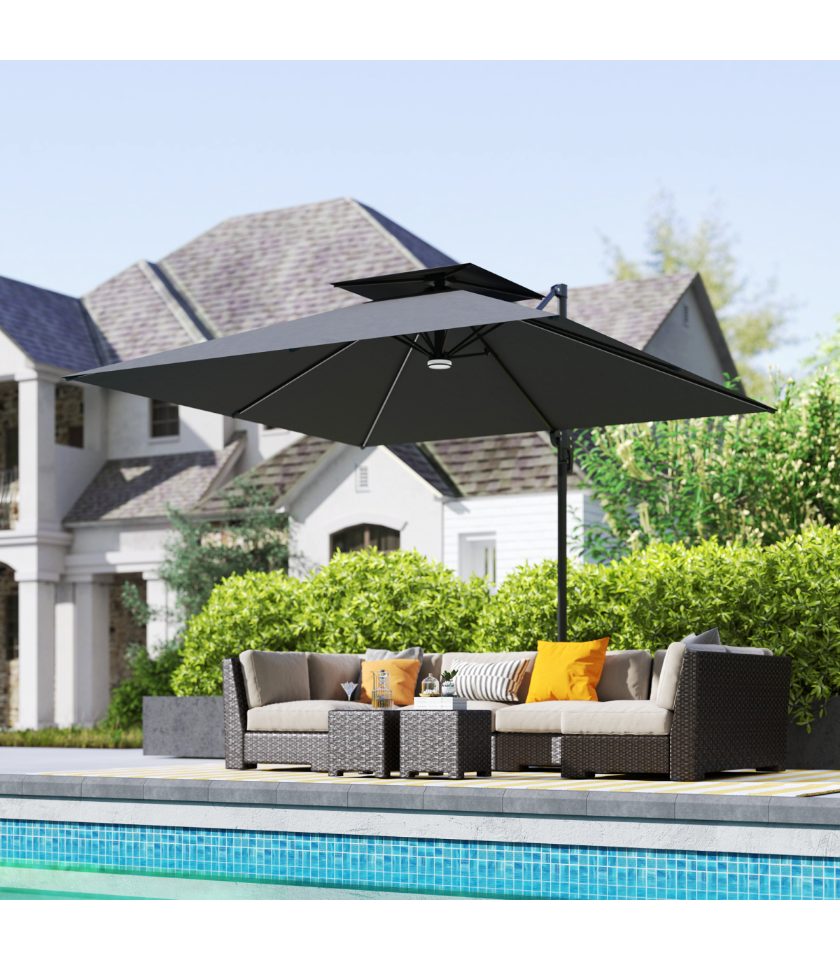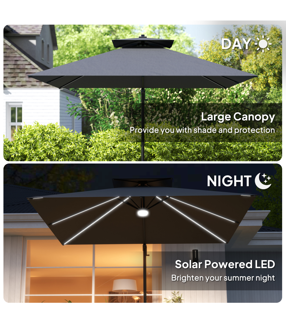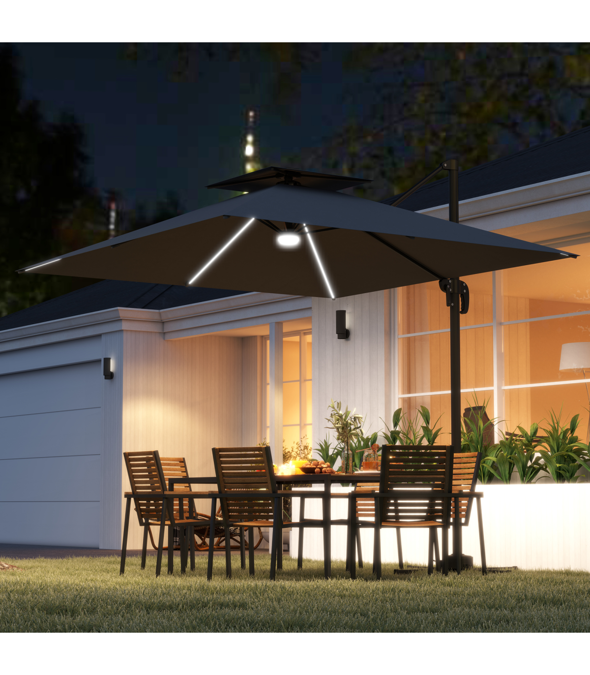 - • Solar panel and LED beads brighten evenings under the umbrella