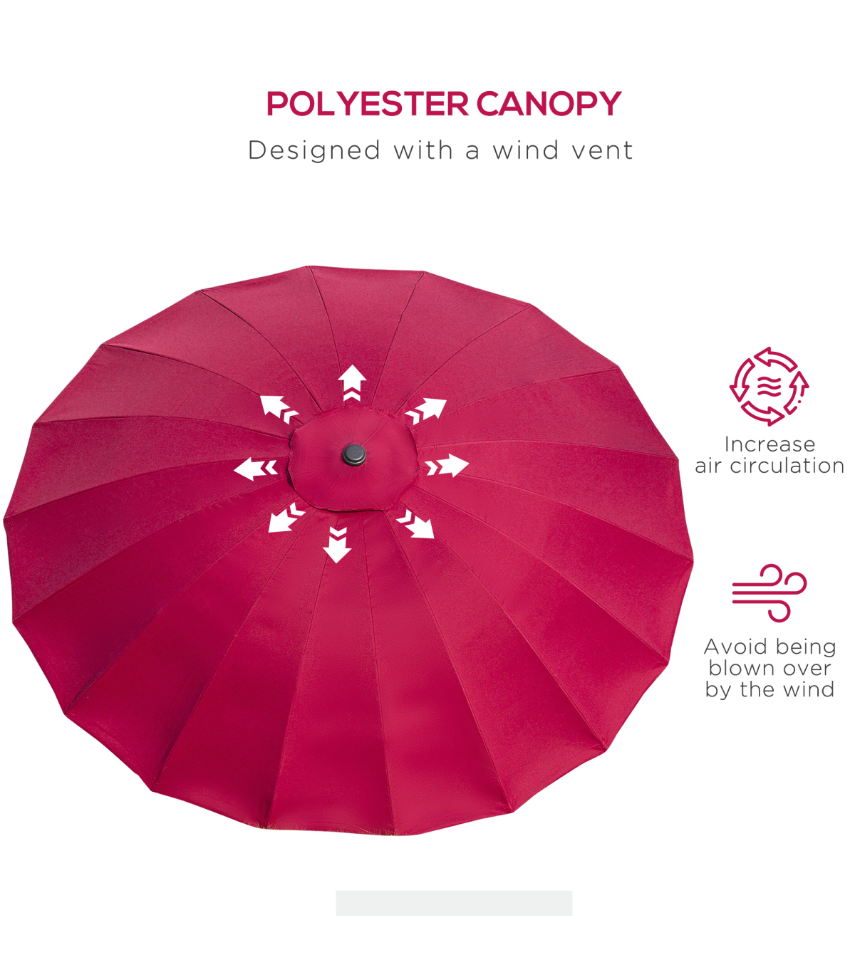 - • Vent on canopy top for better airflow, helps reduce any wind from lifting the parasol up