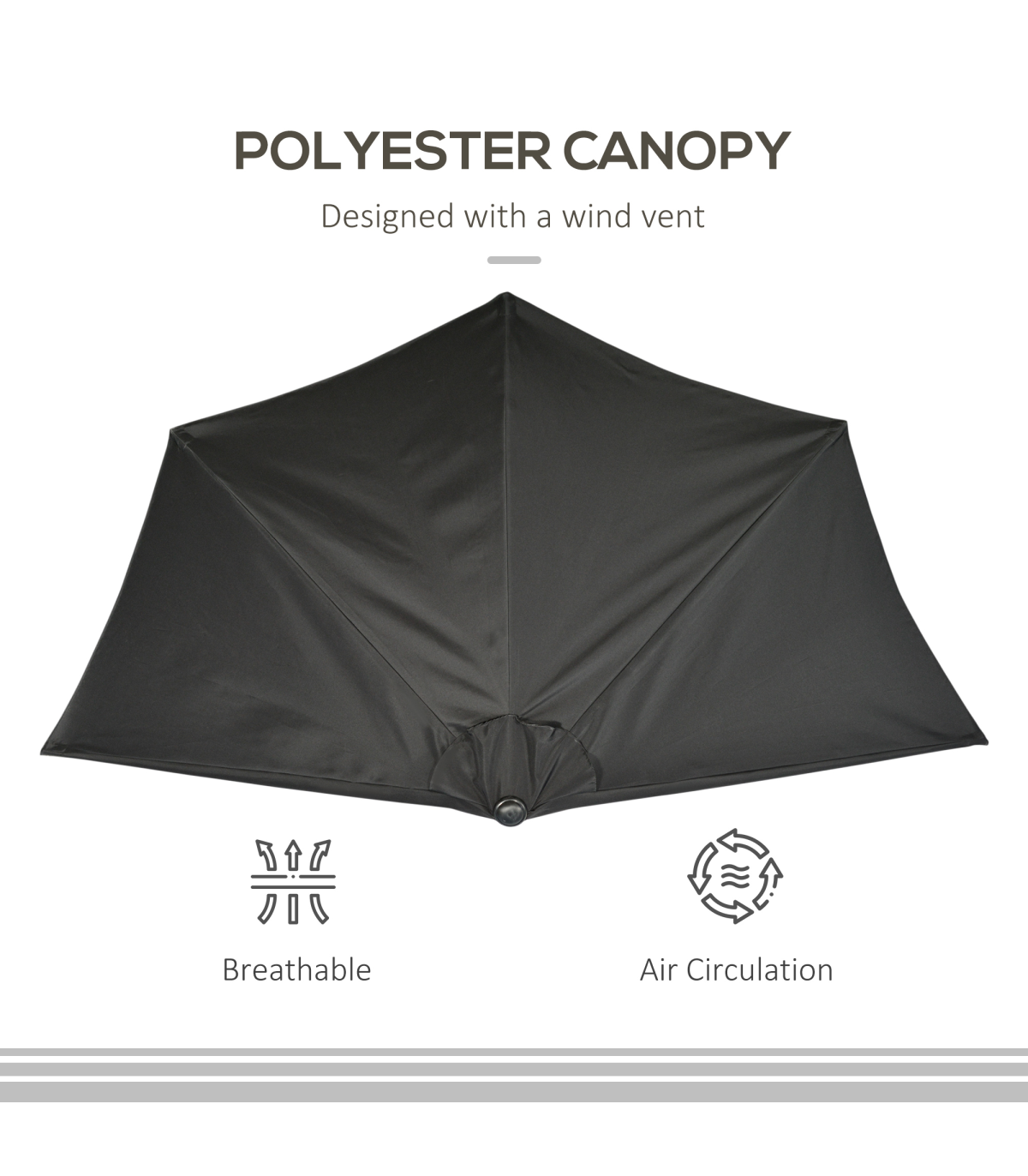 - • Diameter: 9ft, 5 firm ribs construction. 4.5ft from wall to umbrella tip