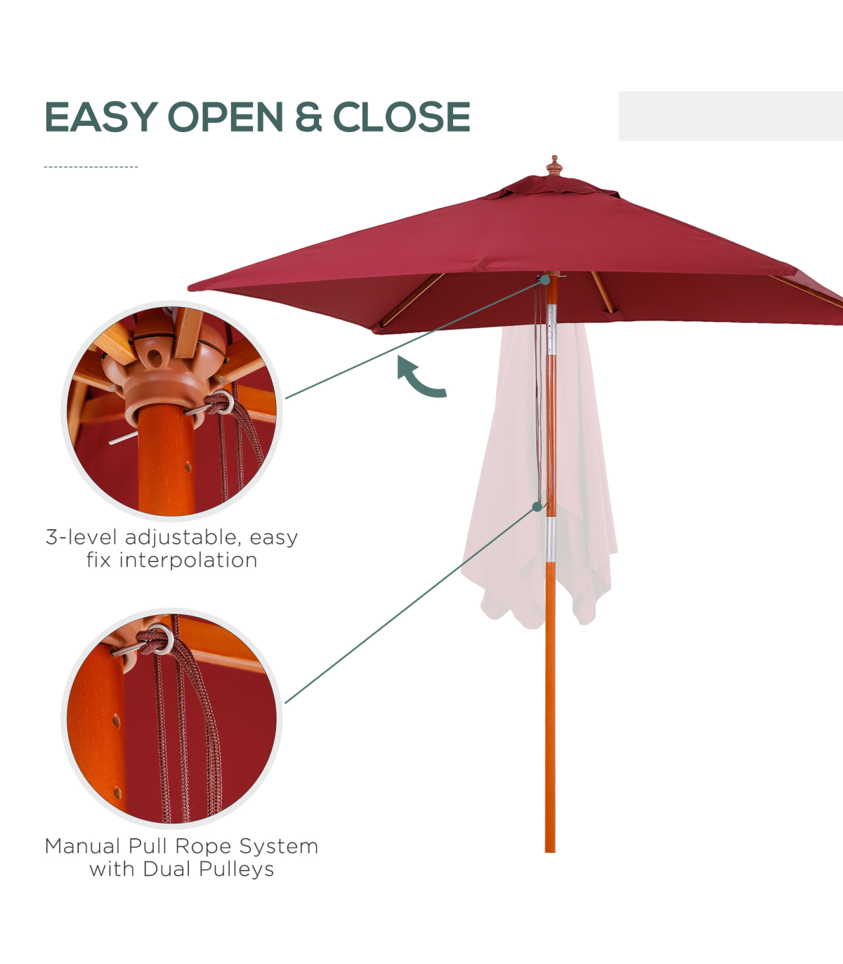 - • Pull rope with double pulley for easy and convenient opening and closing