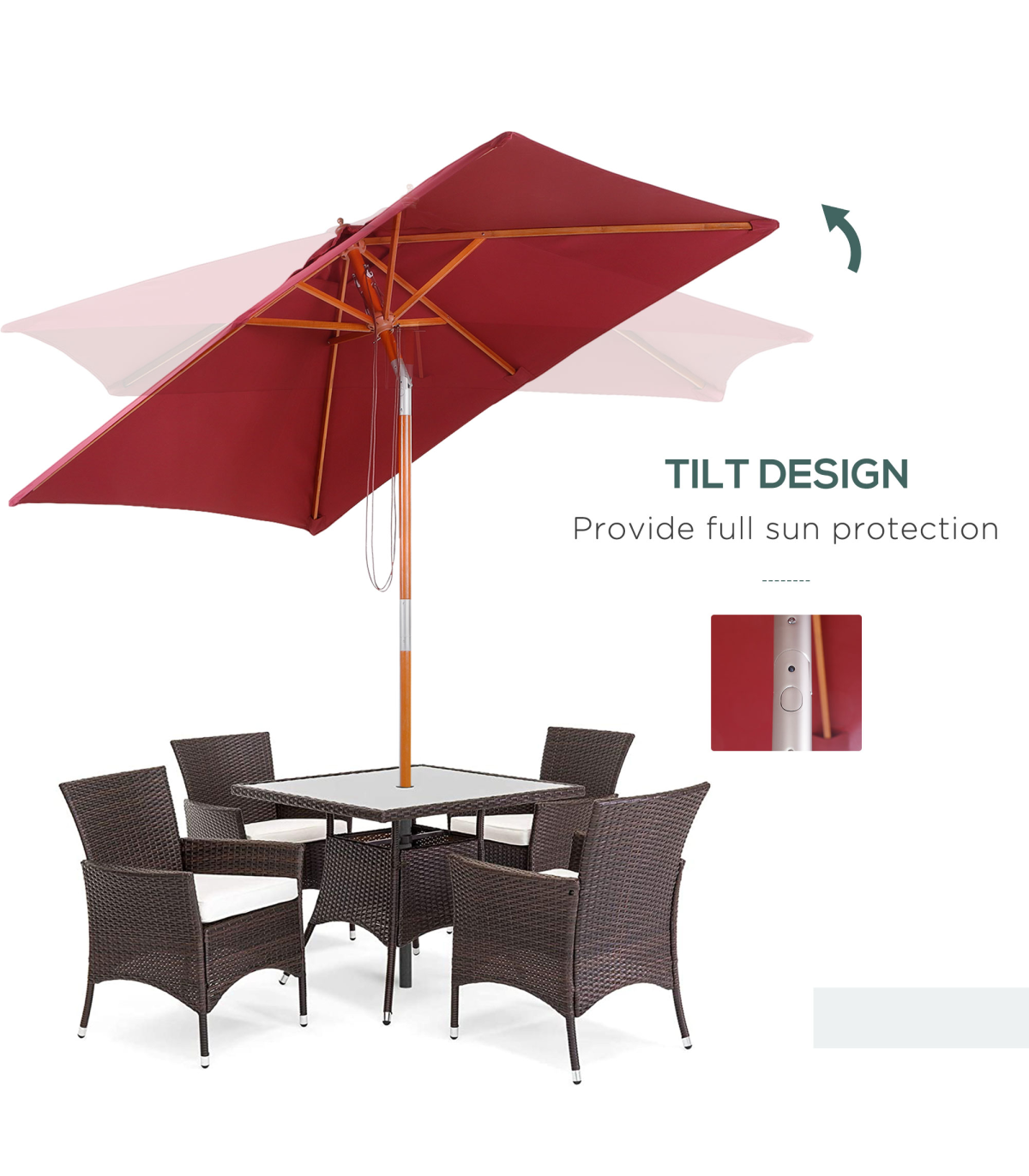 - • Tilt system with push button for more desired angles of outdoor patio umbrella shading