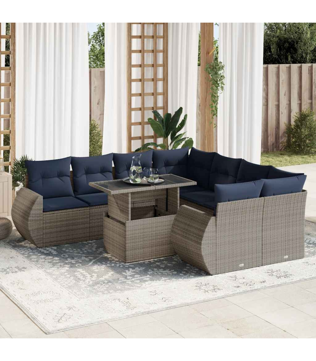 This garden sofa set is the perfect addition to your backyard, terrace, or patio, providing a comfortable and inviting space for chatting with family and friends or simply relaxing and enjoying the outdoors.Durable material: PE rattan, also known as poly rattan, is a strong, low-maintenance synthetic material that looks like natural rattan. It's lightweight, easy to clean, and commonly used for outdoor furniture due to its durability and weather-resistant properties.Storage function with water-resistant bag: Each garden seat features storage space under the seat, complete with a water-resistant bag for storing cushions, toys, and other items. The inner bags have a top cover and can be securely fastened to the seats with hook-and-loop fasteners for added stability.Convenient side table: This outdoor furniture features a foldable side table with a gas spring, providing a convenient spot to keep your essentials within easy reach.Removable and washable cover: These seat cushions feature removable covers for easy washing and maintenance.Modular design: This outdoor furniture set has a modular design, making it completely flexible and easy to move around, so you can create a customised outdoor furniture arrangement.Good to know:To make sure your outdoor furniture stays beautiful, we recommend protecting it with a waterproof cover.