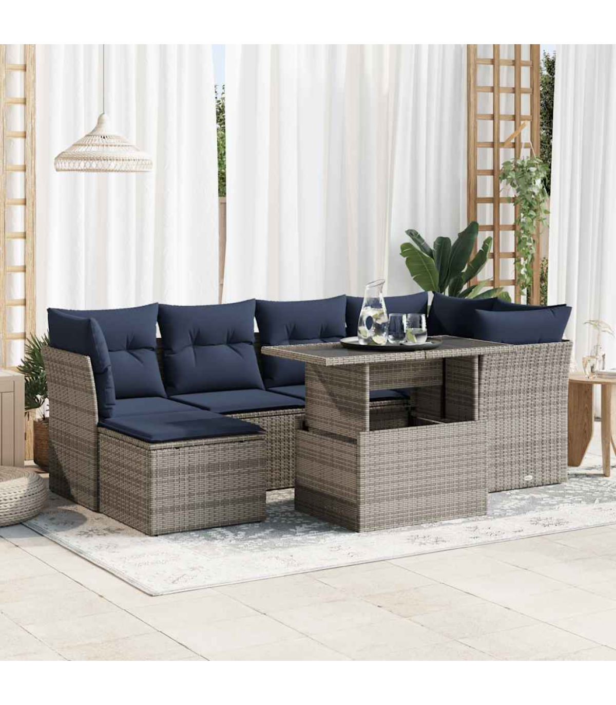 This garden sofa set is the perfect addition to your backyard, terrace, or patio, providing a comfortable and inviting space for chatting with family and friends or simply relaxing and enjoying the outdoors.Durable material: PE rattan, also known as poly rattan, is a strong, low-maintenance synthetic material that looks like natural rattan. It's lightweight, easy to clean, and commonly used for outdoor furniture due to its durability and weather-resistant properties.Storage function with water-resistant bag: Each garden seat features storage space under the seat, complete with a water-resistant bag for storing cushions, toys, and other items. The inner bags have a top cover and can be securely fastened to the seats with hook-and-loop fasteners for added stability.Removable and washable cover: These seat cushions feature removable covers for easy washing and maintenance.Modular design: This outdoor furniture set has a modular design, making it completely flexible and easy to move around, so you can create a customised outdoor furniture arrangement.Good to know:To make sure your outdoor furniture stays beautiful, we recommend protecting it with a waterproof cover.