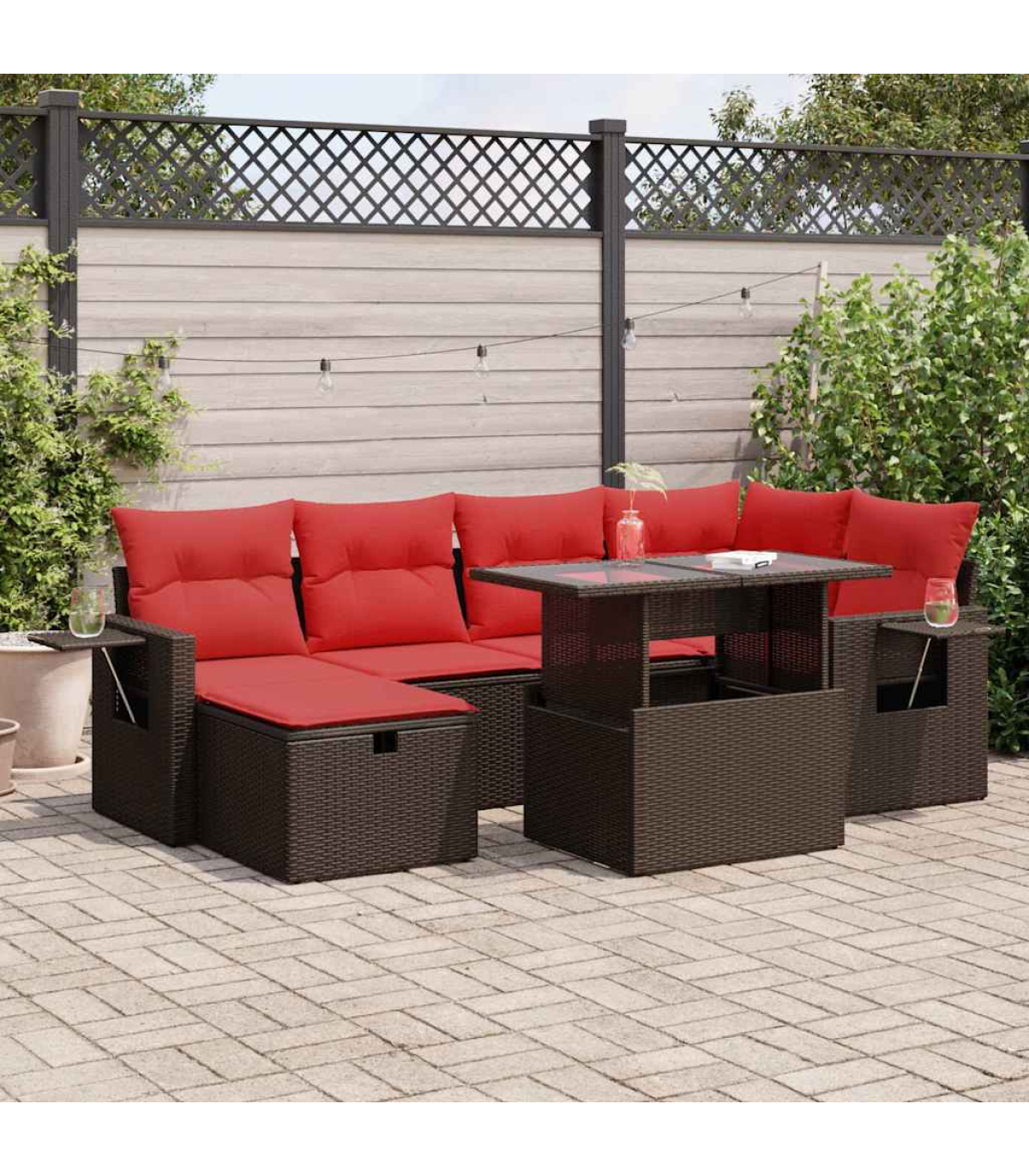 This garden sofa set is the perfect addition to your backyard, terrace, or patio, providing a comfortable and inviting space for chatting with family and friends or simply relaxing and enjoying the outdoors.Durable material: PE rattan, also known as poly rattan, is a strong, low-maintenance synthetic material that looks like natural rattan. It's lightweight, easy to clean, and commonly used for outdoor furniture due to its durability and weather-resistant properties.Storage function with water-resistant bag: Each garden seat features storage space under the seat, complete with a water-resistant bag for storing cushions, toys, and other items. The inner bags have a top cover and can be securely fastened to the seats with hook-and-loop fasteners for added stability.Convenient side table: This outdoor furniture features a foldable side table with a gas spring, providing a convenient spot to keep your essentials within easy reach.Removable and washable cover: These seat cushions feature removable covers for easy washing and maintenance.Modular design: This outdoor furniture set has a modular design, making it completely flexible and easy to move around, so you can create a customised outdoor furniture arrangement.Good to know:To make sure your outdoor furniture stays beautiful, we recommend protecting it with a waterproof cover.