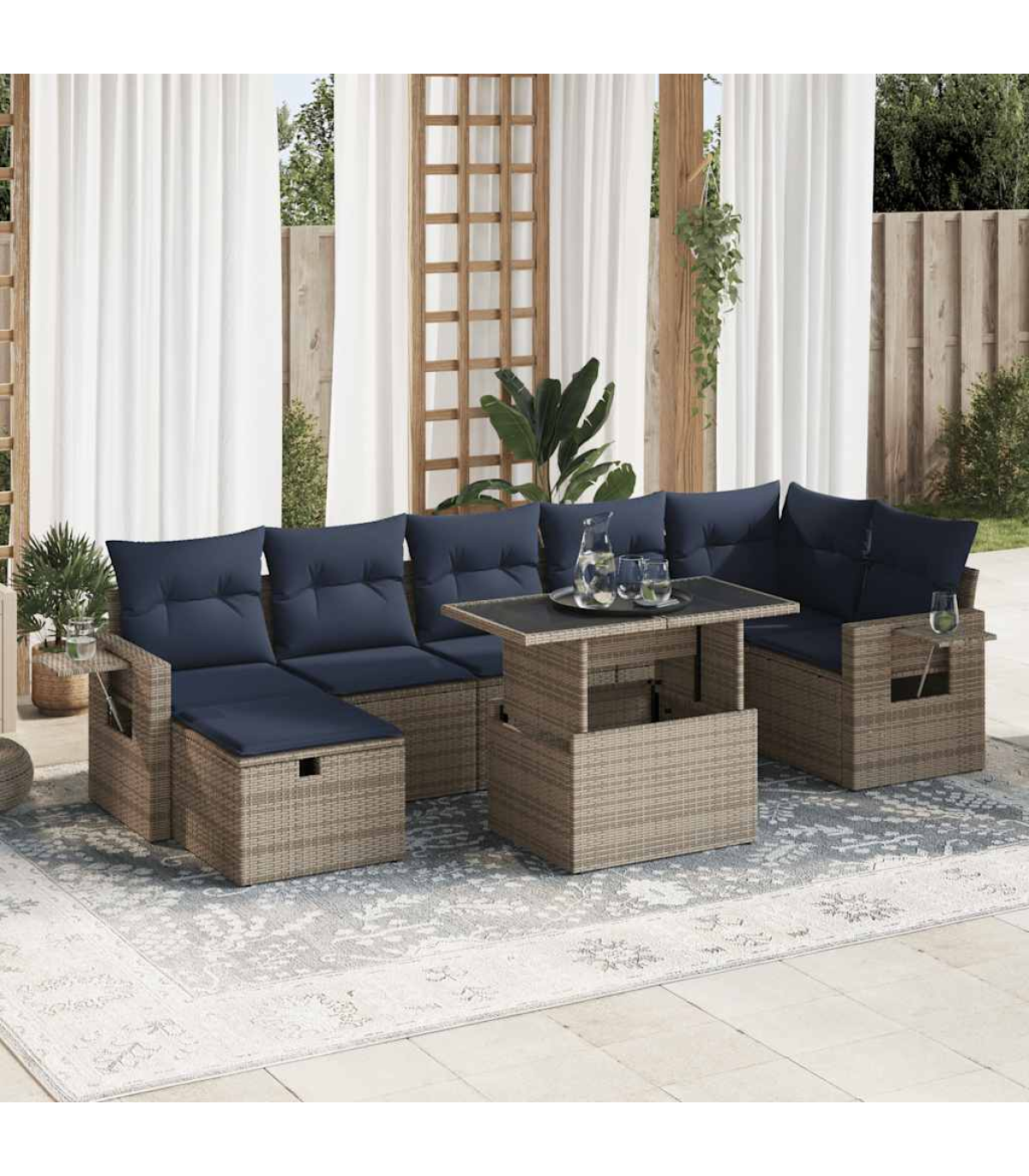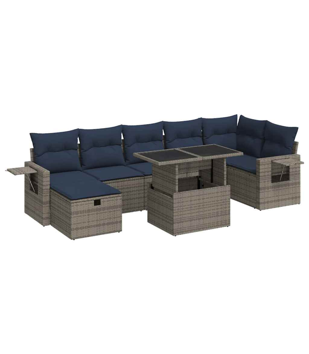 This garden sofa set is the perfect addition to your backyard, terrace, or patio, providing a comfortable and inviting space for chatting with family and friends or simply relaxing and enjoying the outdoors.Durable material: PE rattan, also known as poly rattan, is a strong, low-maintenance synthetic material that looks like natural rattan. It's lightweight, easy to clean, and commonly used for outdoor furniture due to its durability and weather-resistant properties.Storage function with water-resistant bag: Each garden seat features storage space under the seat, complete with a water-resistant bag for storing cushions, toys, and other items. The inner bags have a top cover and can be securely fastened to the seats with hook-and-loop fasteners for added stability.Convenient side table: This outdoor furniture features a foldable side table with a gas spring, providing a convenient spot to keep your essentials within easy reach.Removable and washable cover: These seat cushions feature removable covers for easy washing and maintenance.Modular design: This outdoor furniture set has a modular design, making it completely flexible and easy to move around, so you can create a customised outdoor furniture arrangement.Good to know:To make sure your outdoor furniture stays beautiful, we recommend protecting it with a waterproof cover.