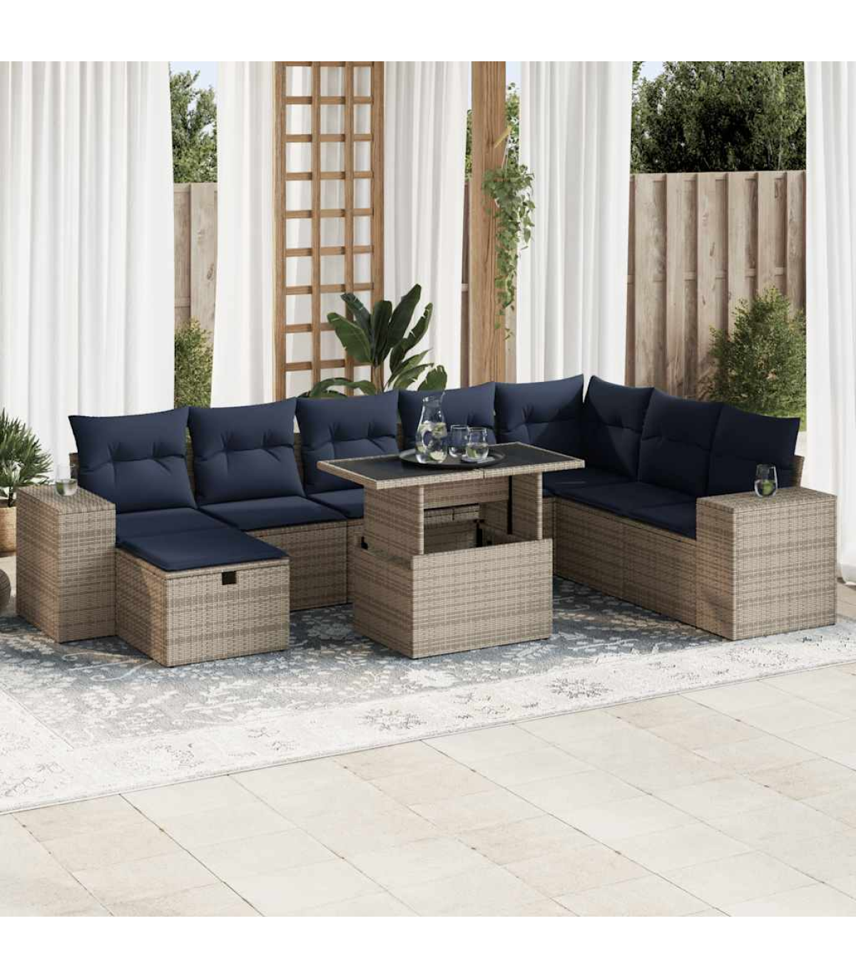 This garden sofa set is the perfect addition to your backyard, terrace, or patio, providing a comfortable and inviting space for chatting with family and friends or simply relaxing and enjoying the outdoors.Durable material: PE rattan, also known as poly rattan, is a strong, low-maintenance synthetic material that looks like natural rattan. It's lightweight, easy to clean, and commonly used for outdoor furniture due to its durability and weather-resistant properties.Storage function with water-resistant bag: Each garden seat features storage space under the seat, complete with a water-resistant bag for storing cushions, toys, and other items. The inner bags have a top cover and can be securely fastened to the seats with hook-and-loop fasteners for added stability.Removable and washable cover: These seat cushions feature removable covers for easy washing and maintenance.Modular design: This outdoor furniture set has a modular design, making it completely flexible and easy to move around, so you can create a customised outdoor furniture arrangement.Good to know:To make sure your outdoor furniture stays beautiful, we recommend protecting it with a waterproof cover.