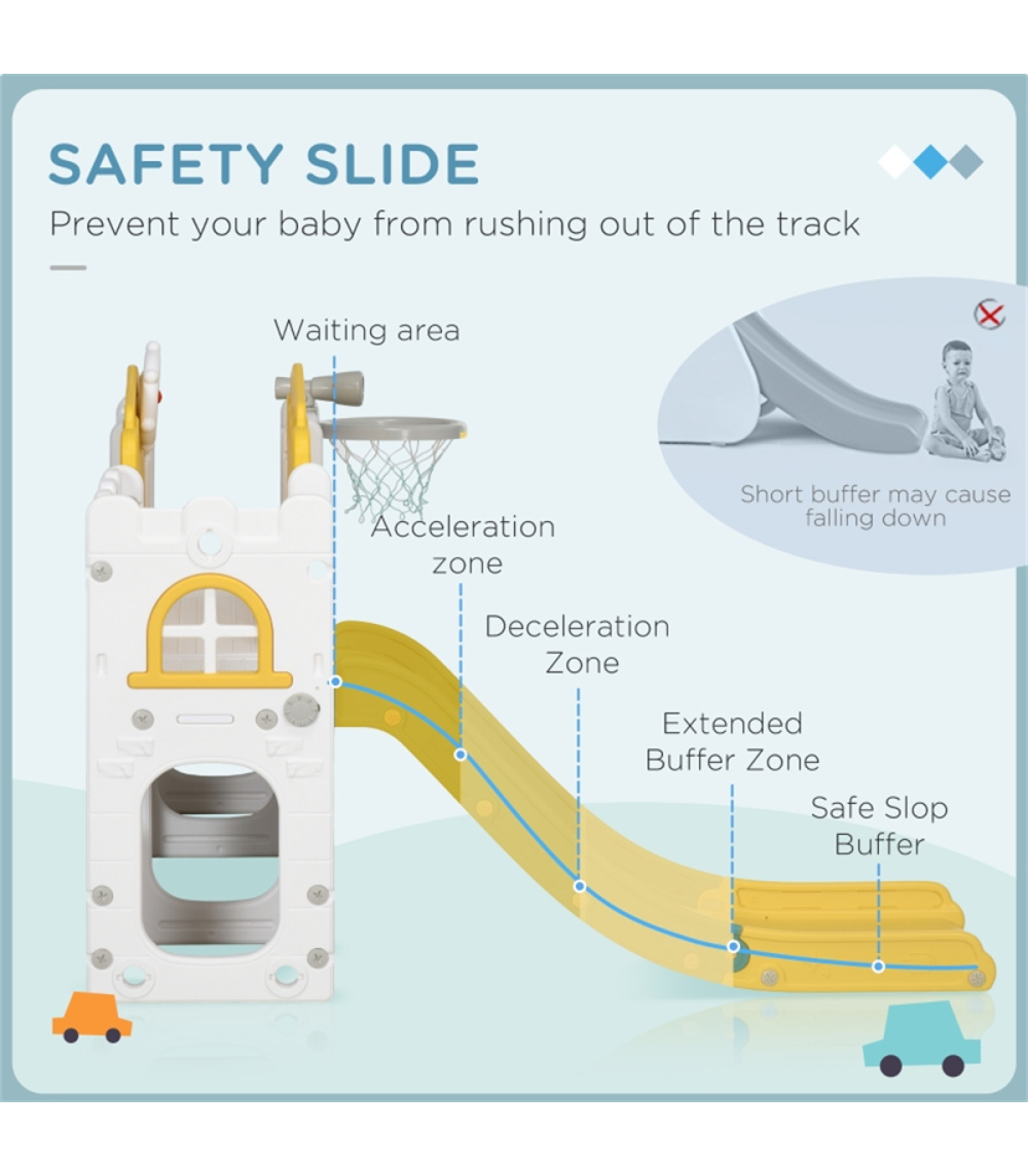 - - The slide's acceleration and deceleration zones create safe speeds, and the buffer zone minimizes potential impacts
