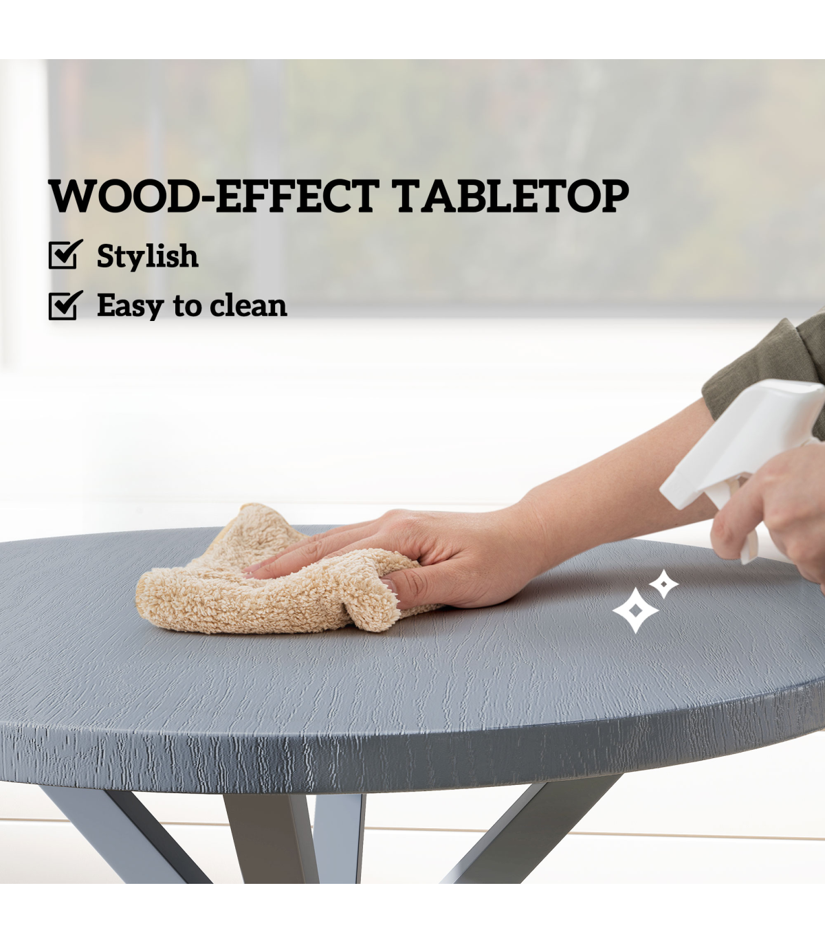 ● Imitation wood-effect top offers a sleek minimalist look