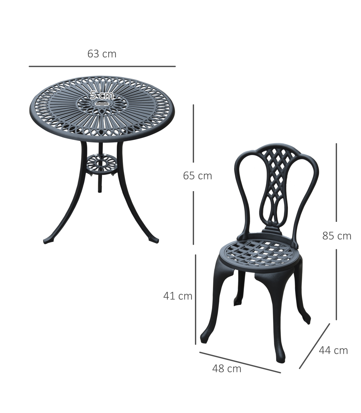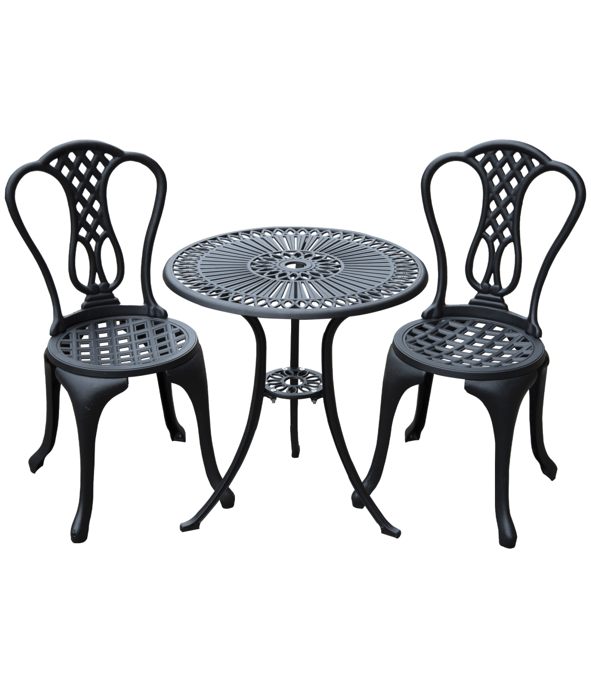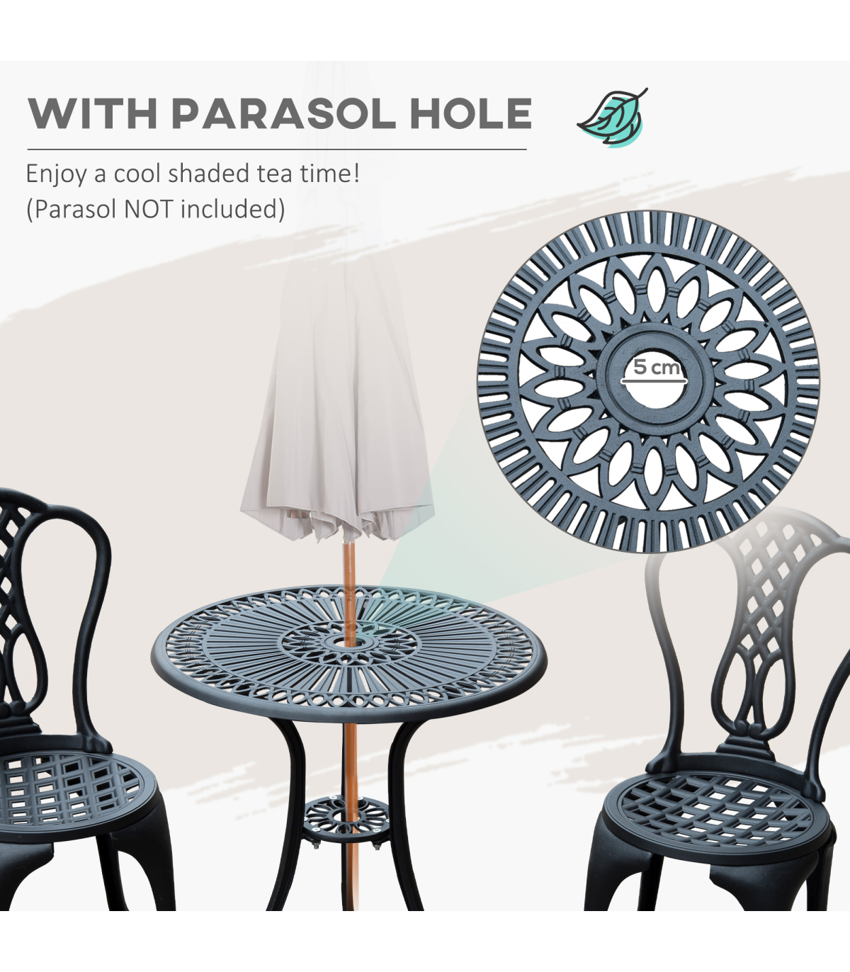- This set comprises of 2 chairs and a round matching table with a parasol hole