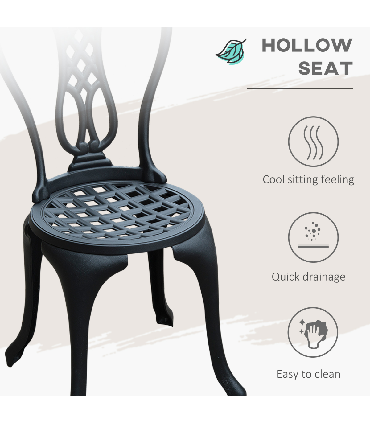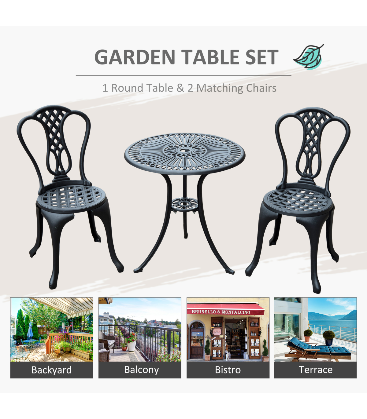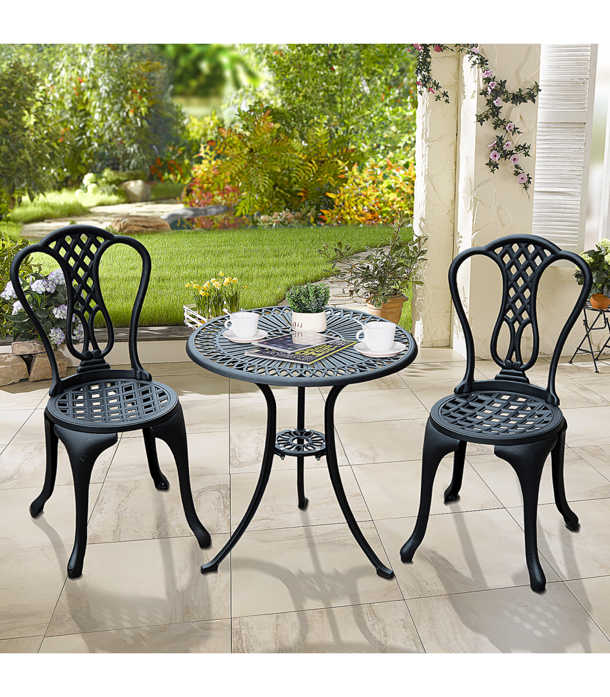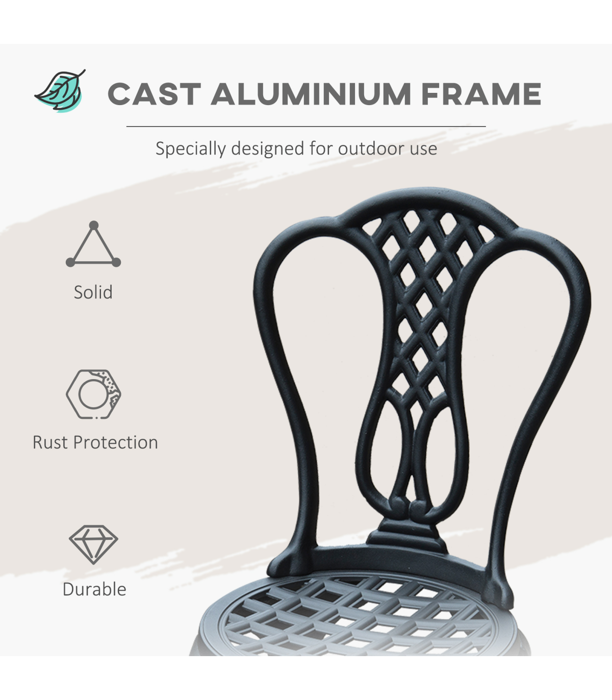 Add some continental elegance to your garden or patio with this stylish and classic bistro set. Including 2 chairs and a matching table, this set is perfect for dining or drinking in the fresh air. Hand crafted from solid cast aluminium and designed in an exceptional shabby chic style, it will enhance your outdoor experience and bring a style to your garden.