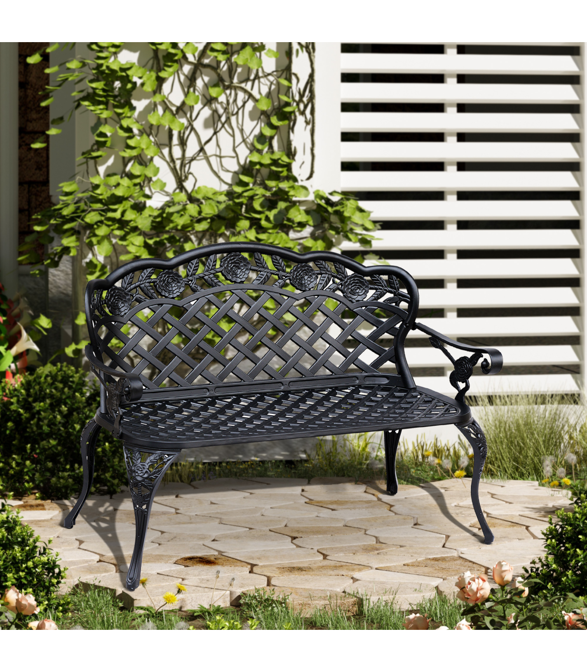 Garden Bench, Cast Aluminium, 107Lx58Wx85H cm-Black