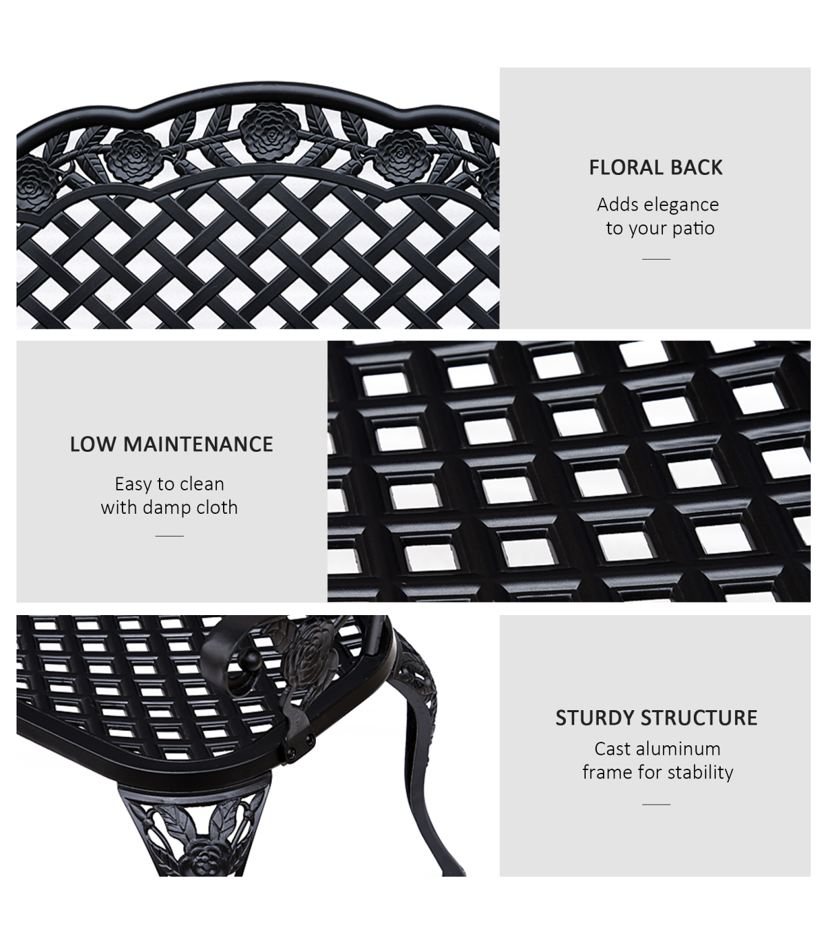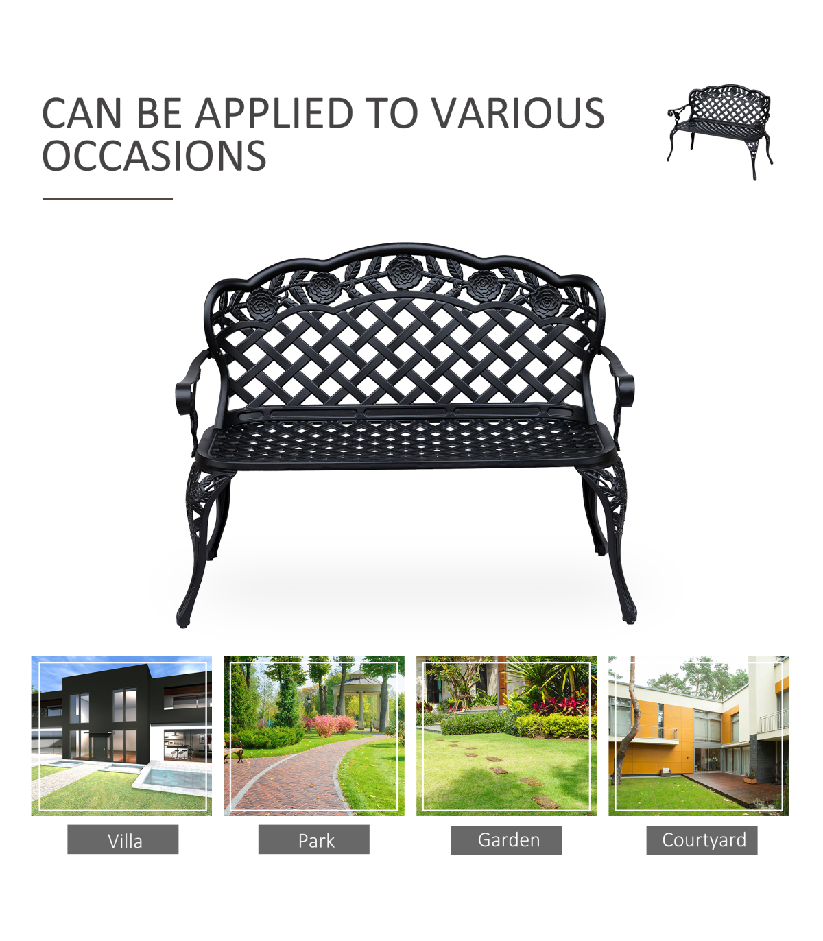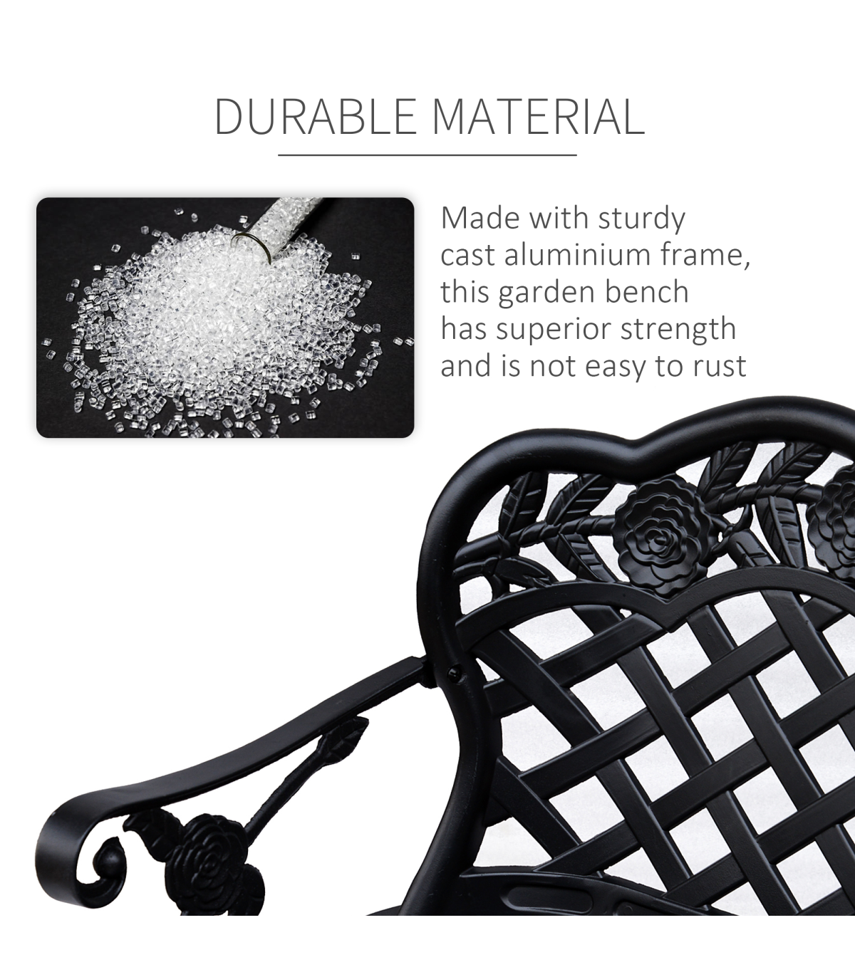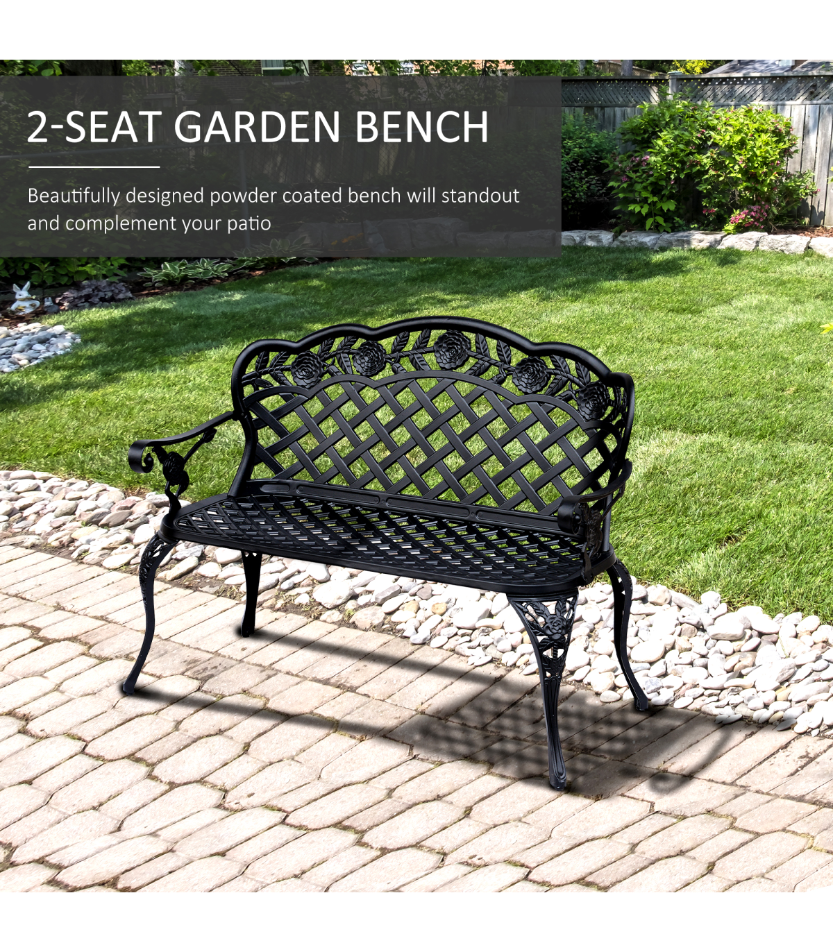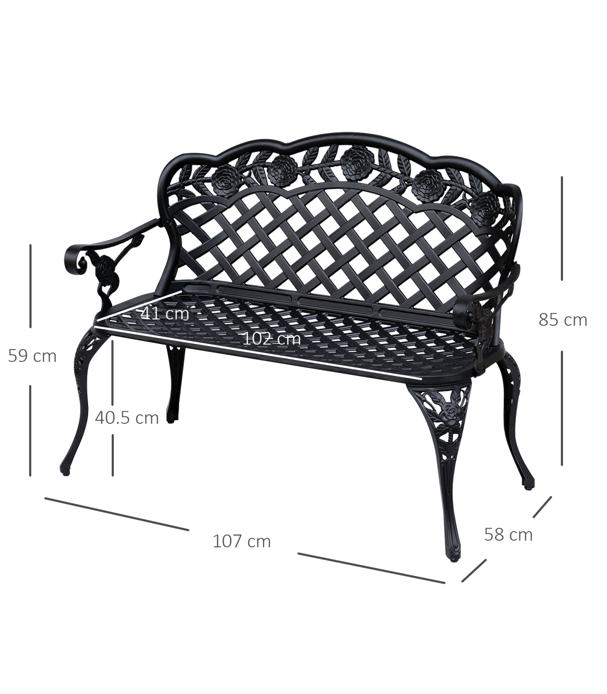 Garden Bench, Cast Aluminium, 107Lx58Wx85H cm - Black" Description: - Make your garden or path complete with an Outsunny antique style bench to sit and rest on while enjoying the great outdoors. - Made from cast aluminium, this bench is sturdy yet comfortable enough to relax on. - The seat is composed of cast aluminium to provide optimal support. - The black powder-coated aluminium color gives the bench an antique look that will fit perfectly with any outdoor décor and allow it to maintain its stylish look. - Add a touch of style to your backyard or garden with this beautiful Outsunny bench. Features: - Constructed with sturdy cast aluminium with backrest and seat. - Antique style allows it to complement any backyard or home. - The backrest's floral scroll back design will stand out and complement your outdoor décor. - Available armrests offer extra comfort when sitting on the bench. - Solid cast aluminium legs provide added stability and durability. - Assembly required.
