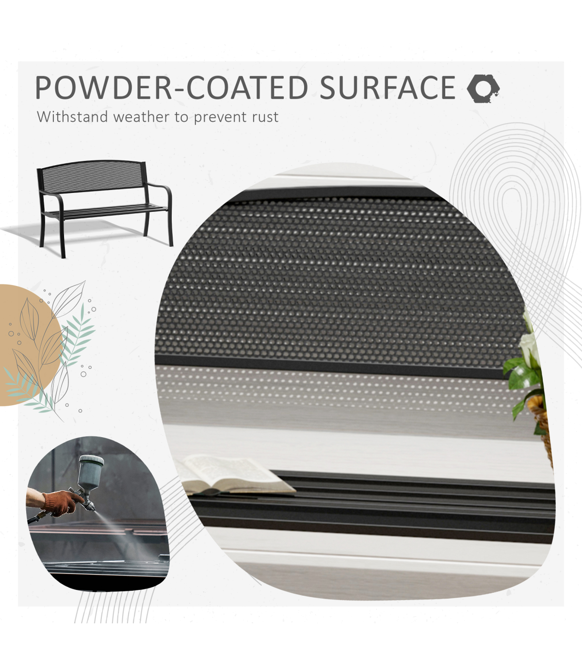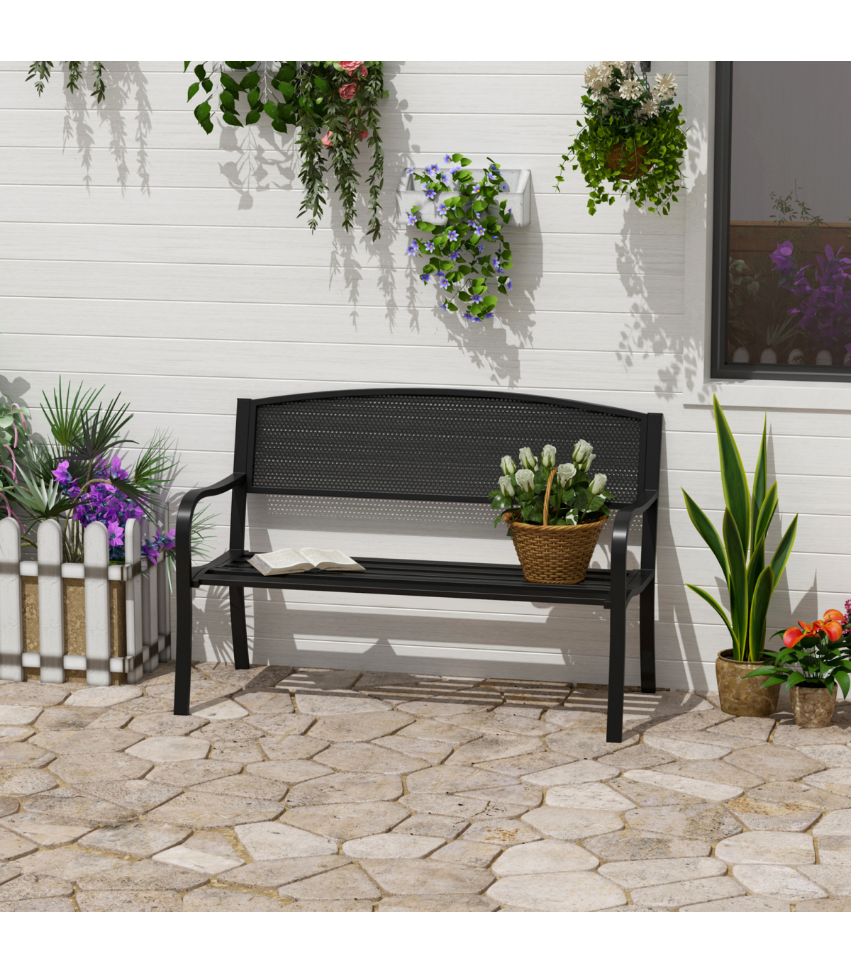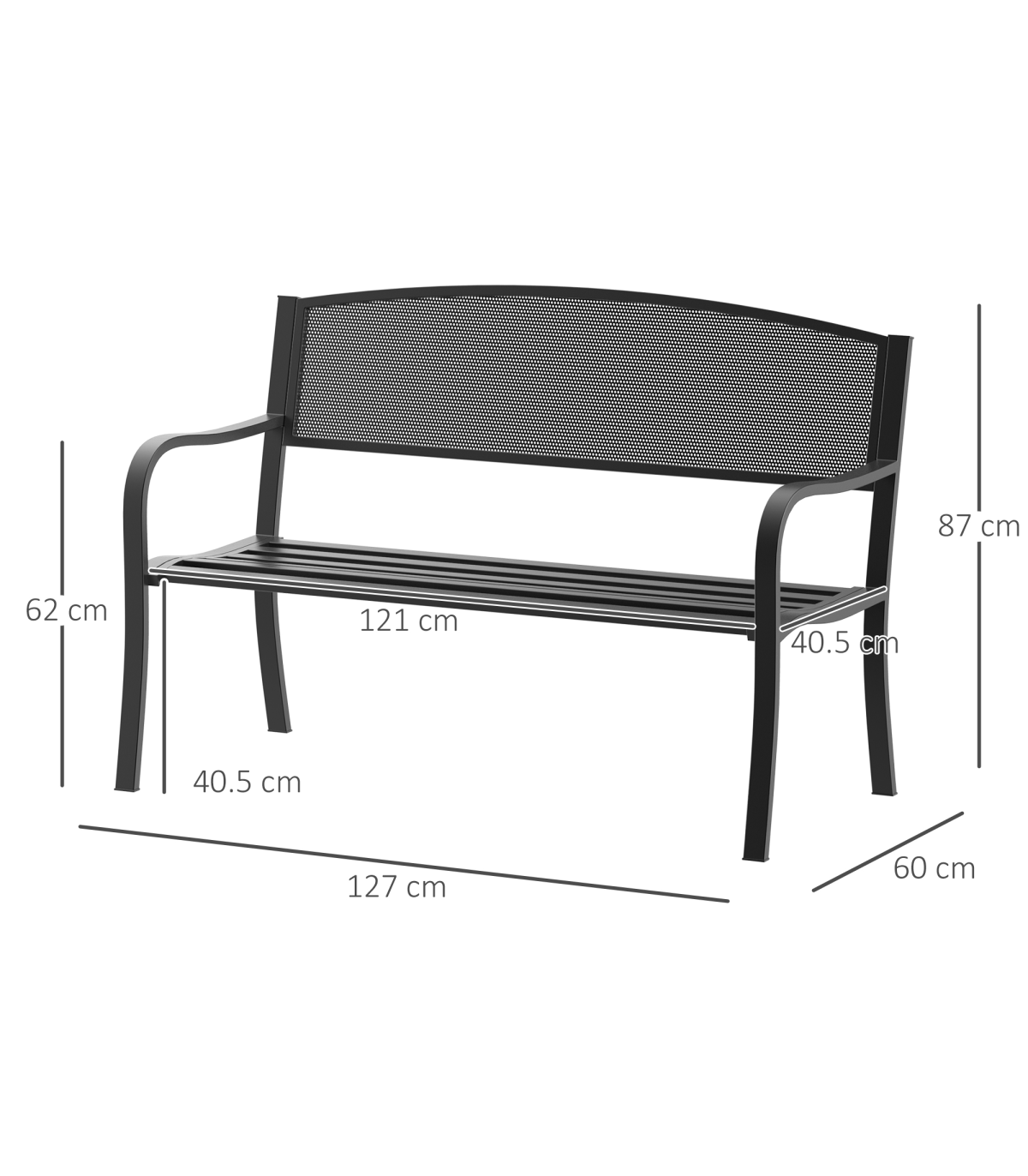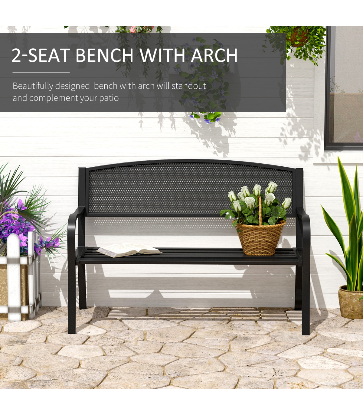 2 Person Garden Bench, Steel-Black Description: - The blooming garden bench from Outsunny is ideal for enjoying your favorite peaceful spot, along a path, under a tree, or among the flowers. - This product is constructed with a steel frame to ensure a durable patio garden bench for years to come. - Relax with friends or family members and enjoy the scenery of your front or backyard. - The tough steel construction and 120 cm length of this patio garden bench allows for 2 individuals to comfortably sit at once. Features: - Constructed with a sturdy steel frame with cast iron backrest and seat - Solid legs with anti-skidding foot pads provide safe places to sit and relax - Suitable for outdoor areas, parks, gardens, and more - Antique style allows it to complement any décor - Lightweight and portable for easy relocation - Ideal for 2 people at a time with a 120 cm length - Assembly required