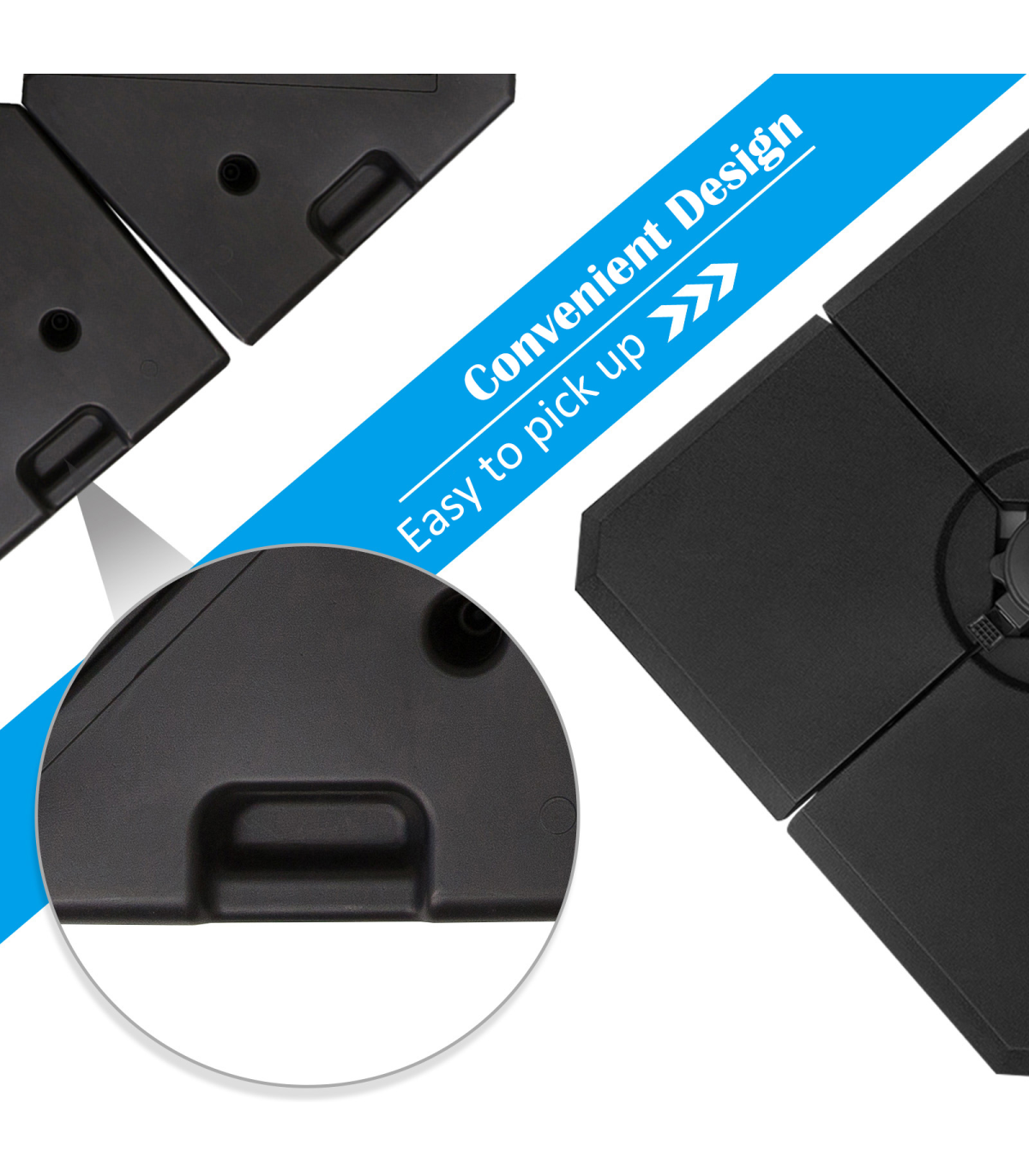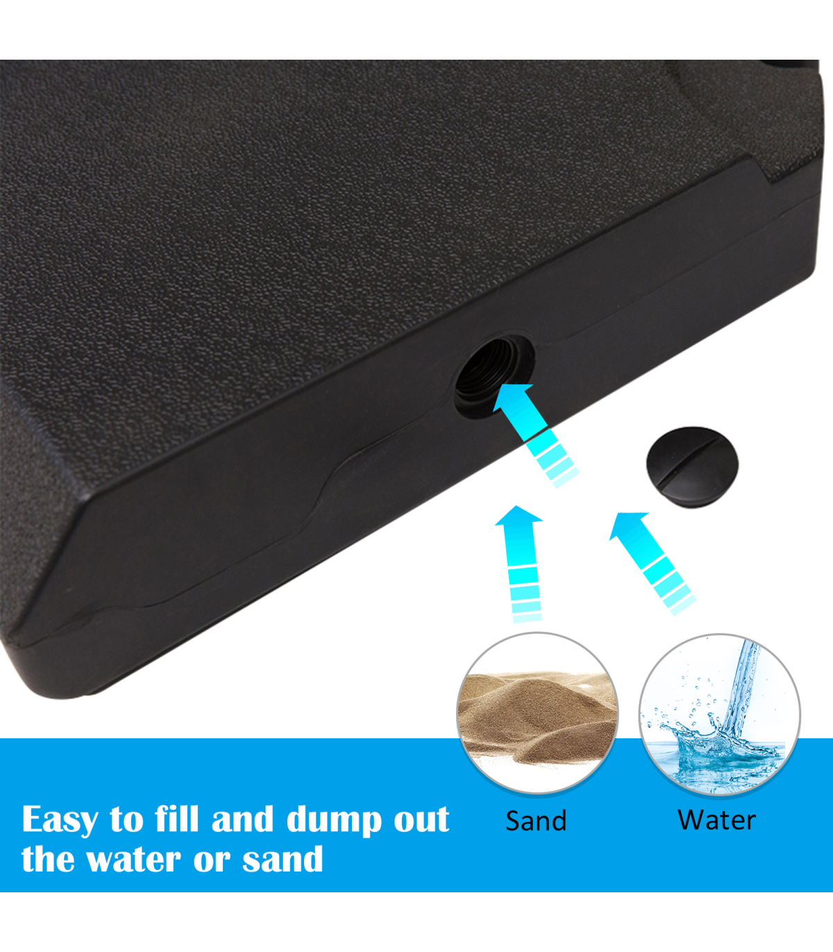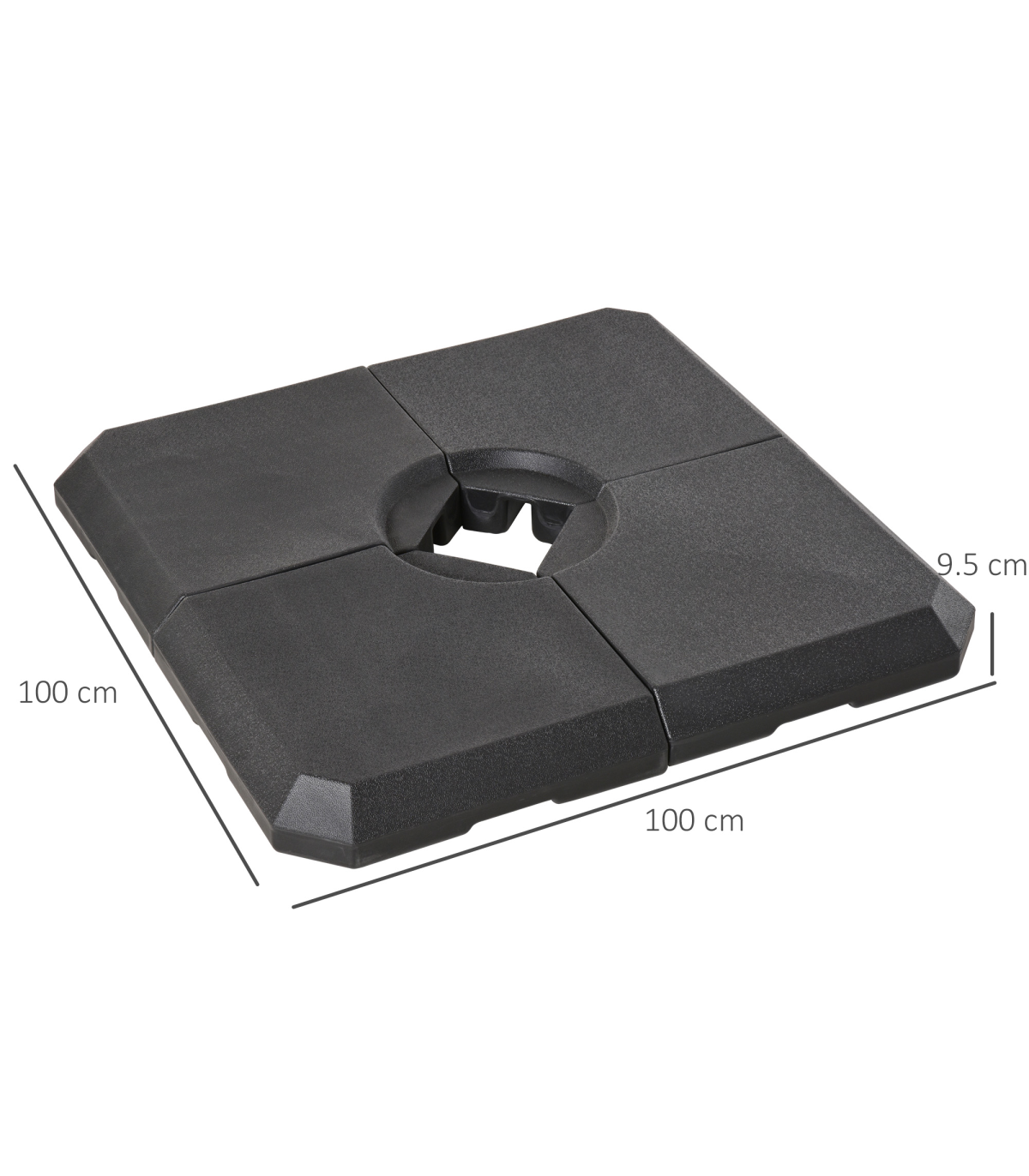 HD Polyethylene Sand or Water Fillable Parasol Base Black" Description: - Four-piece set, with all pieces slotting together on a cross base for parasols - Filling holes on each side, each piece fills to a maximum of 20kg water or 30kg - making it easy to store and carry when empty - Cross base features middle bar to slot the parasol pole into place and keep it upright - Thick plastic body is tough and durable, resistant to mild weathering and UV fading - Suitable for Cantilever and Roma parasols - Smooth surface can be wiped clean easily - Easy to assemble