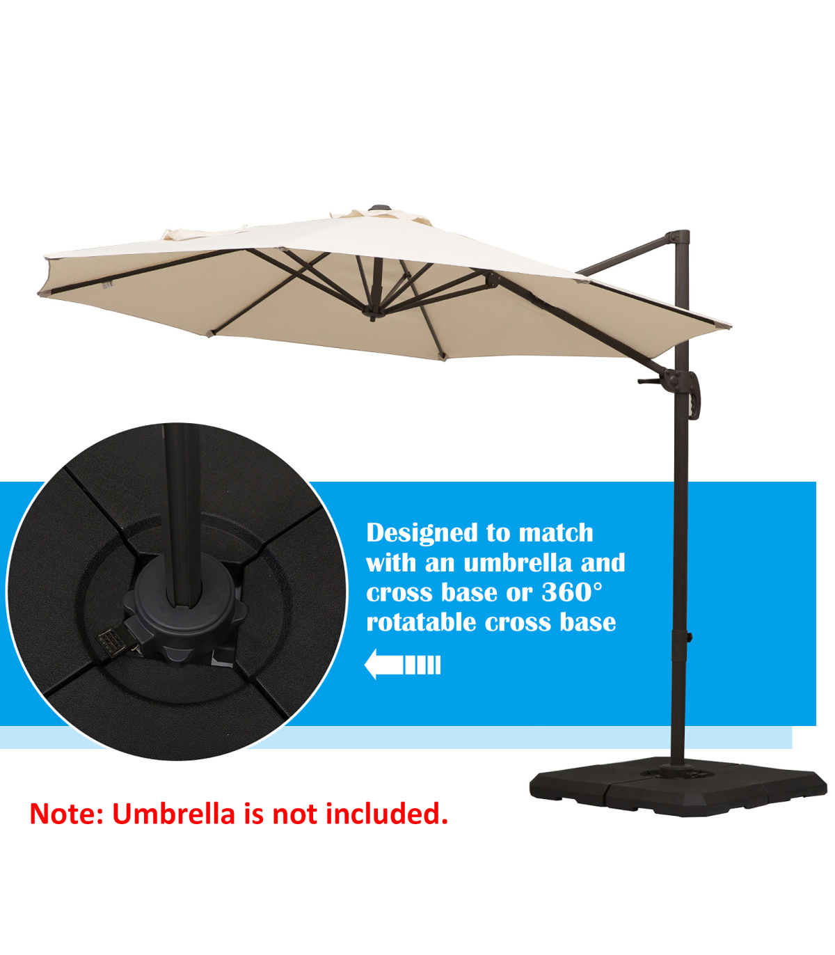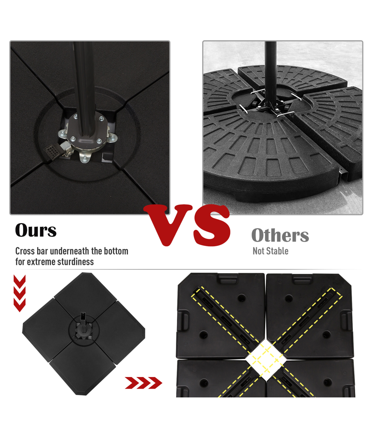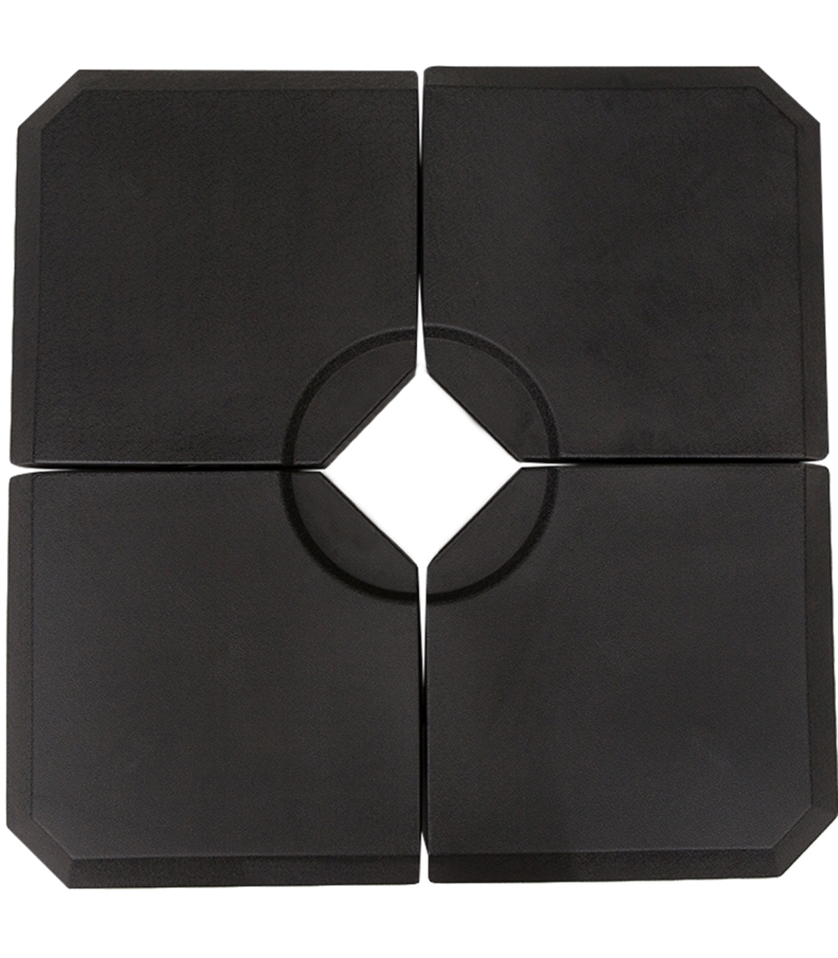 HD Polyethylene Sand or Water Fillable Parasol Base Black" Description: - Four-piece set, with all pieces slotting together on a cross base for parasols - Filling holes on each side, each piece fills to a maximum of 20kg water or 30kg - making it easy to store and carry when empty - Cross base features middle bar to slot the parasol pole into place and keep it upright - Thick plastic body is tough and durable, resistant to mild weathering and UV fading - Suitable for Cantilever and Roma parasols - Smooth surface can be wiped clean easily - Easy to assemble