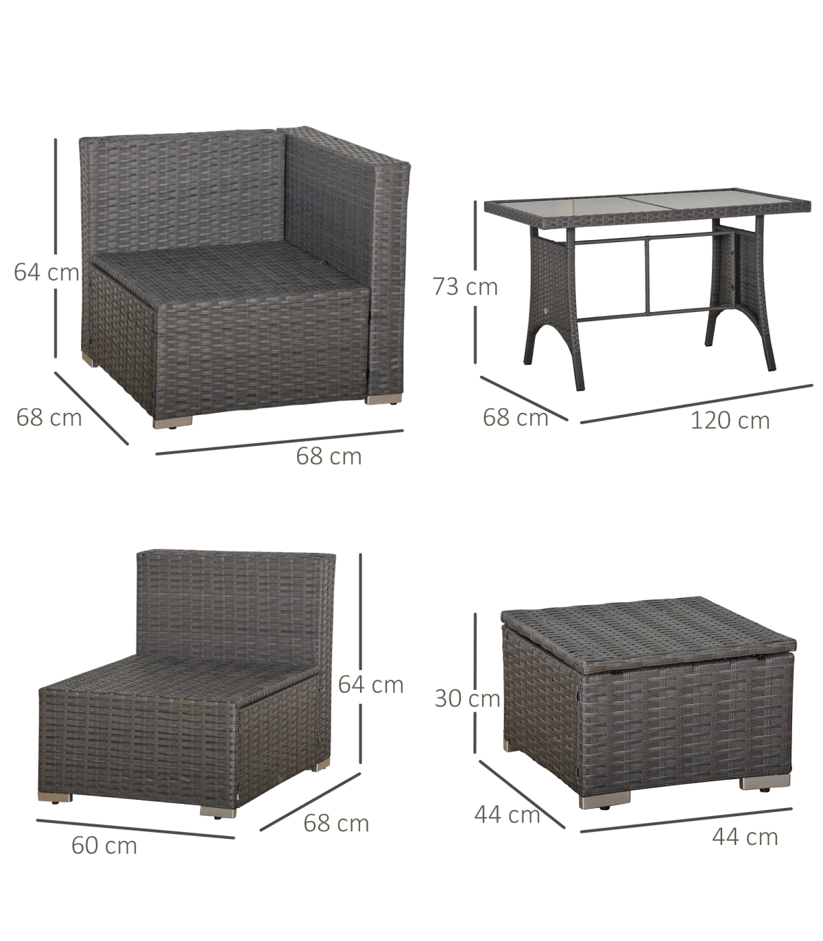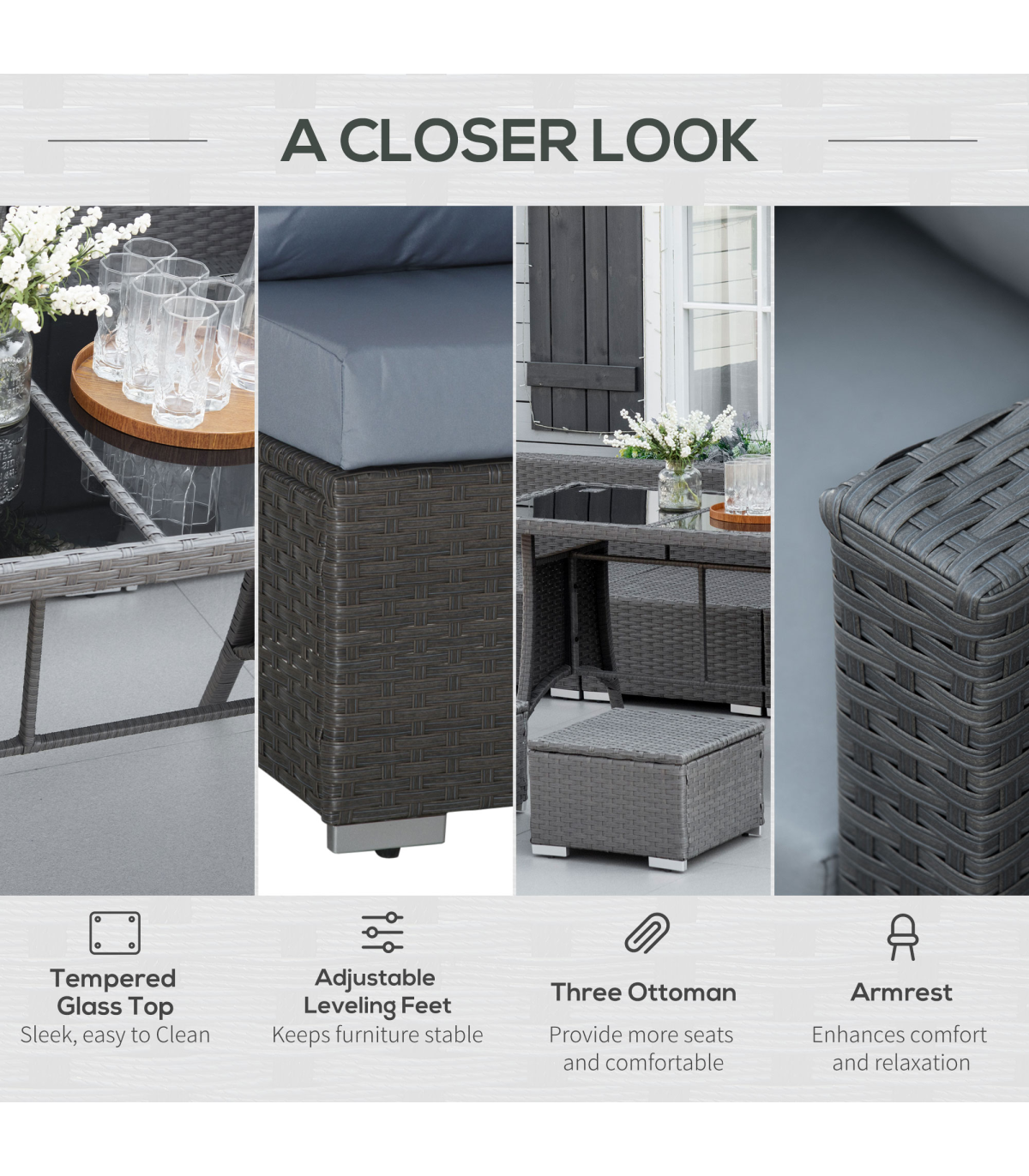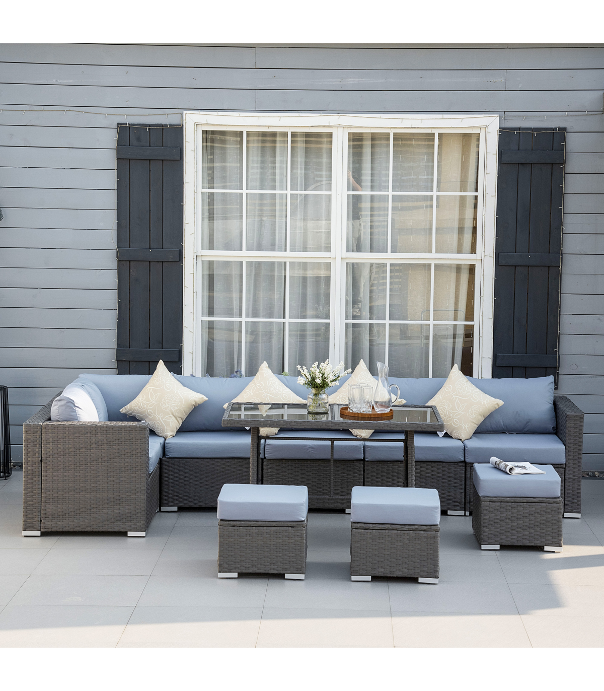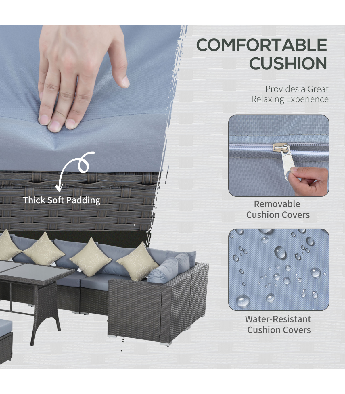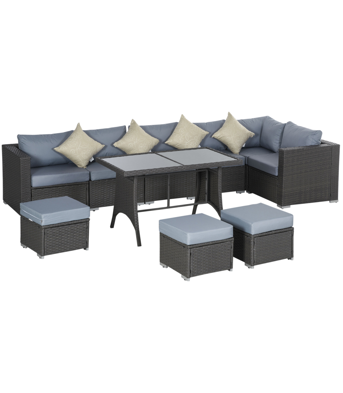 - Made from a steel frame construction and covered with fire retardant and weather resistant PE rattan 10pc rattan set with multiple configurations to suit Polyester cushion cover with zippered design for easy washing Toughened tempered glass for superior strength and safety Thick padded cushions for ultimate comfort Assembly required Include: 3 x corner sofa, 3 x armless sofa, 3 x footrest, 1 x table, 7 x seat cushion, 7 x back cushion, 3 x footrest cushion, 4 x throw pillow
