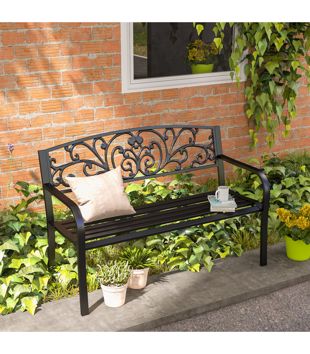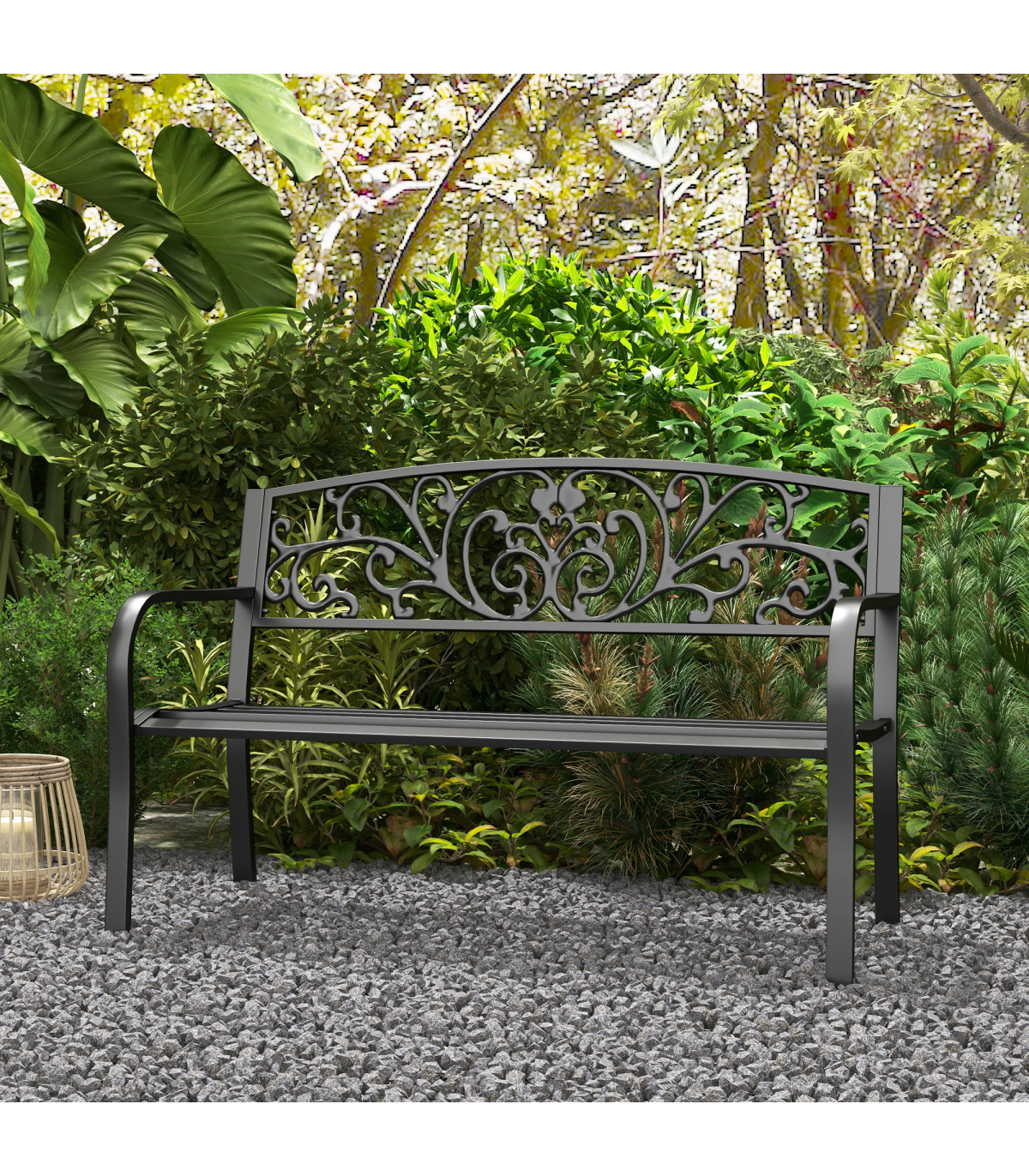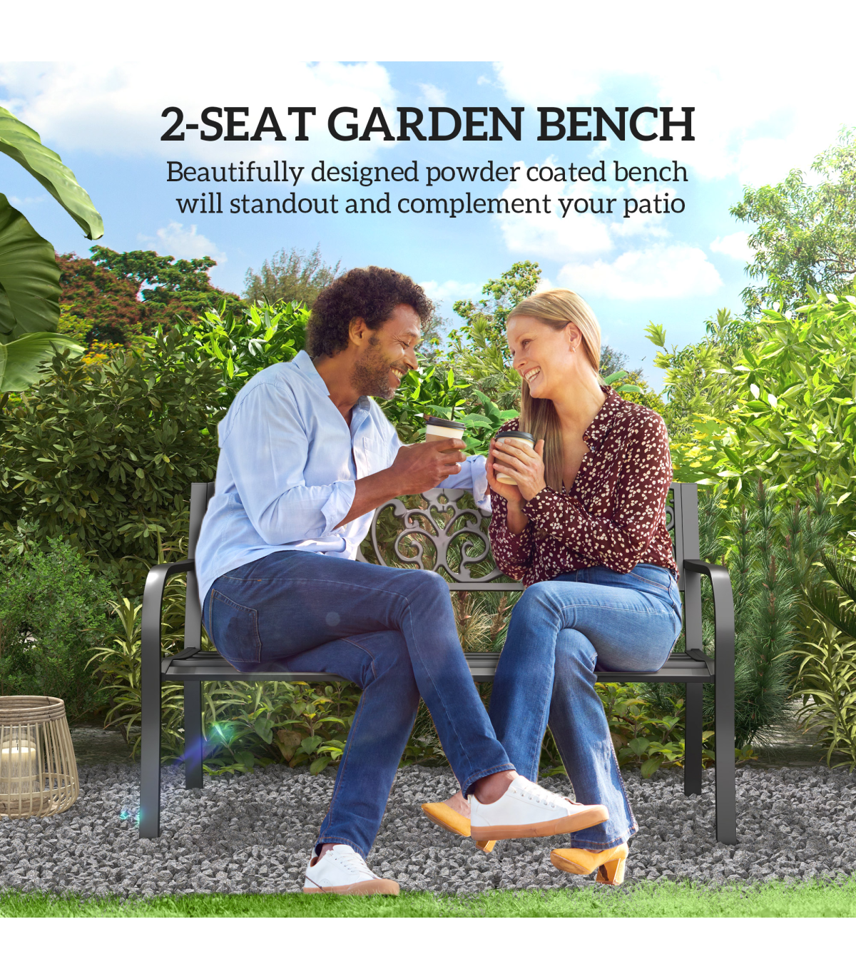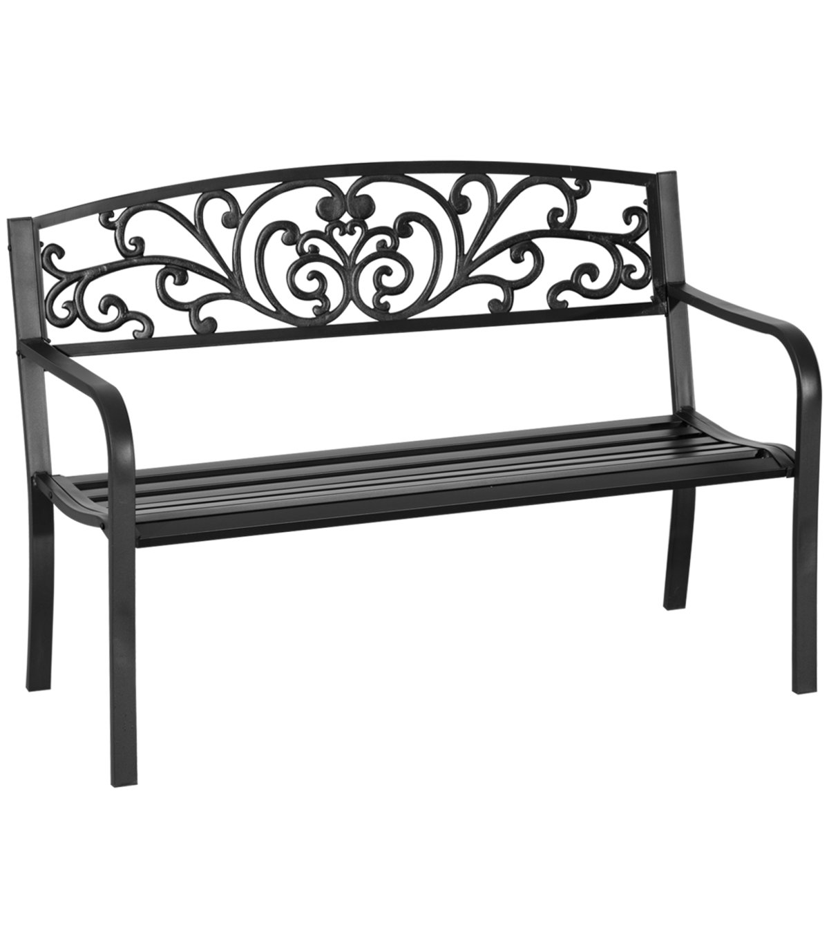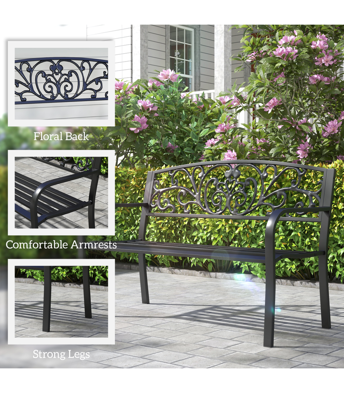 2-Seater Garden Bench, Steel-Black" and Description: "The garden bench from Outsunny is ideal for enjoying your favorite peaceful spot, along a path, under a tree, or among the flowers. This product is constructed with a steel frame. Relax with friends or family and enjoy the scenery of your outdoor space. The tough steel construction and 120 cm length of this patio garden bench allows for 2 individuals to comfortably sit and relax at once." Features: - Beautifully designed powder coated bench to add elegance to your patio or backyard - Durable steel frame - Floral design on the backrest will standout and complement your outdoor décor - Full-sized 121 cm long garden bench offers seating for two in comfort - Easy to clean and maintain with a damp cloth - Assembly required