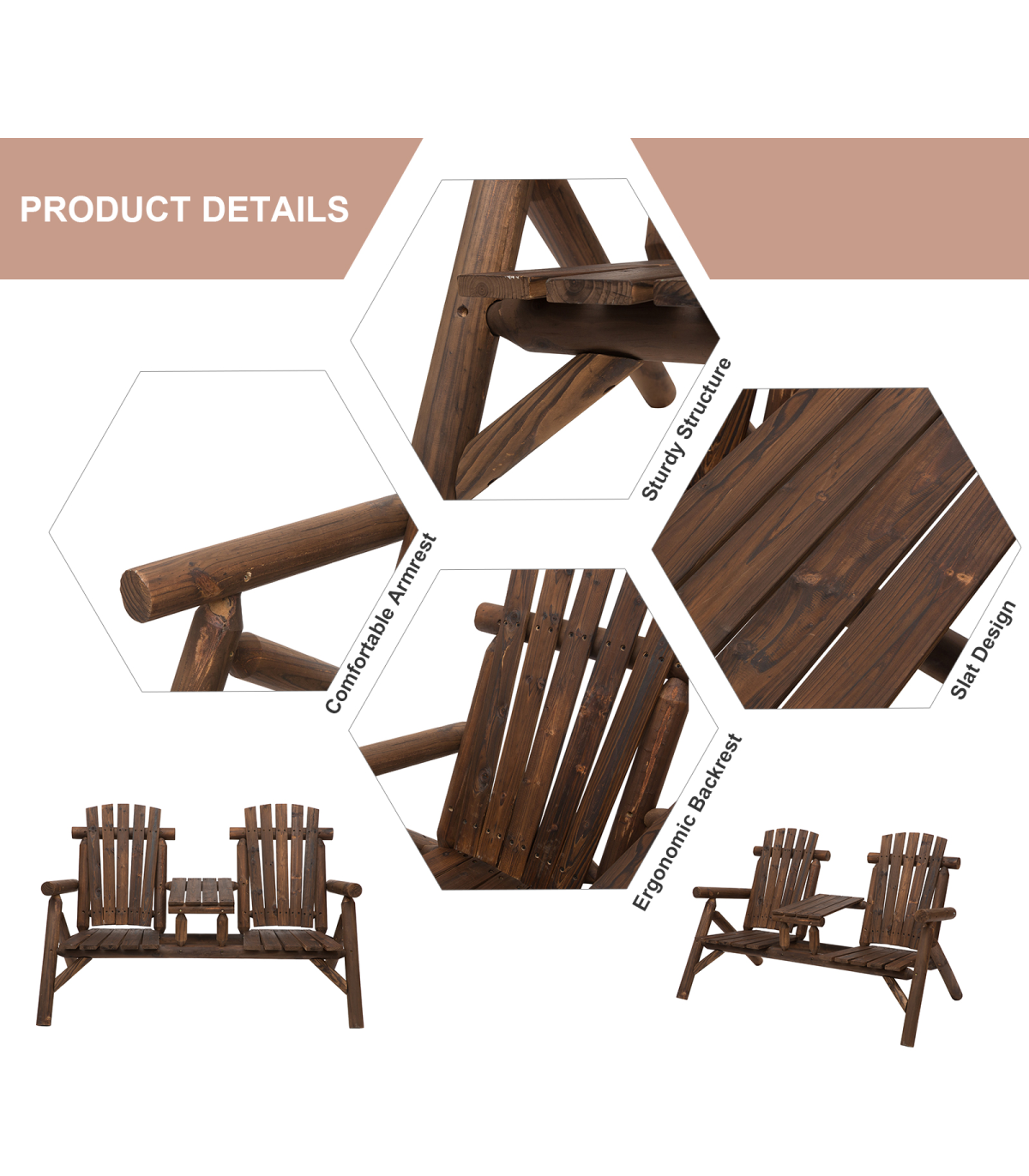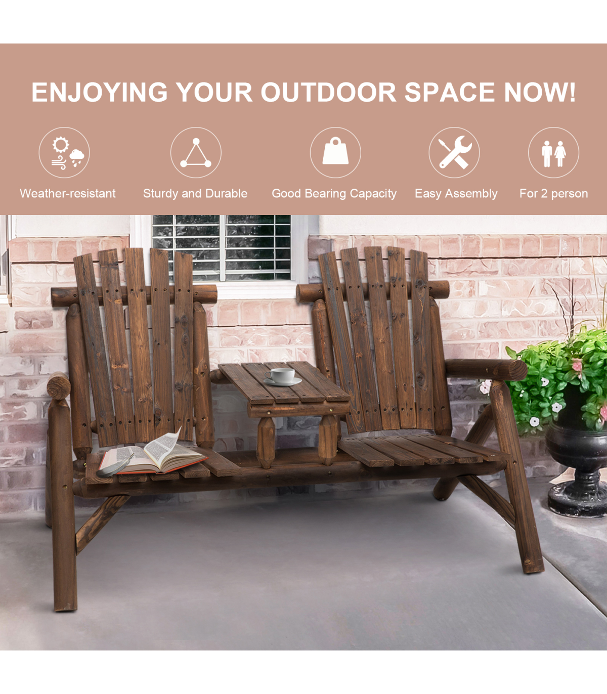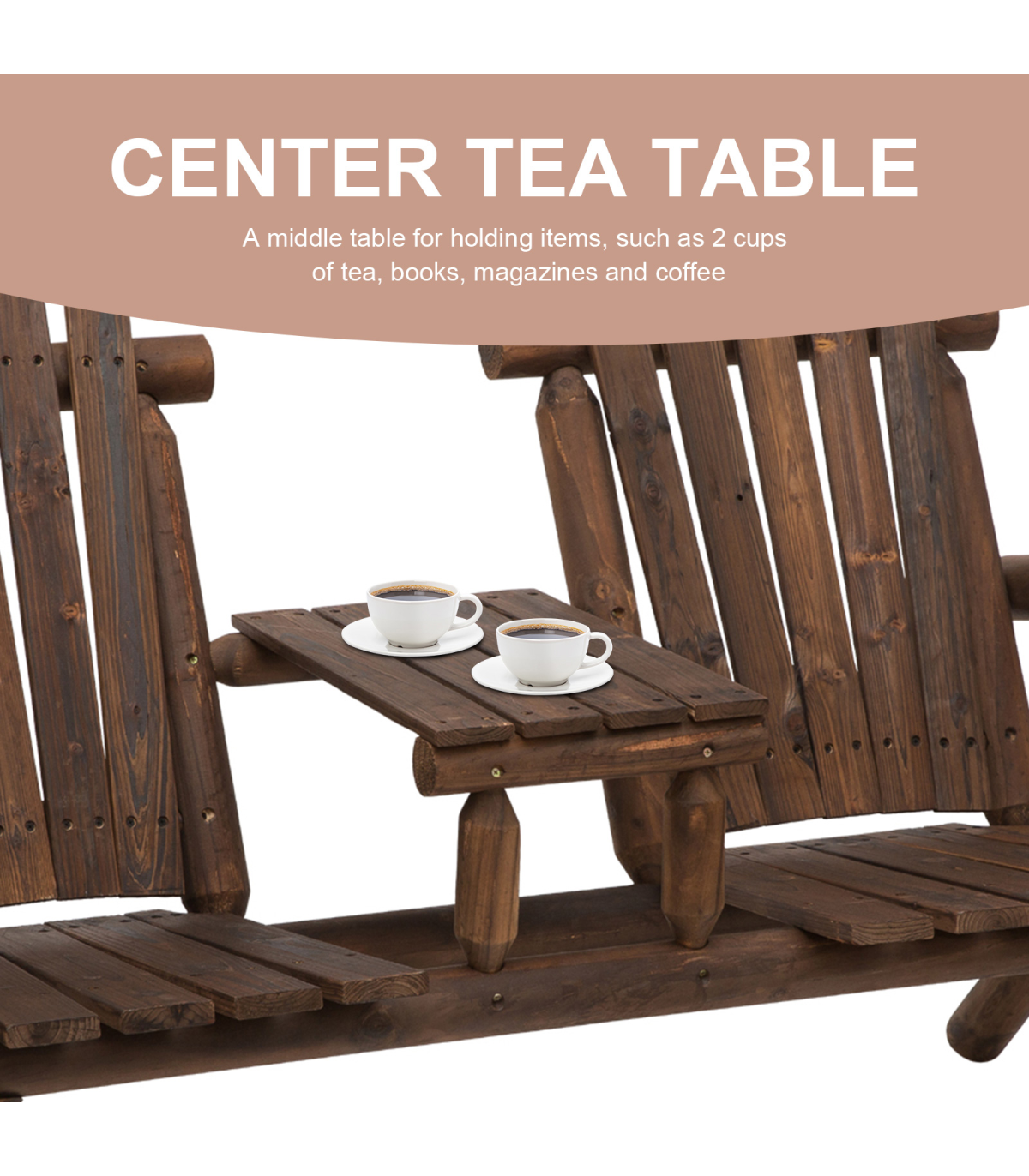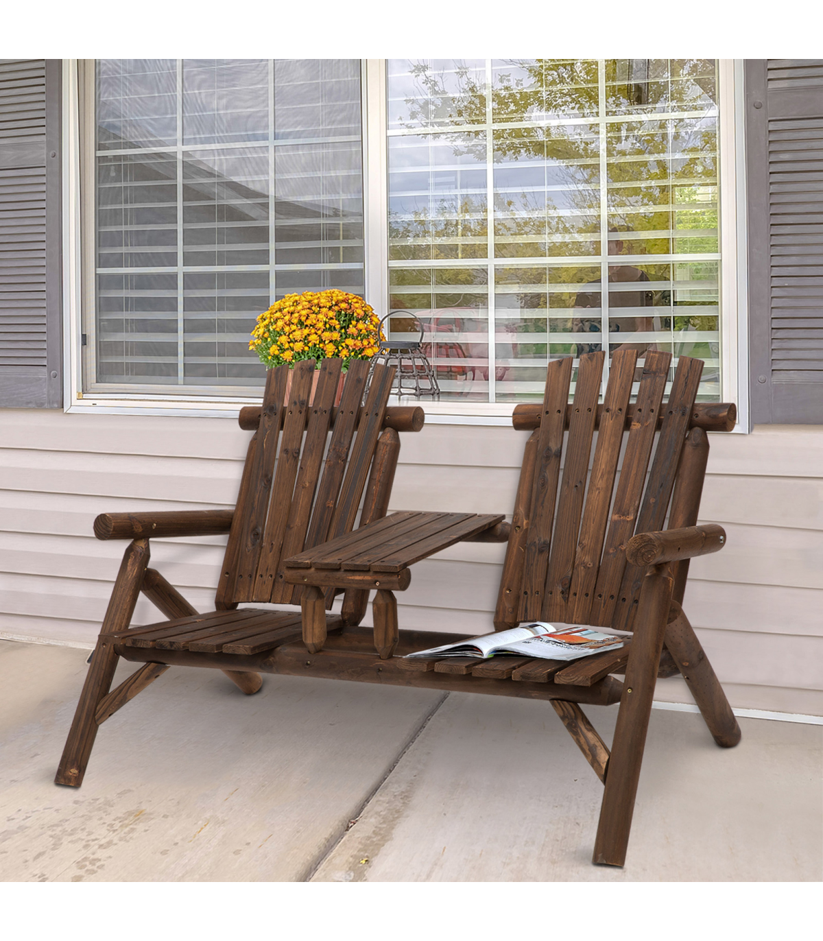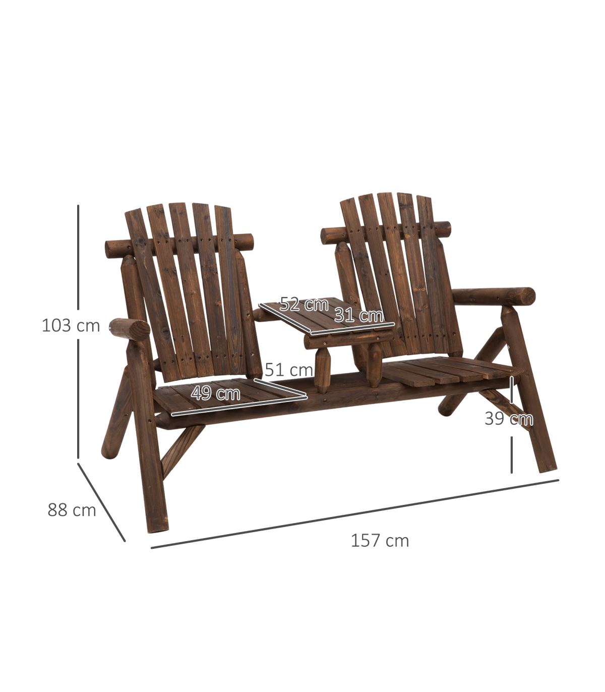 Outsunny's Adirondack style patio chair with middle center table features a stylish fan backrest that has rounded armrests and 2 seats. With our Adirondack chair you've found a perfect marriage of form and function. This garden bench and table features 2 wide seats for comfortable sitting and the table works perfectly as a place for drinks and snacks. This double Adirondack chair is perfect for sprawling out on a hot summer day or sinking into comfort on a crisp fall evening.