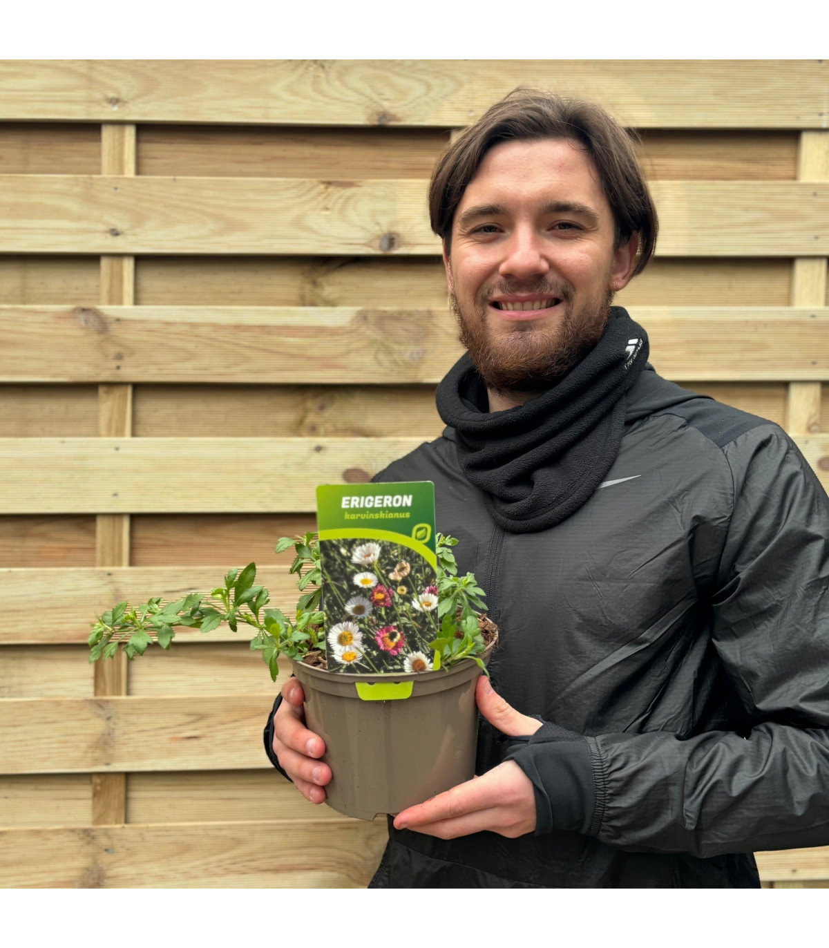Erigeron karvinskianus, commonly known as Mexican Fleabane or Santa Barbara Daisy, is a delightful and adaptable perennial that effortlessly adds a touch of romance and whimsy to garden landscapes. Renowned for its masses of small daisies, this plant presents a captivating two-tone effect as the flowers emerge in pristine white, gradually transforming into shades of pink with cheerful yellow centres. The plant boasts an extended flowering period, gracing the garden with its charming blooms from May to October. The unique colour transition of the flowers, coupled with the abundance of delicate daisies, creates an enchanting spectacle that continuously evolves throughout the growing season.