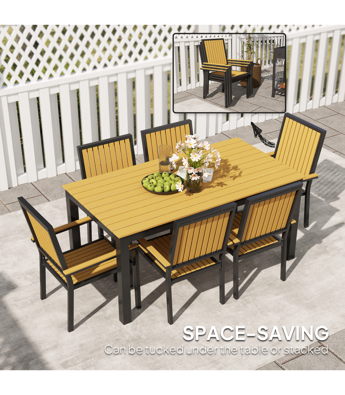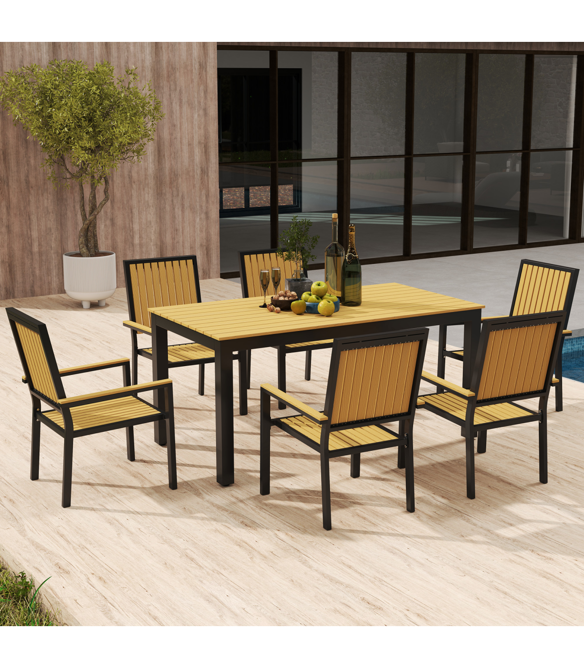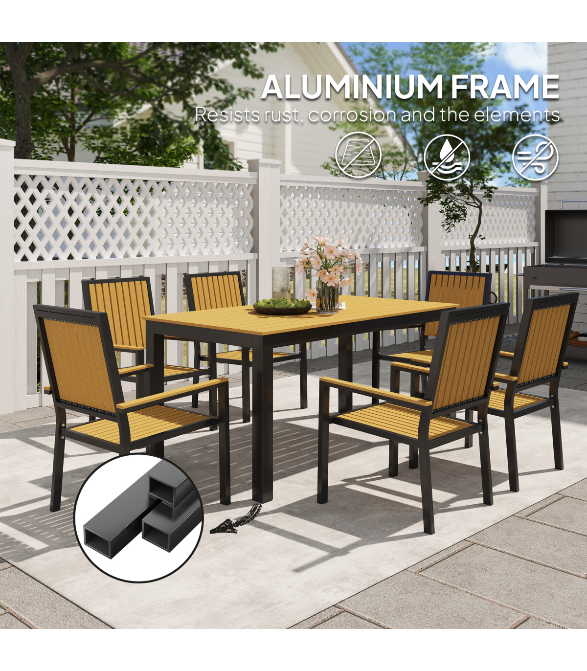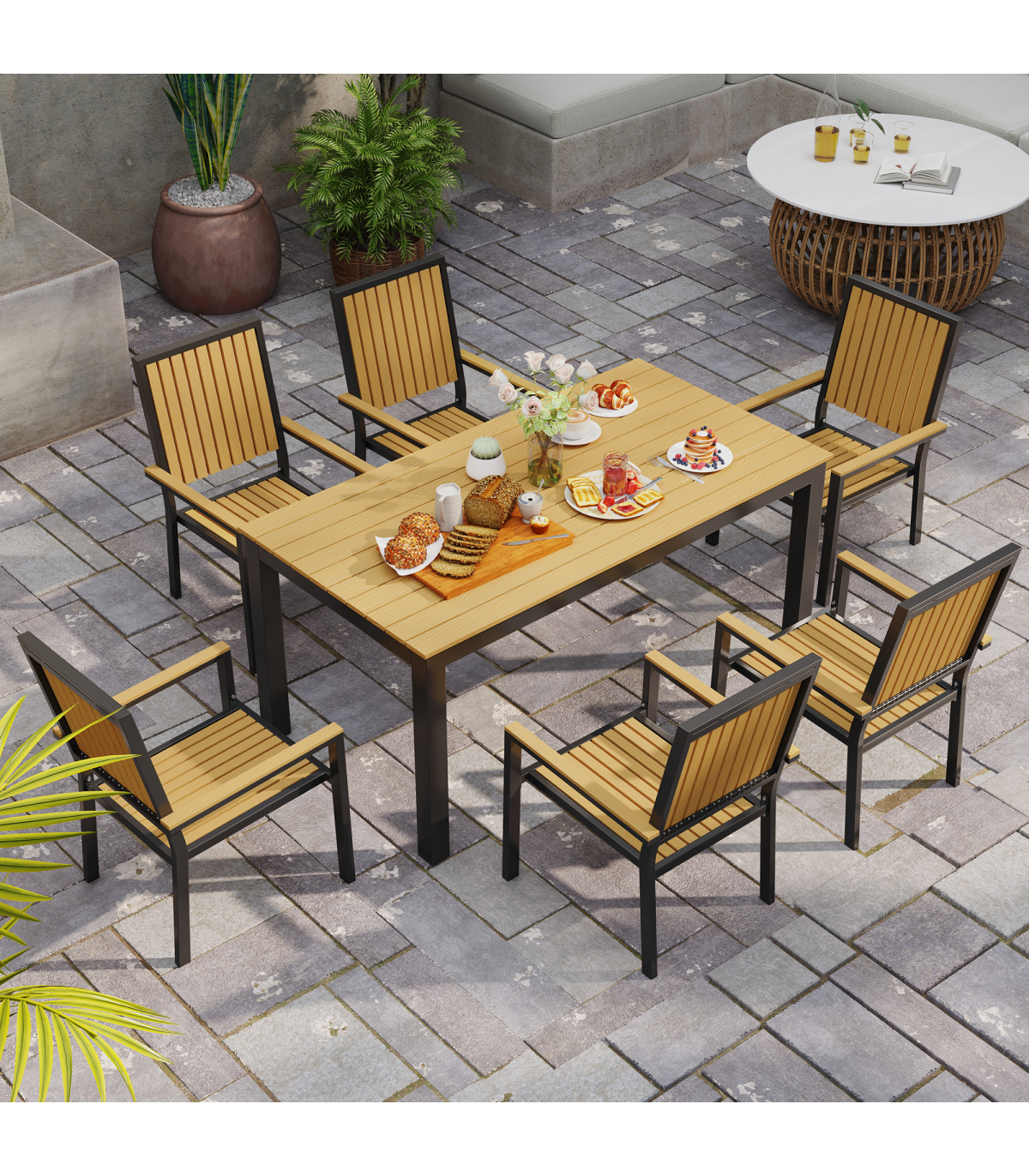 ● This weatherproof tabletop is low-maintenance and easy to clean, with a stylish wood grain
