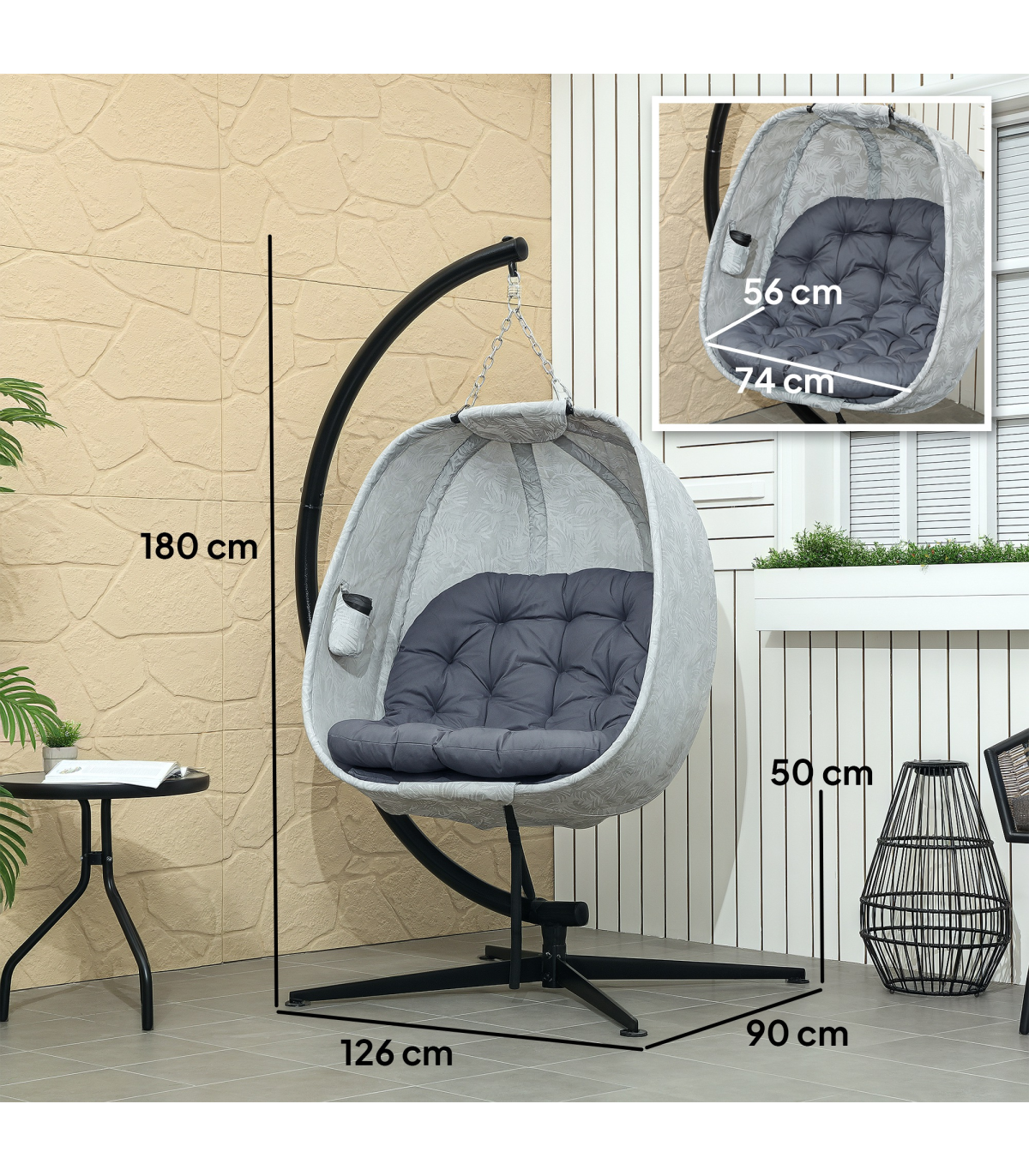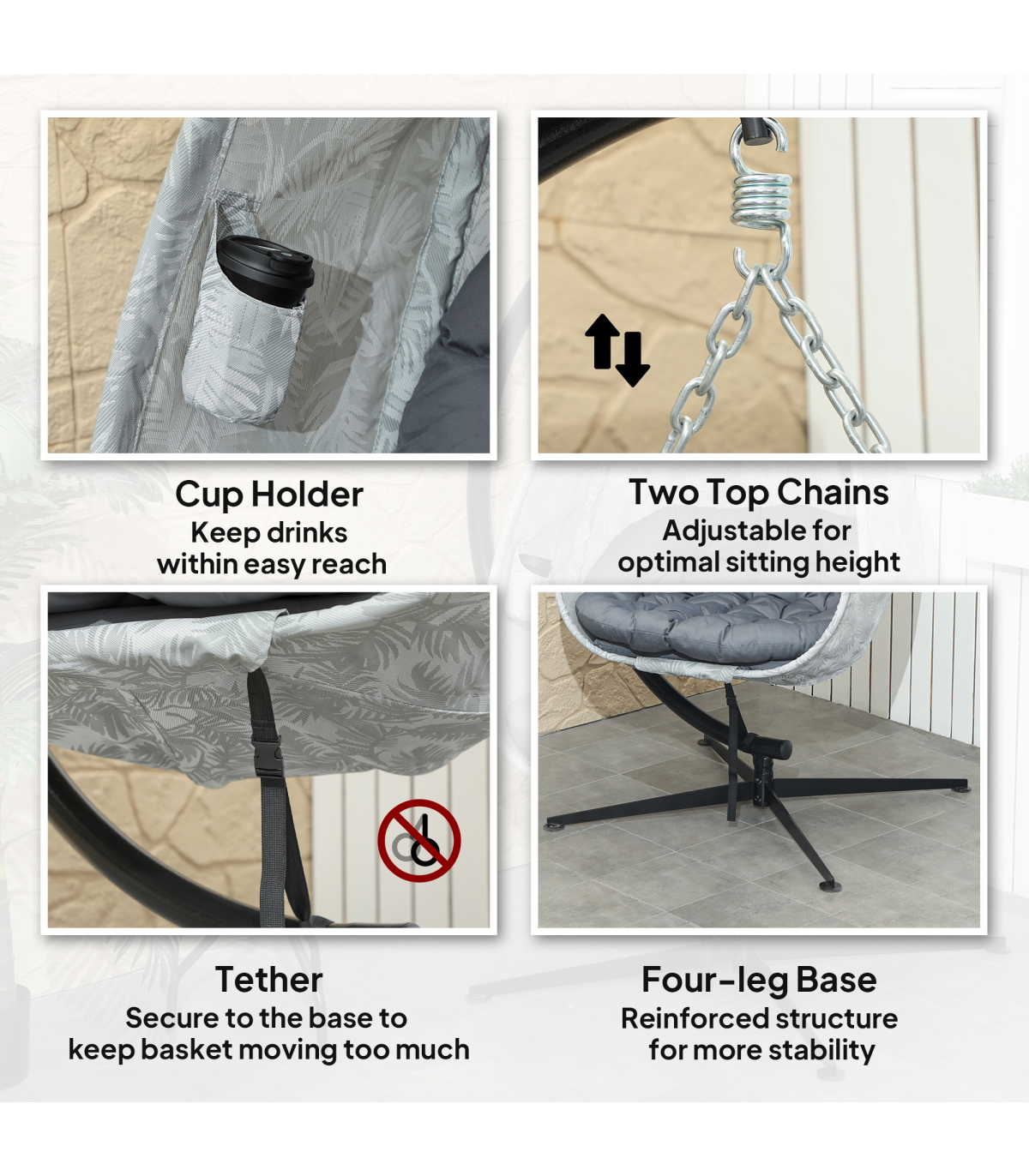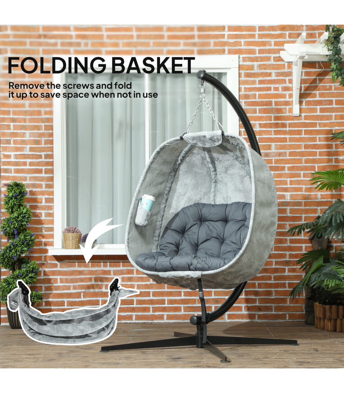 Relax in optimal comfort with this outdoor egg chair from Outsunny! With a wide seat covered in feathery leaves pattern texteline fabric, this egg garden chair offers cosy, bird-nest-like retreat. The folding basket allows easy storage, with a cup holder keeping your drink close. A large 13 cm thickened cushion and a bottom cushion offer cloud-like comfort. Powder-coated steel frame and X-shaped base mean a stable swinging egg chair. Adjustable top chains customise your swinging experience.