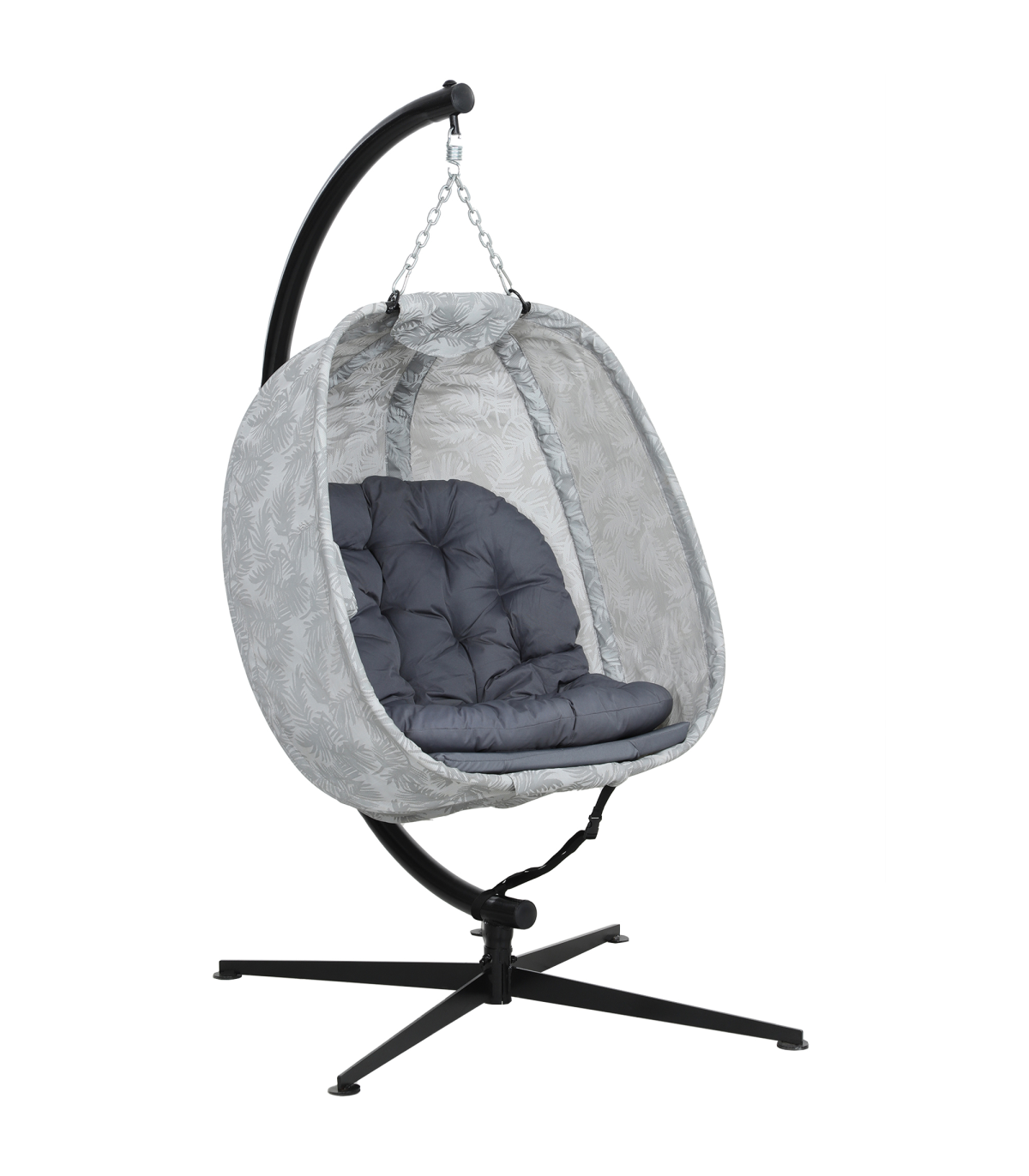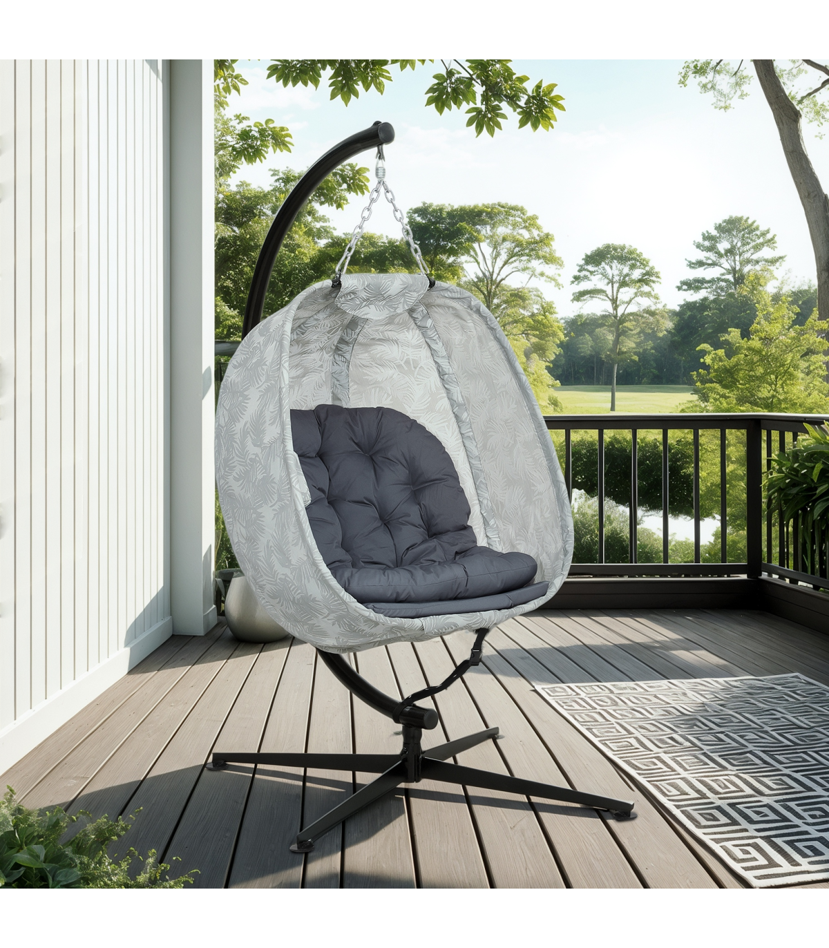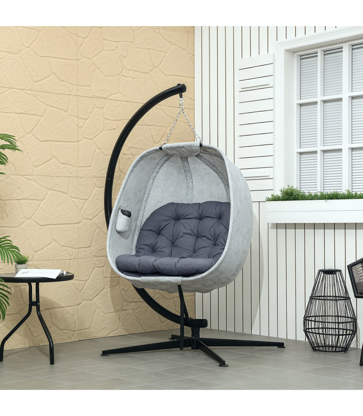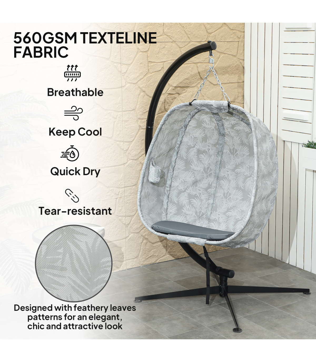 Relax in optimal comfort with this outdoor egg chair from Outsunny! With a wide seat covered in feathery leaves pattern texteline fabric, this egg garden chair offers cosy, bird-nest-like retreat. The folding basket allows easy storage, with a cup holder keeping your drink close. A large 13 cm thickened cushion and a bottom cushion offer cloud-like comfort. Powder-coated steel frame and X-shaped base mean a stable swinging egg chair. Adjustable top chains customise your swinging experience.