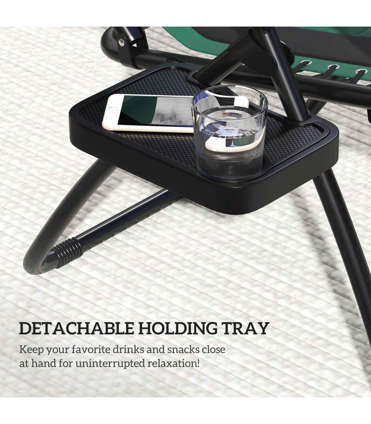 ● Tray with cup holder to keep drinks within easy reach