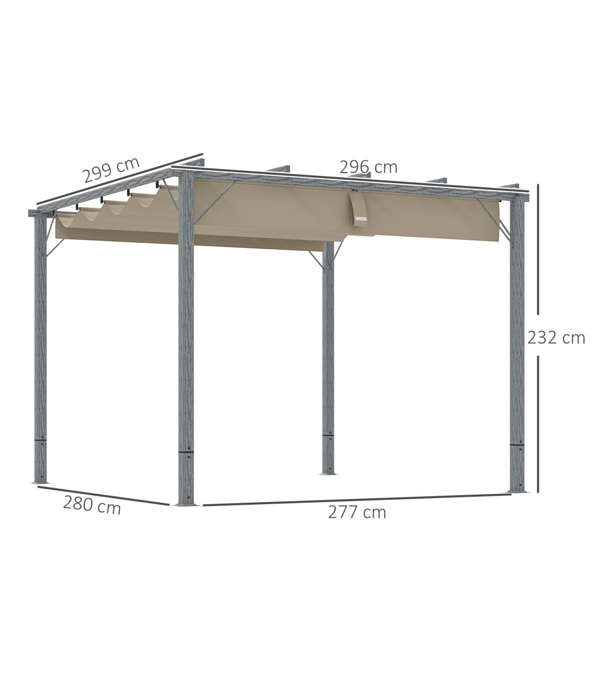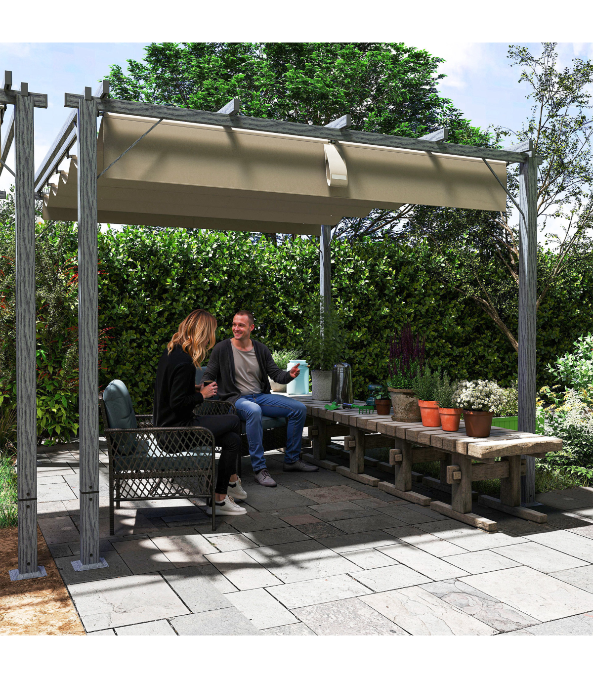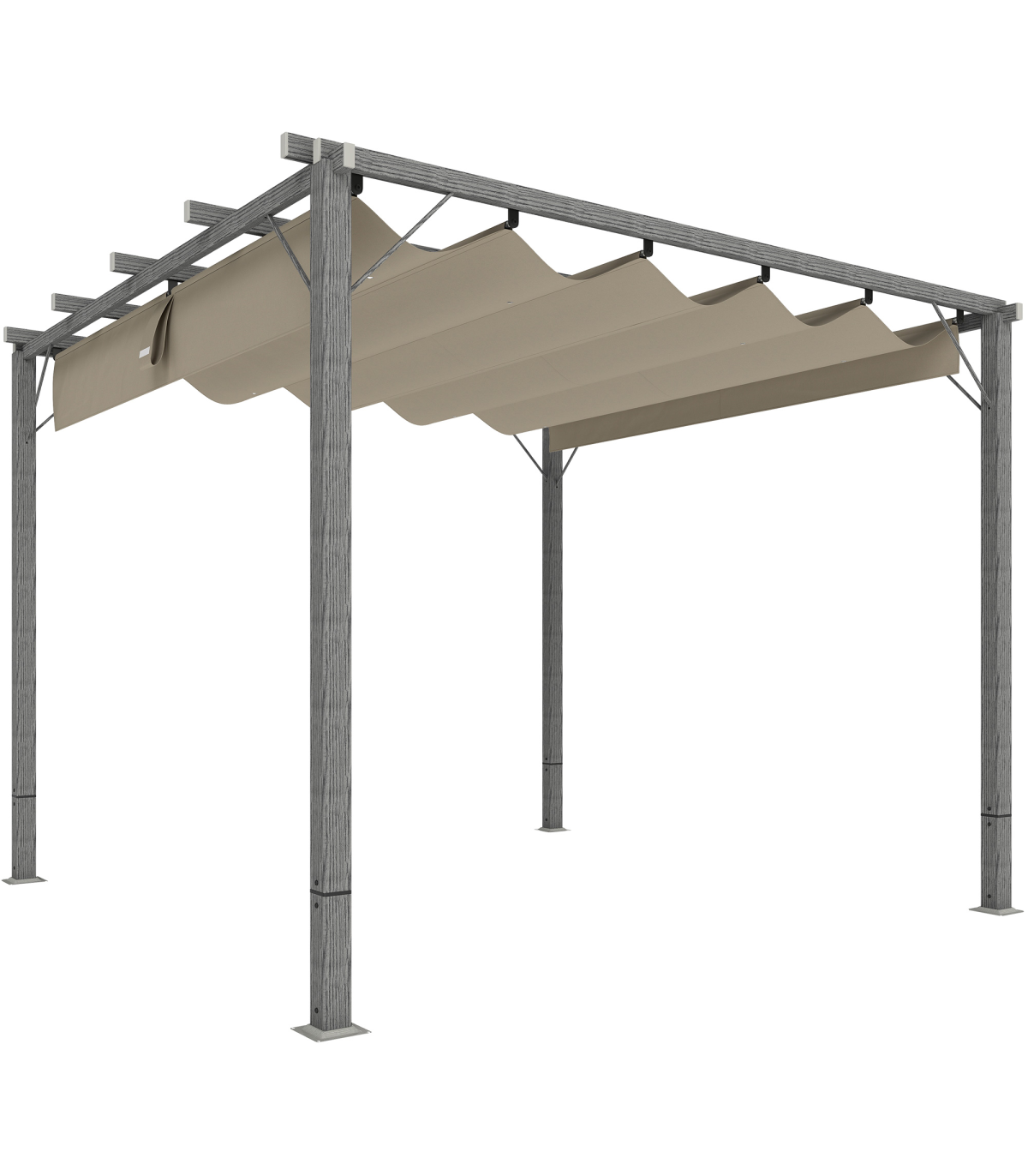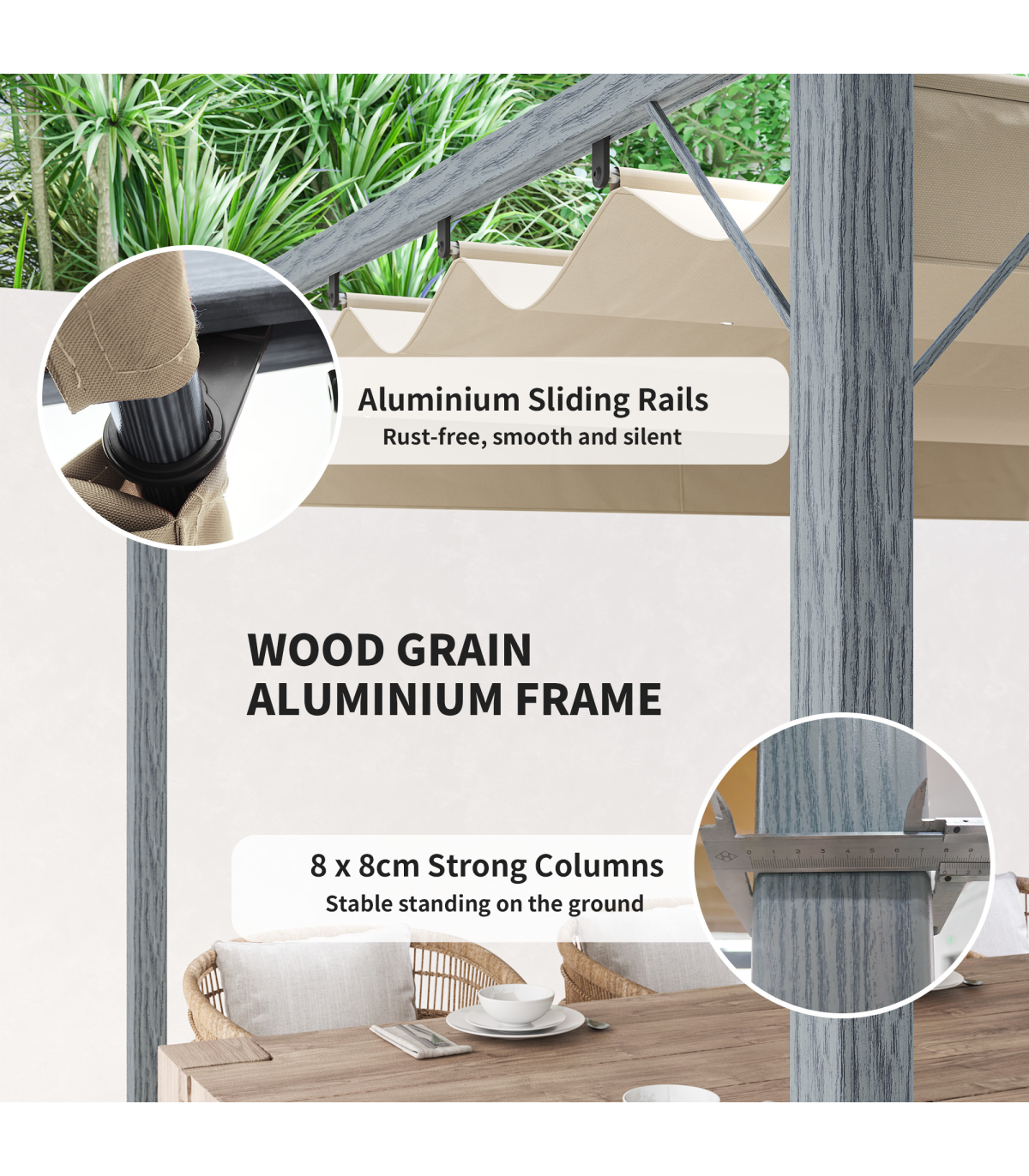 A beautiful spot to relax and gather outdoors, with this Outsunny 3 x 3 m pergola. Thanks to the retractable canopy roof, it's easy to adjust the canopy as you desire - enjoy the sunshine or relax in the shade. The aluminium structure is strong, finished in a wood-effect for an attractive, natural look. Ground stakes and expansion screws included to keep it attached to the floor.
