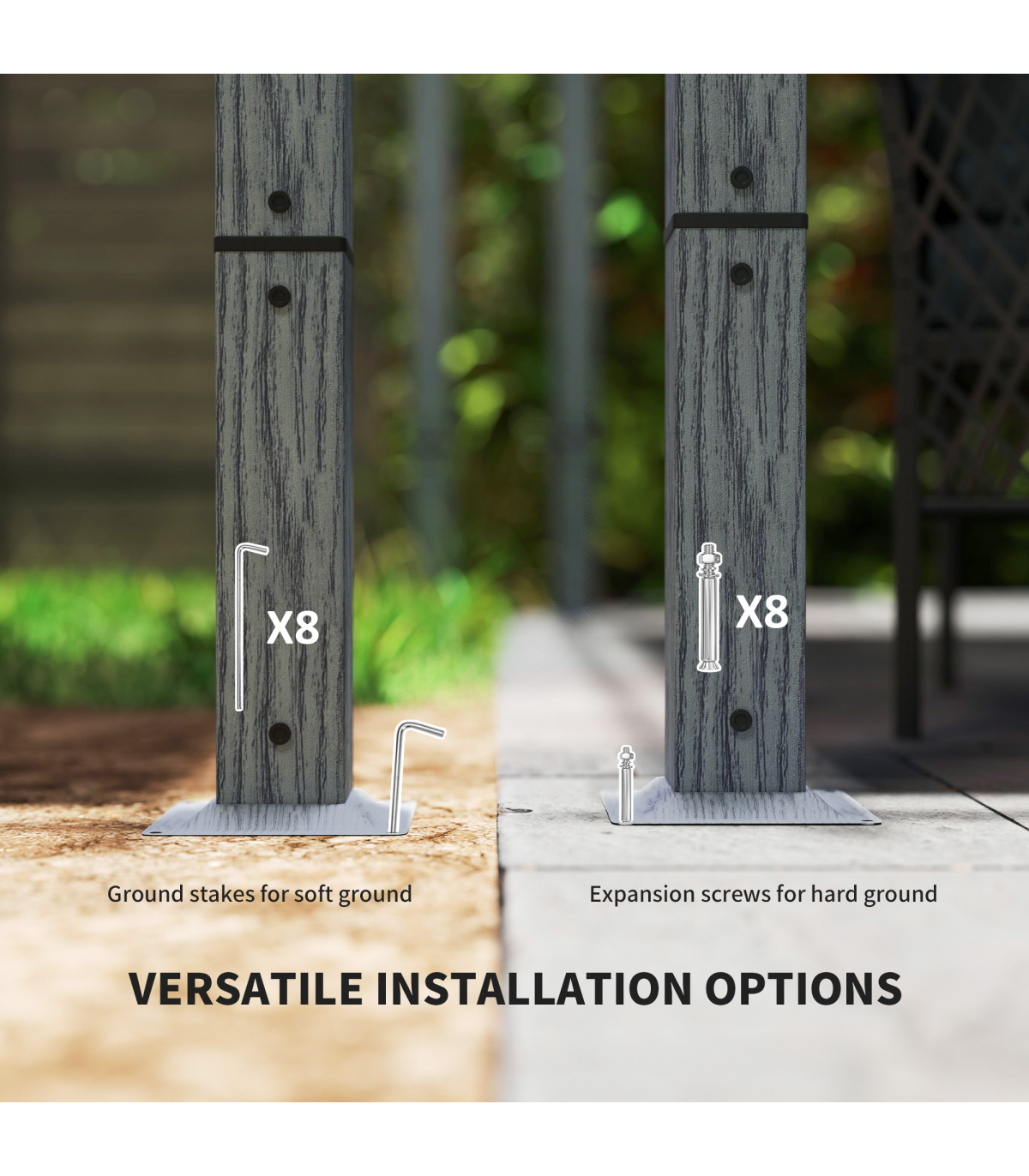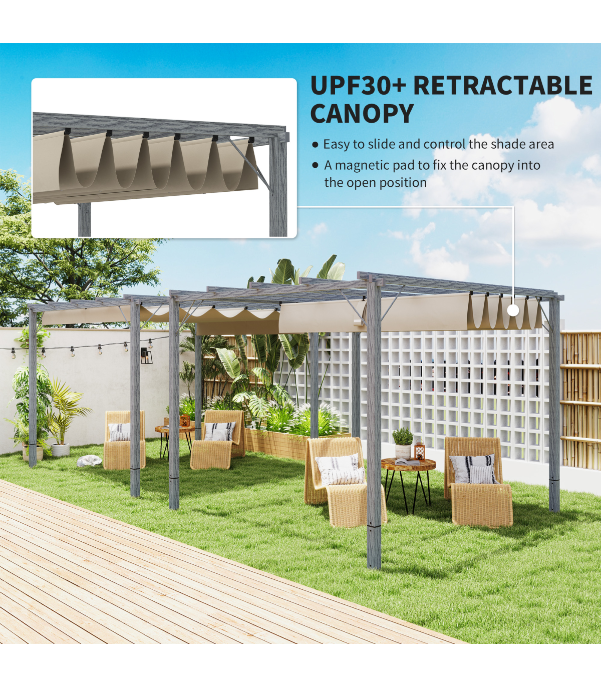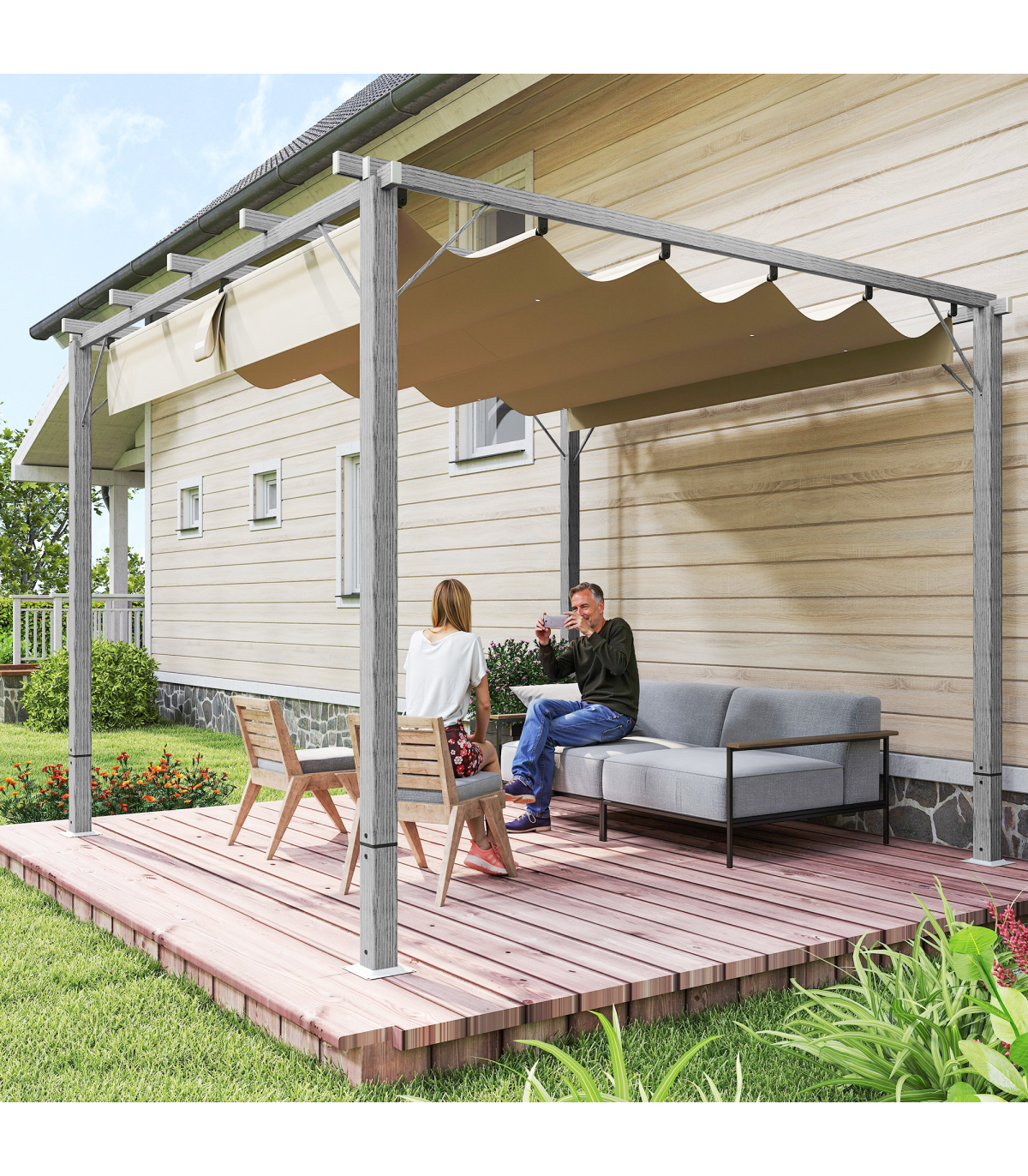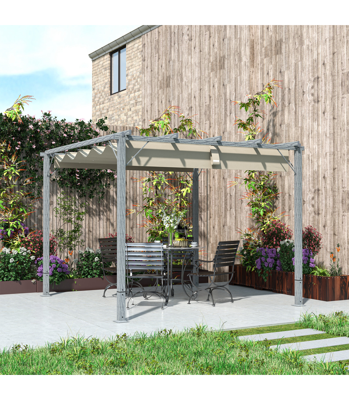A beautiful spot to relax and gather outdoors, with this Outsunny 3 x 3 m pergola. Thanks to the retractable canopy roof, it's easy to adjust the canopy as you desire - enjoy the sunshine or relax in the shade. The aluminium structure is strong, finished in a wood-effect for an attractive, natural look. Ground stakes and expansion screws included to keep it attached to the floor.