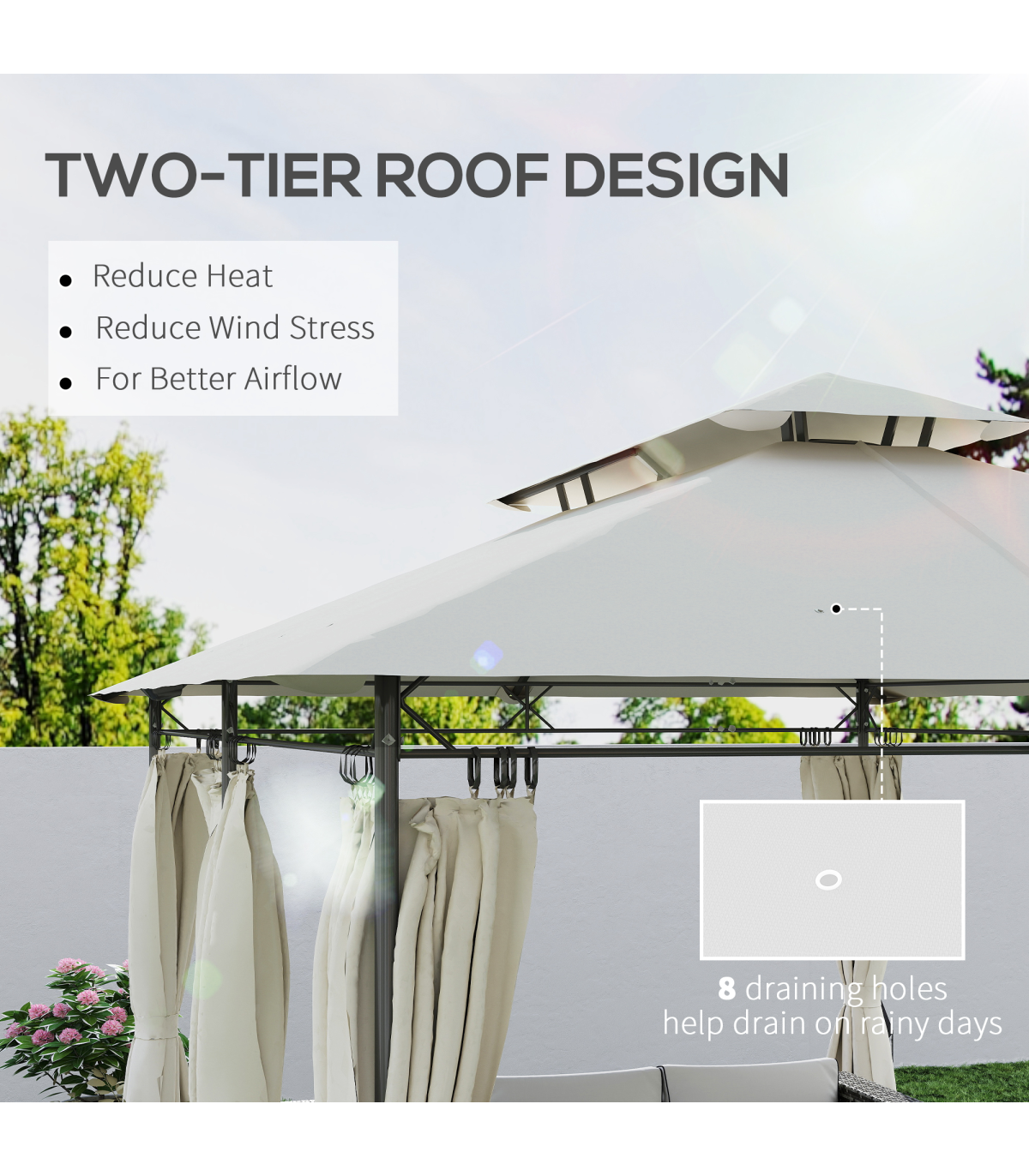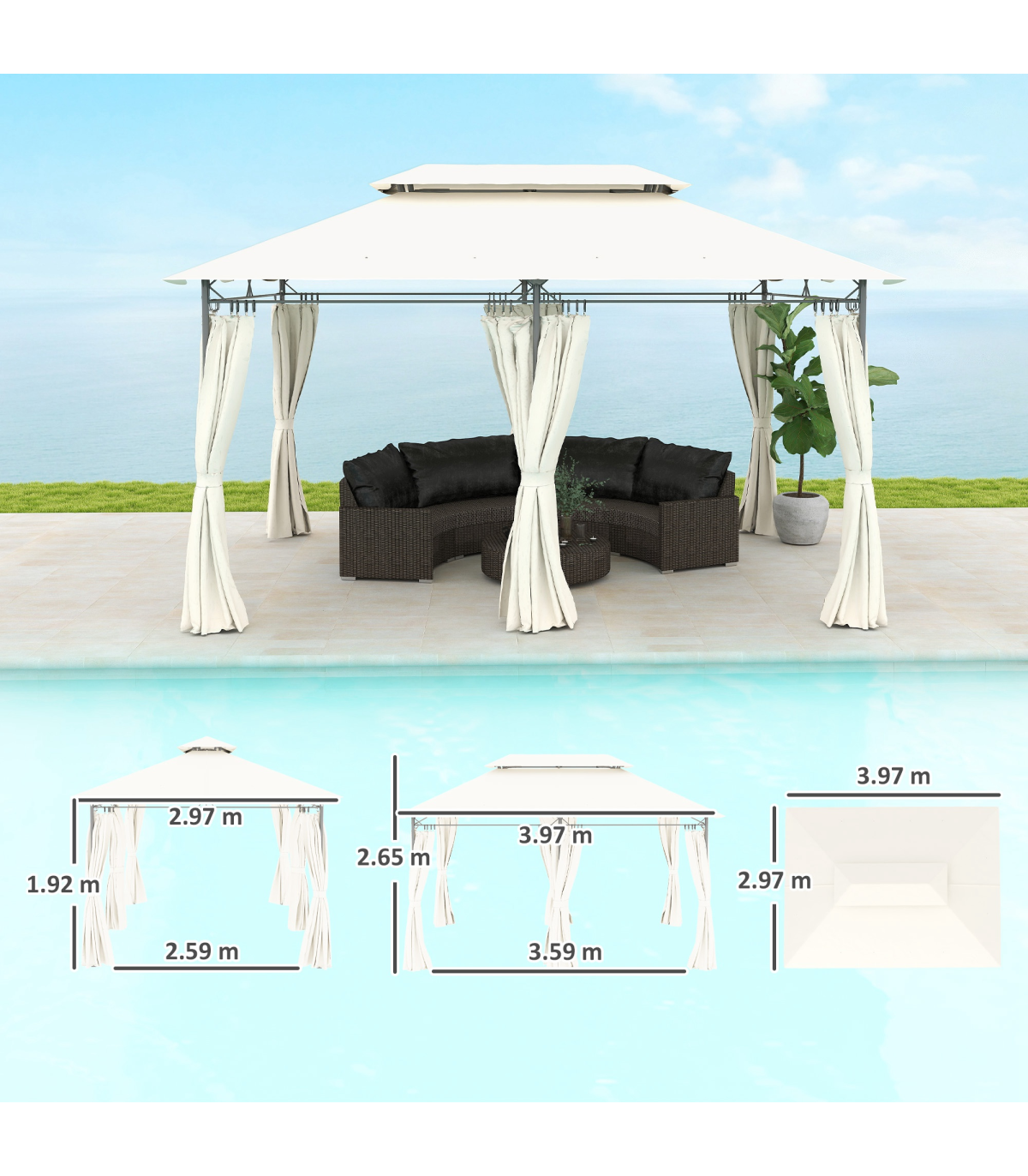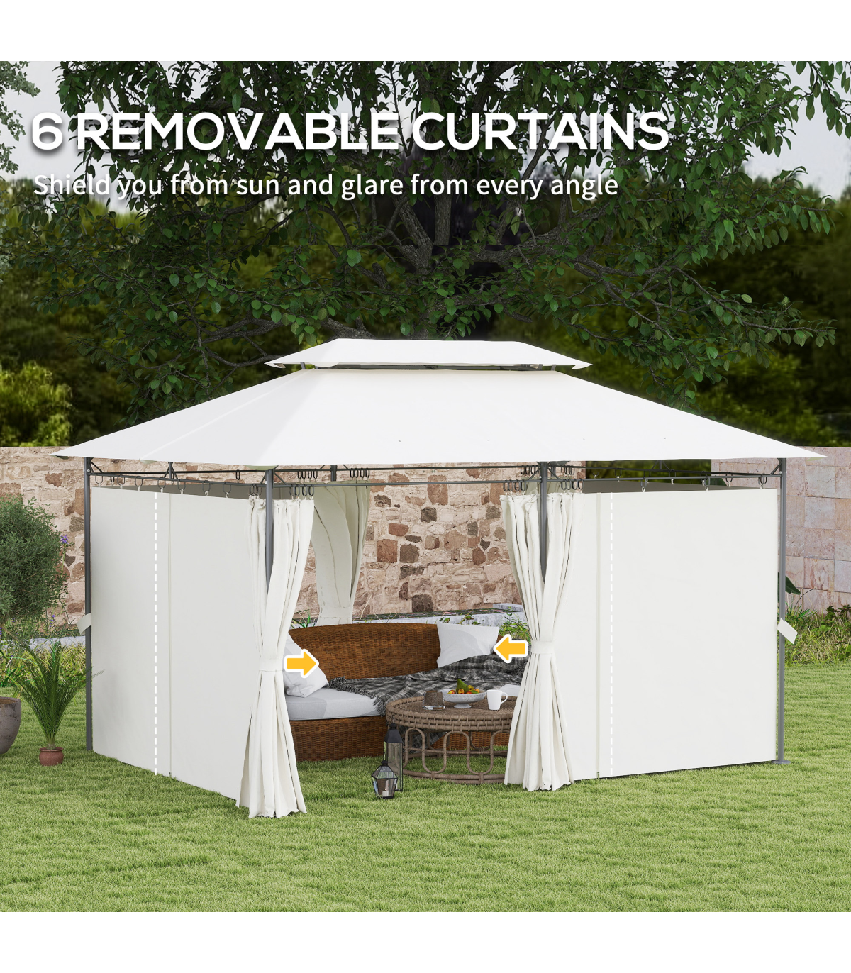 This Outsunny gazebo is a place for plenty outdoors: gatherings, parties - or even as a place to relax on a sunny afternoon. The metal frame means a strong core, fitted with removable curtains to create a private or open feel - as you wish. Thanks to the two-tier roof air gently leaves to reduce canopy stress. Package comes with 4x guy ropes, 16x ground stakes and 12x expansion screws, great as a garden shelter or hot tub gazebo for any outdoor space!