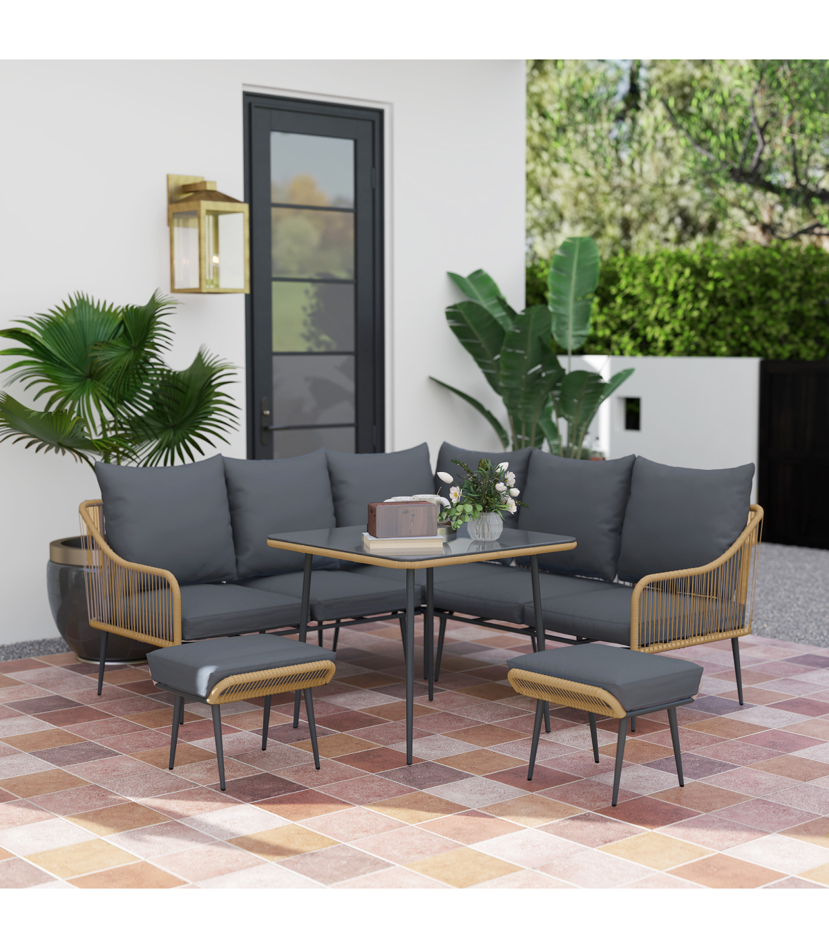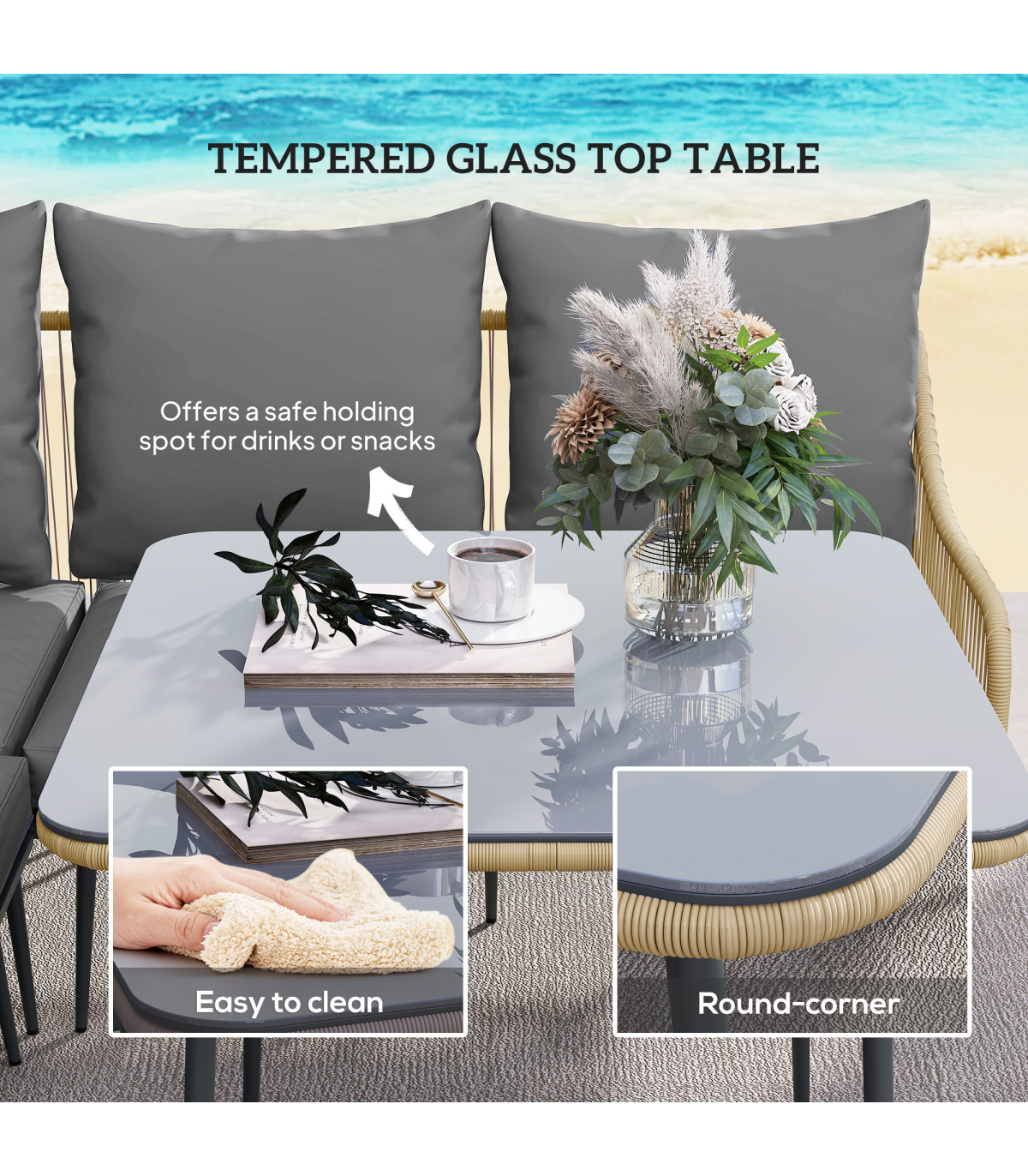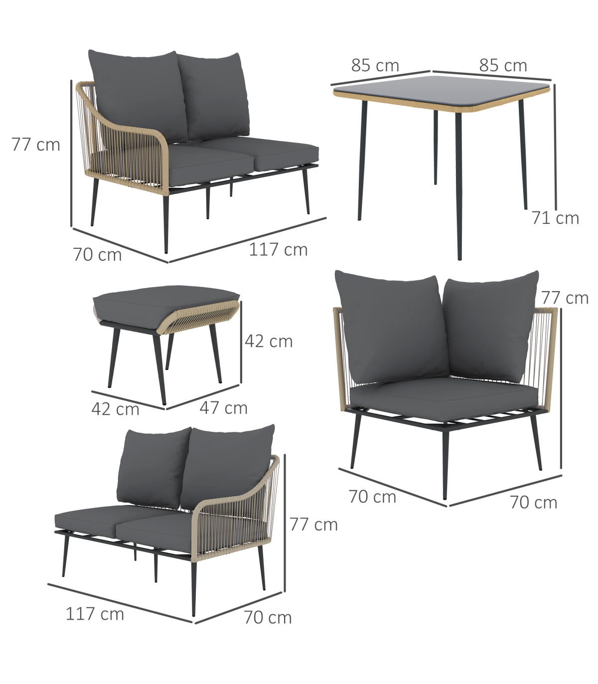 Simple and sleek, finished with total comfort - this Outsunny garden sofa set ticks all the right boxes. The outdoor furniture set comes with six pieces: two loveseats, a corner chair, two footstools and a square table. Steel frames mean a strong core, with the rattan string panels adding a delicate style. The thickened padded cushions on the seats and back of this garden lounge set allow you to relax comfortably. The glass tabletop adds a sleek finishing touch.