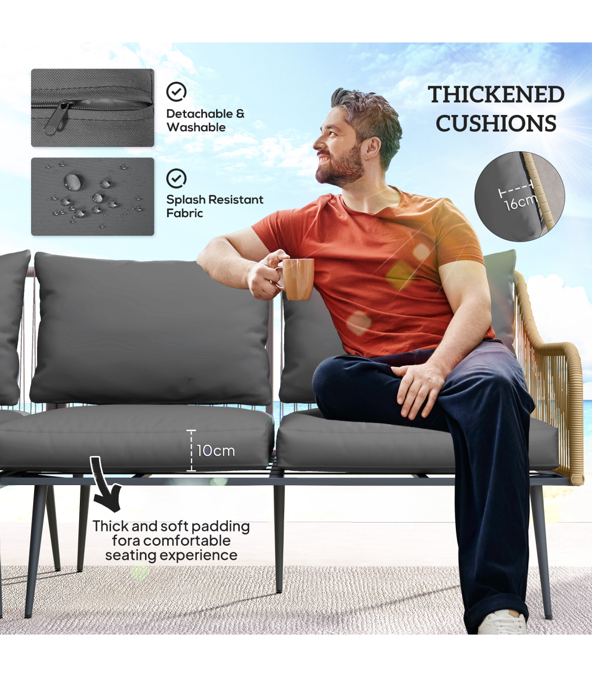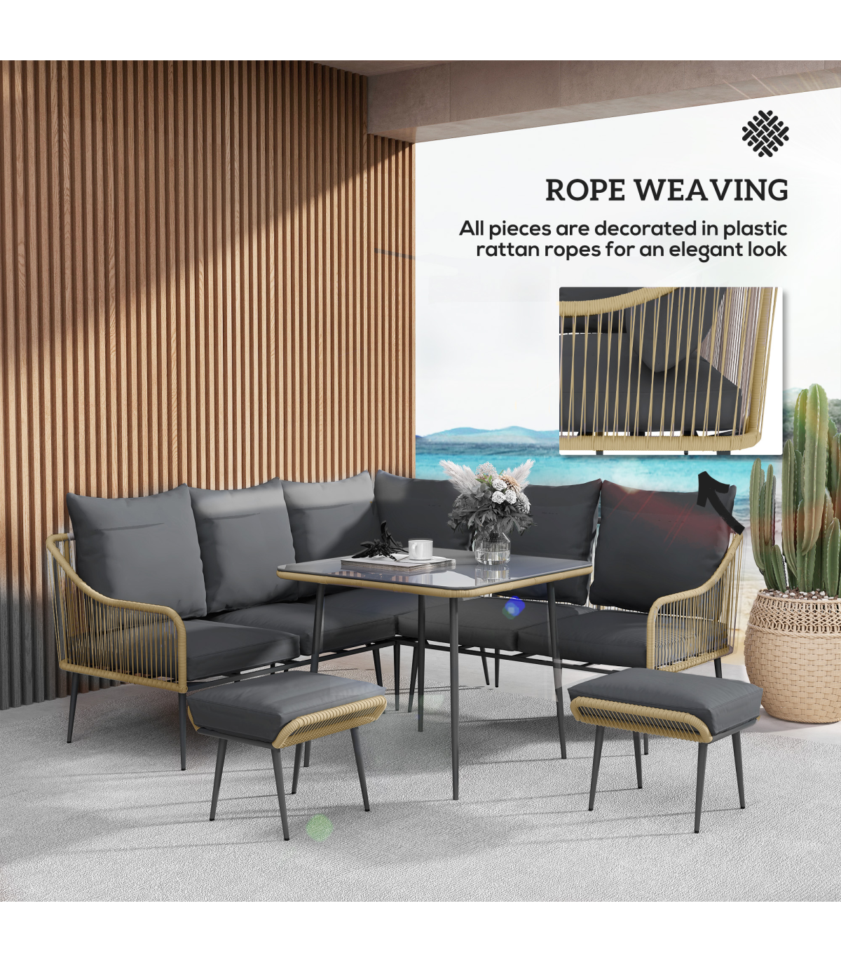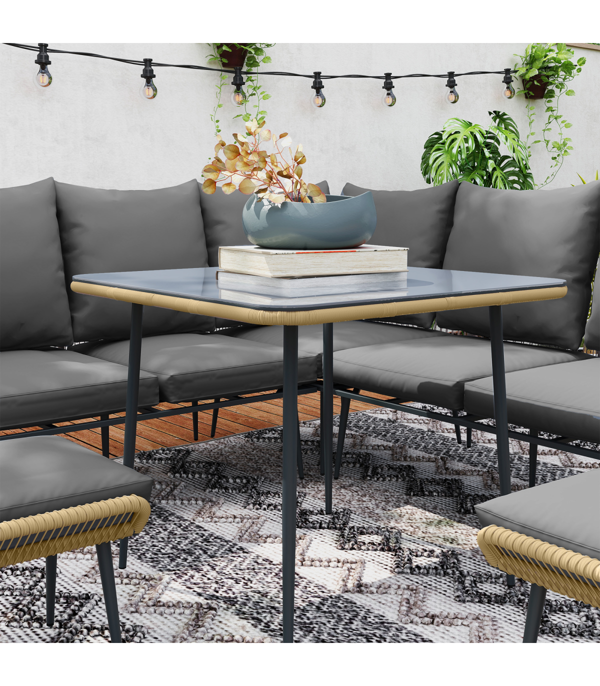 Simple and sleek, finished with total comfort - this Outsunny garden sofa set ticks all the right boxes. The outdoor furniture set comes with six pieces: two loveseats, a corner chair, two footstools and a square table. Steel frames mean a strong core, with the rattan string panels adding a delicate style. The thickened padded cushions on the seats and back of this garden lounge set allow you to relax comfortably. The glass tabletop adds a sleek finishing touch.