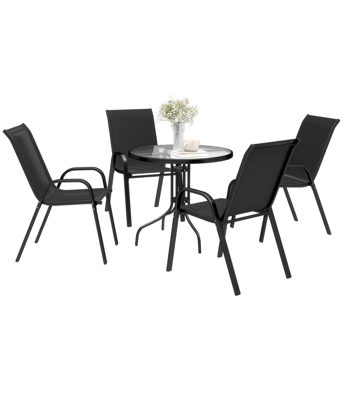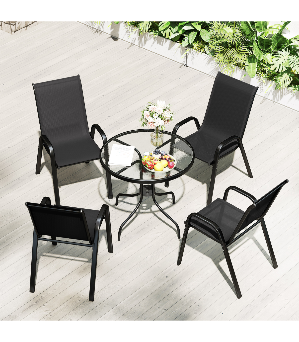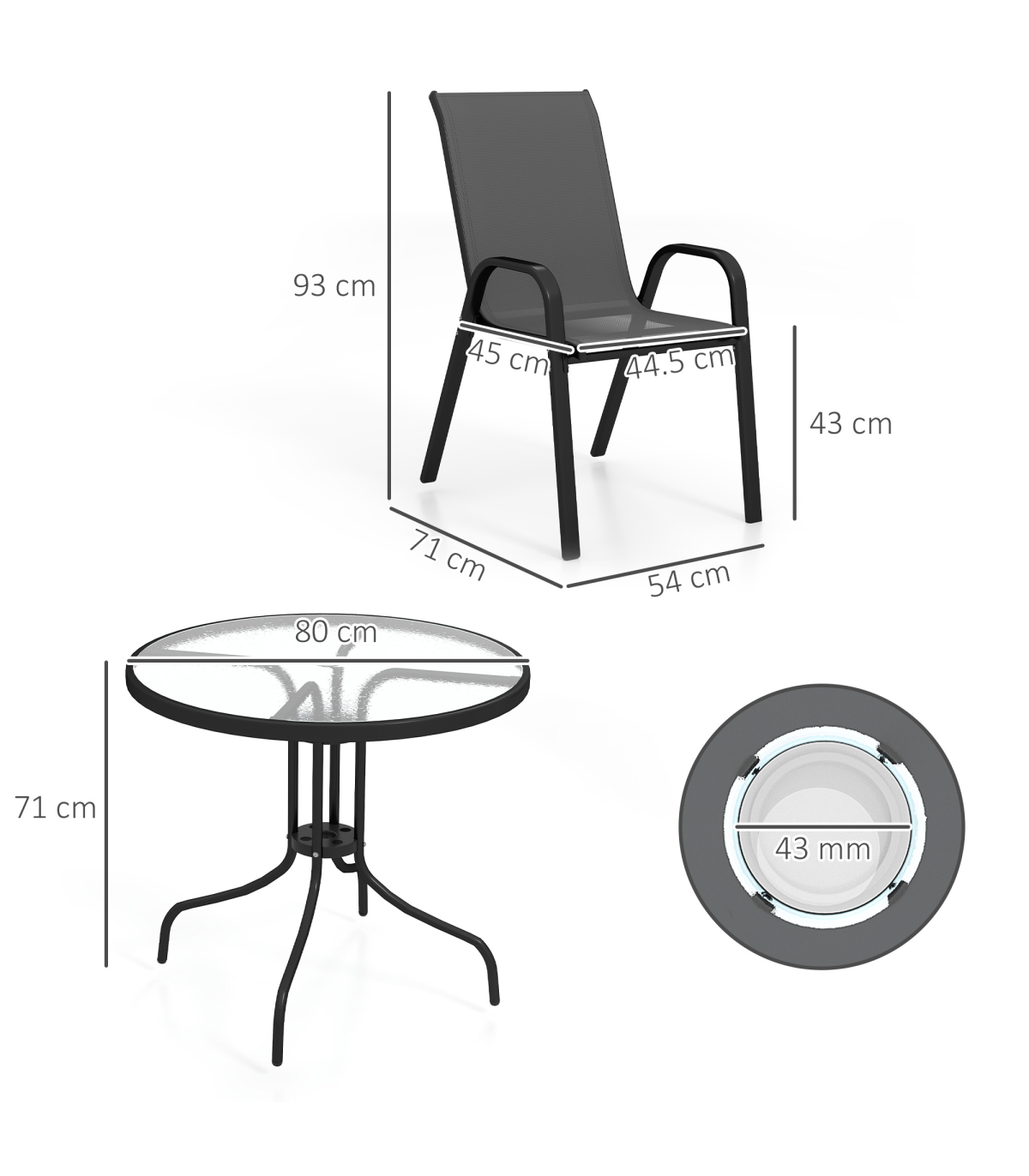 the chairs are stackable to save space when not being used. Powder coated steel frames mean strong, tough cores which cores which are suitable for outdoor use. Balcony furniture set is complete with Φ43mm hole in the table to hold a parasol securely in place.