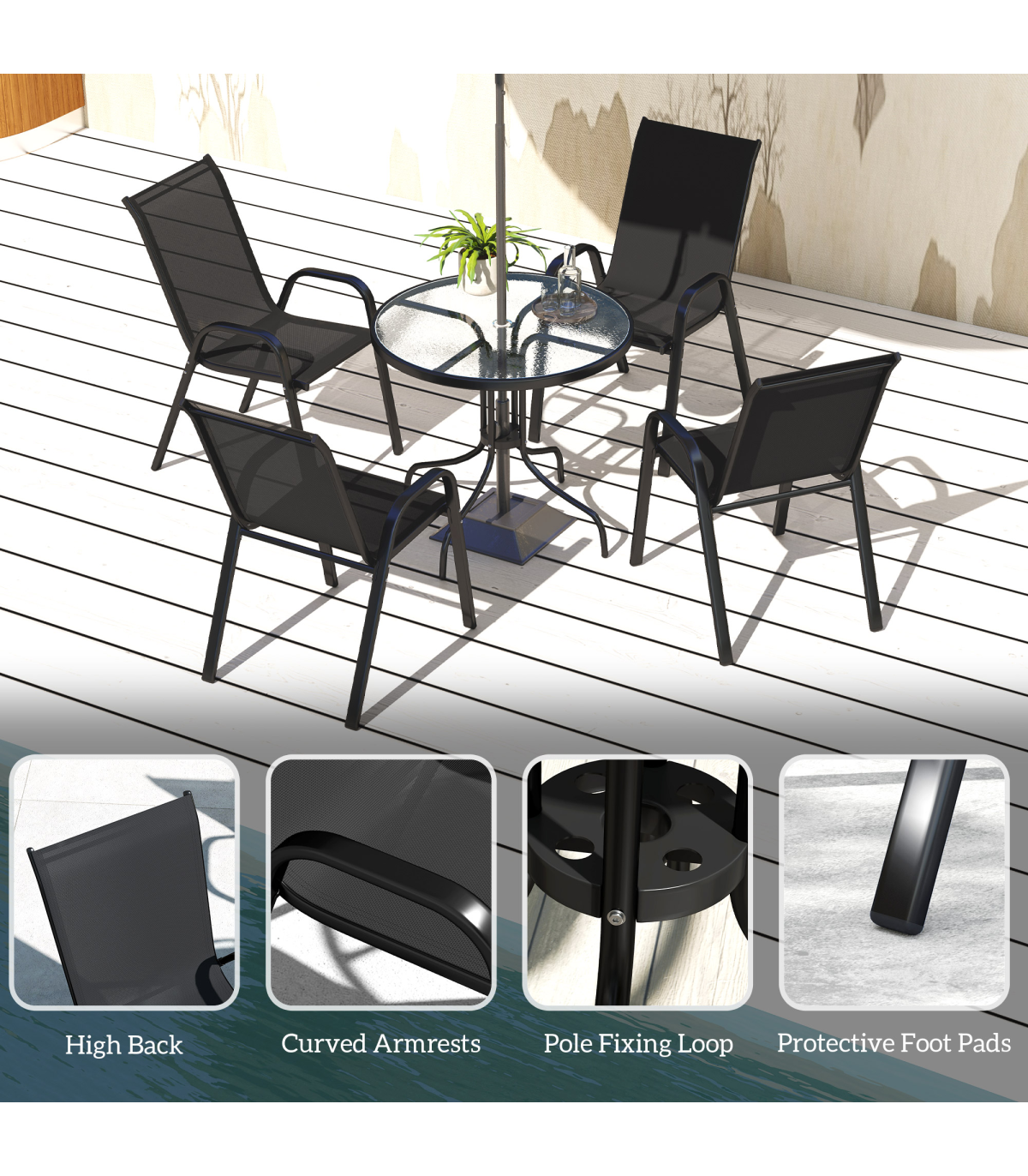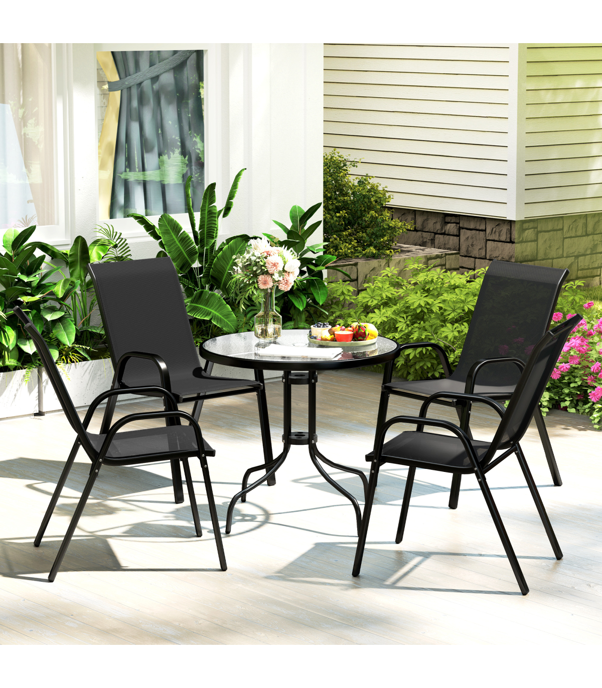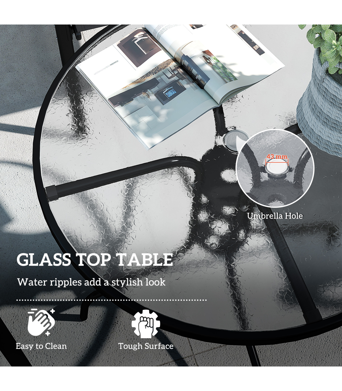 the chairs are stackable to save space when not being used. Powder coated steel frames mean strong, tough cores which cores which are suitable for outdoor use. Balcony furniture set is complete with Φ43mm hole in the table to hold a parasol securely in place.