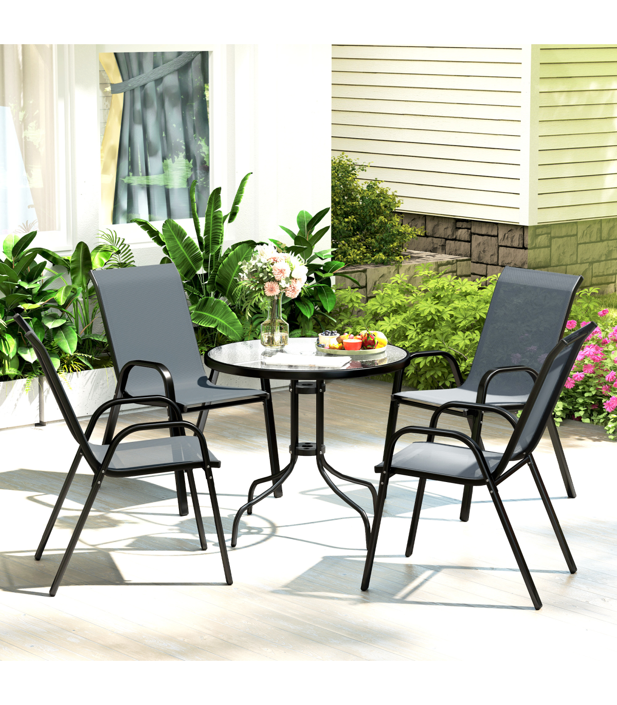 ● Outdoor dining set comes with a round table and four matching stackable chairs