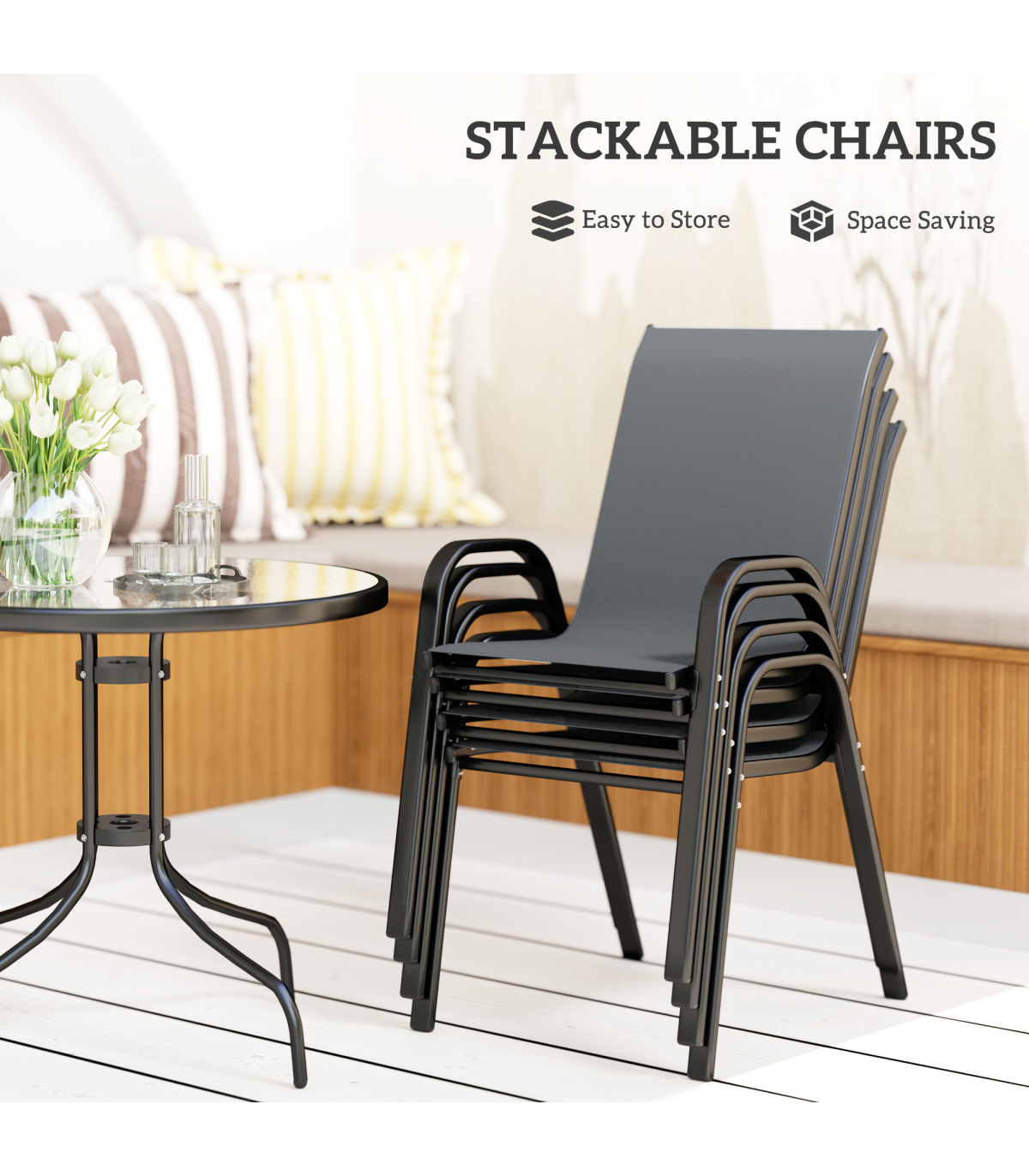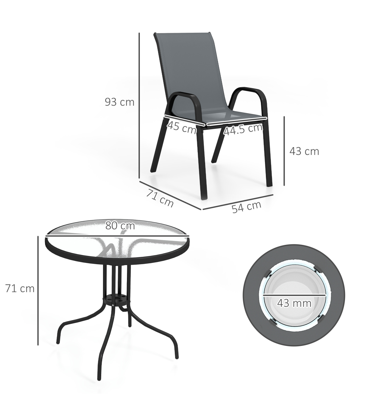 the chairs are stackable to save space when not being used. Powder coated steel frames mean strong, tough cores which cores which are suitable for outdoor use. Balcony furniture set is complete with Φ43mm hole in the table to hold a parasol securely in place.