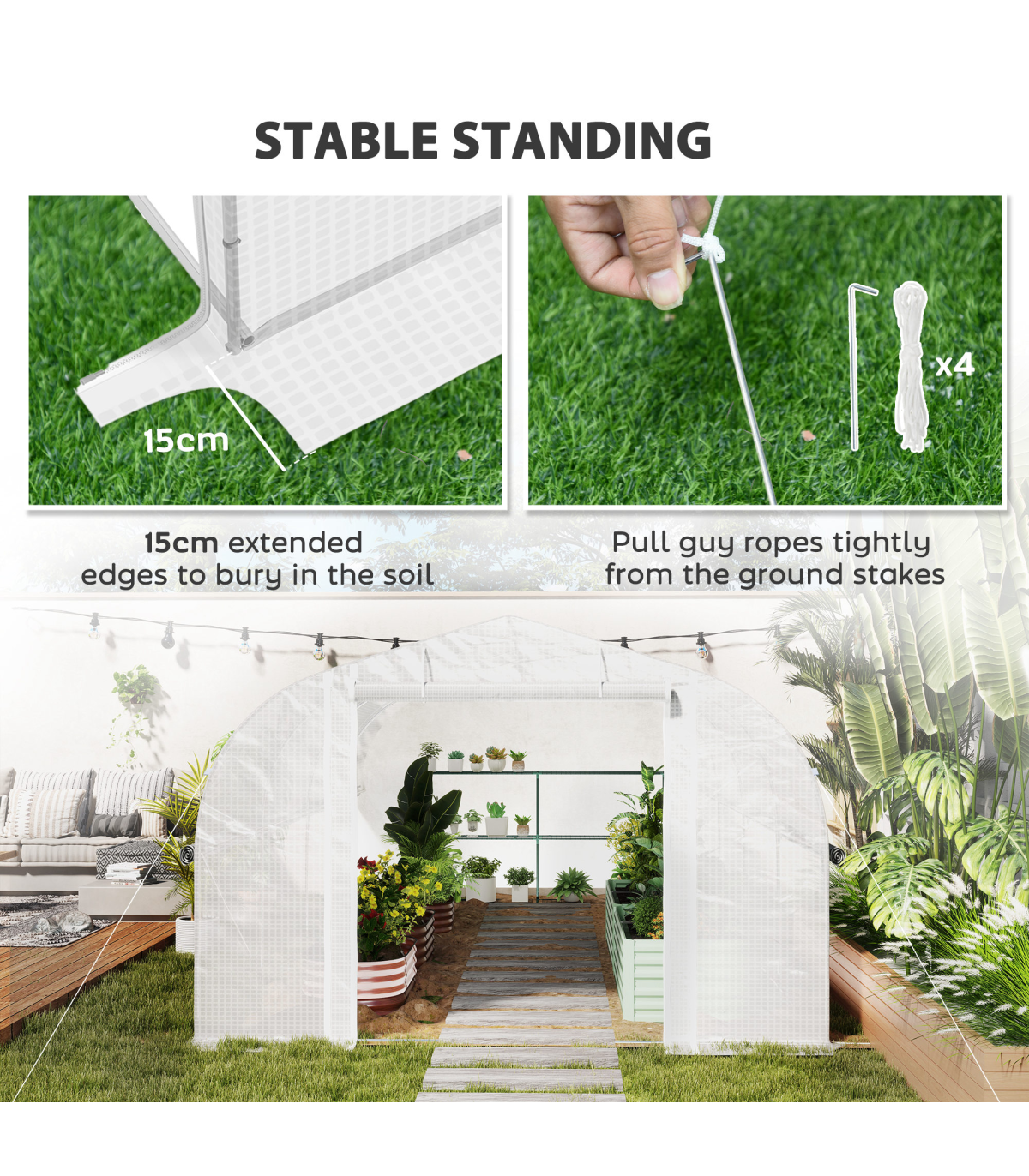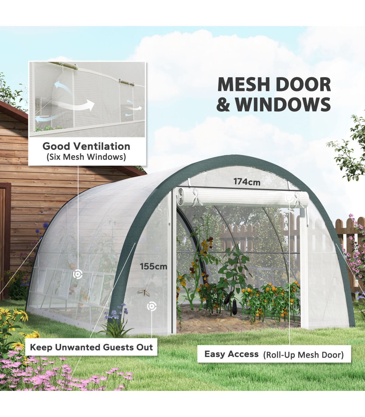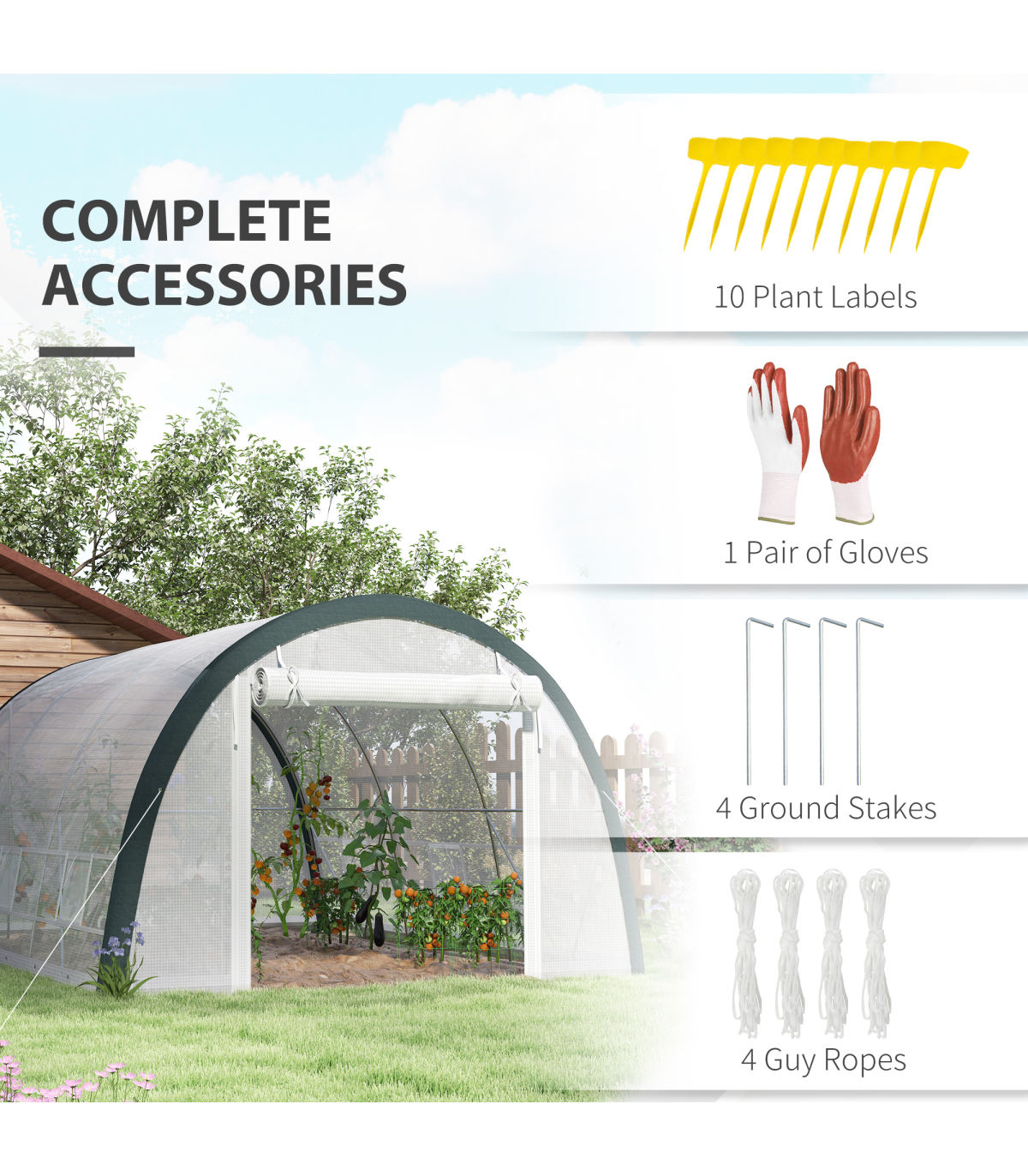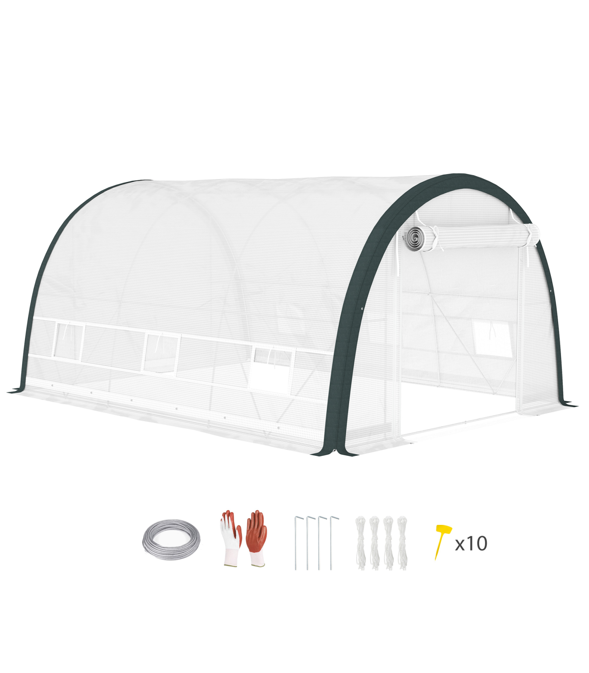 the middle reinforcement makes the cover extra tough. A large door for easy access, with six windows to bring fresh air in easily. Set comes with 4x ground stakes, 4x guy ropes, 10x plant labels and 1x pair of gloves.