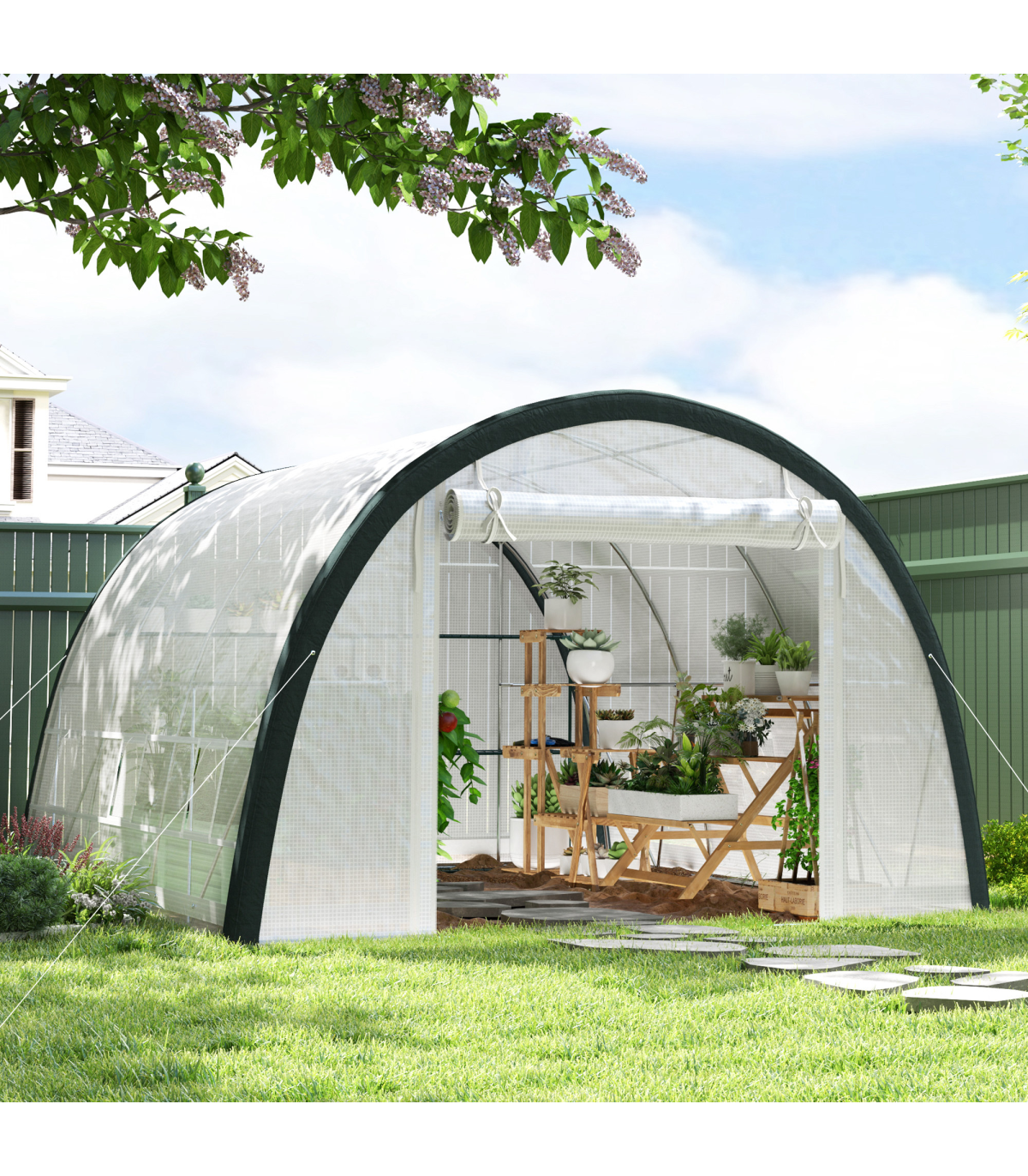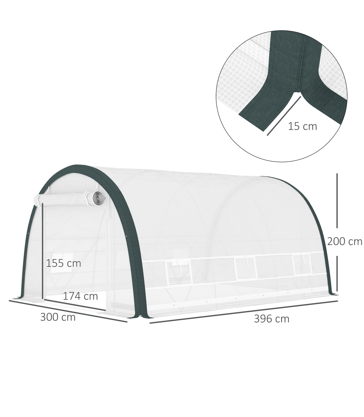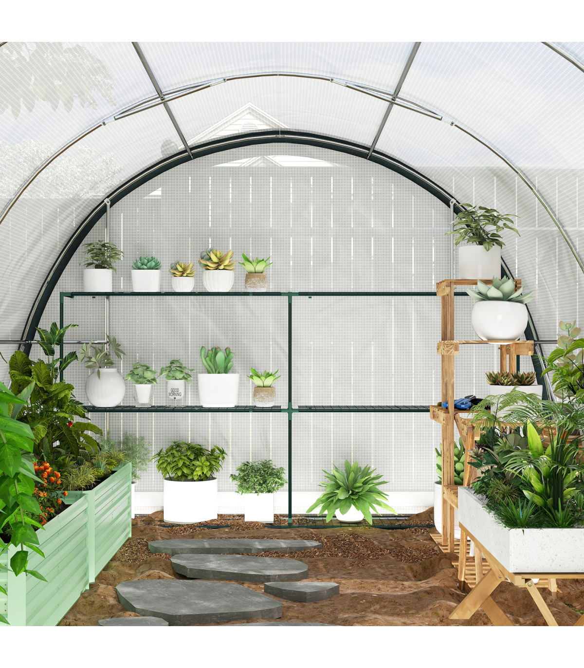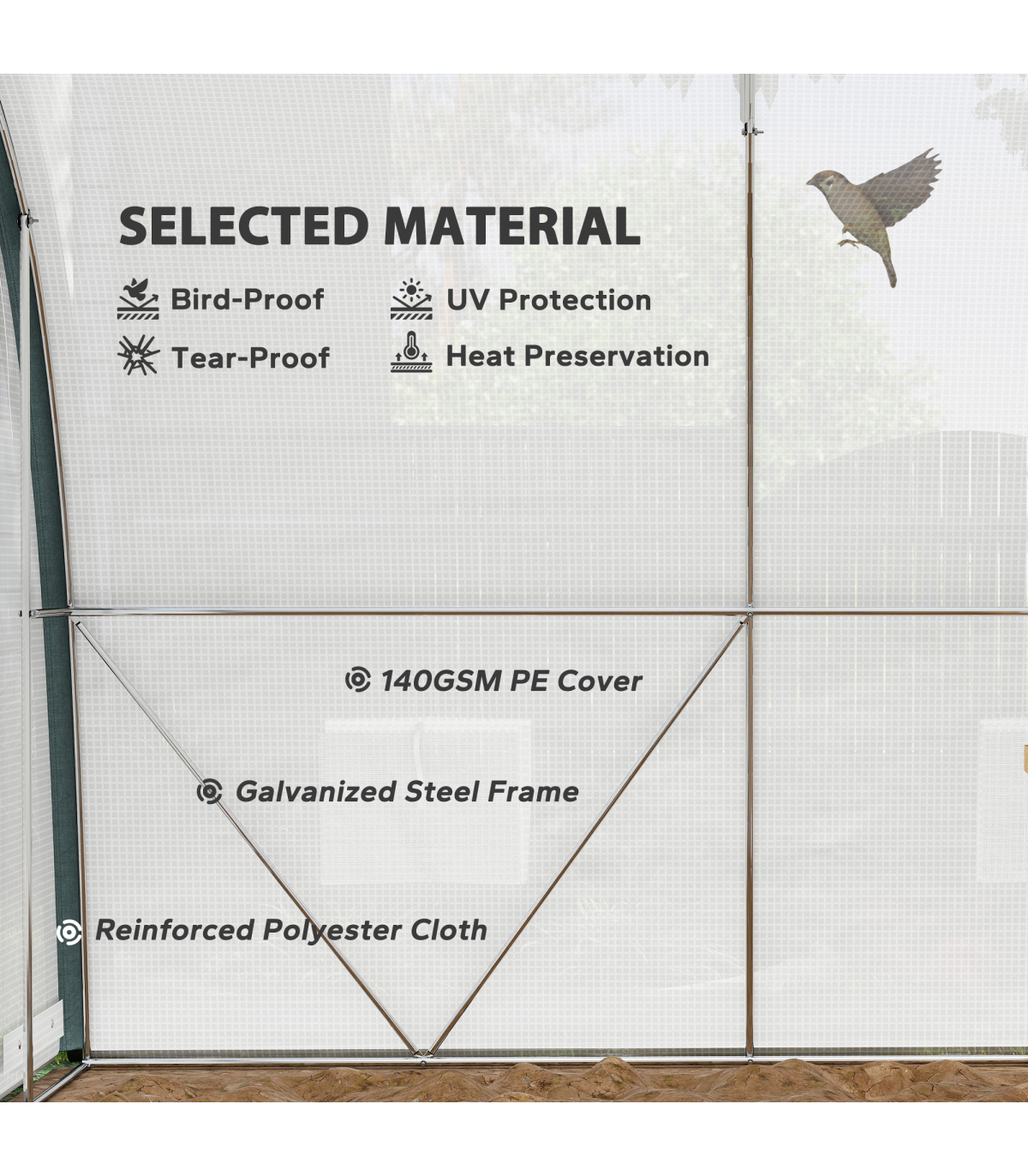 the middle reinforcement makes the cover extra tough. A large door for easy access, with six windows to bring fresh air in easily. Set comes with 4x ground stakes, 4x guy ropes, 10x plant labels and 1x pair of gloves.
