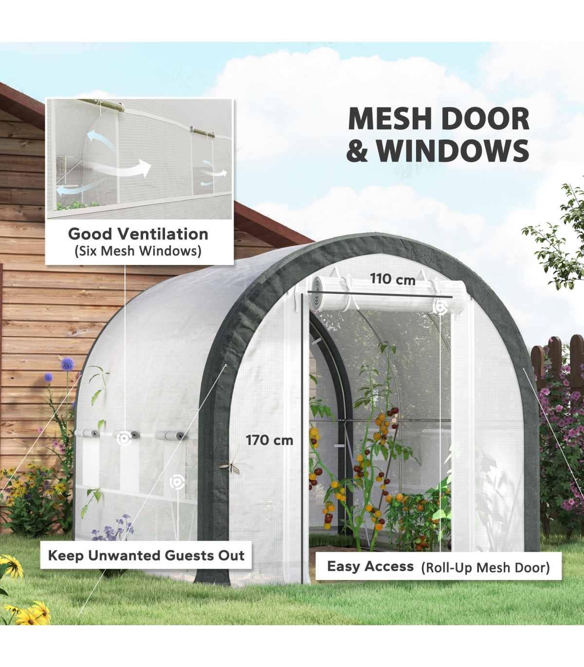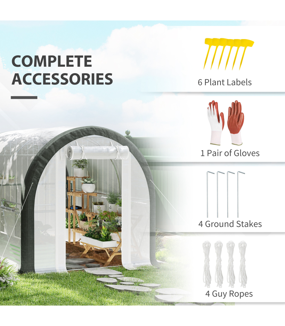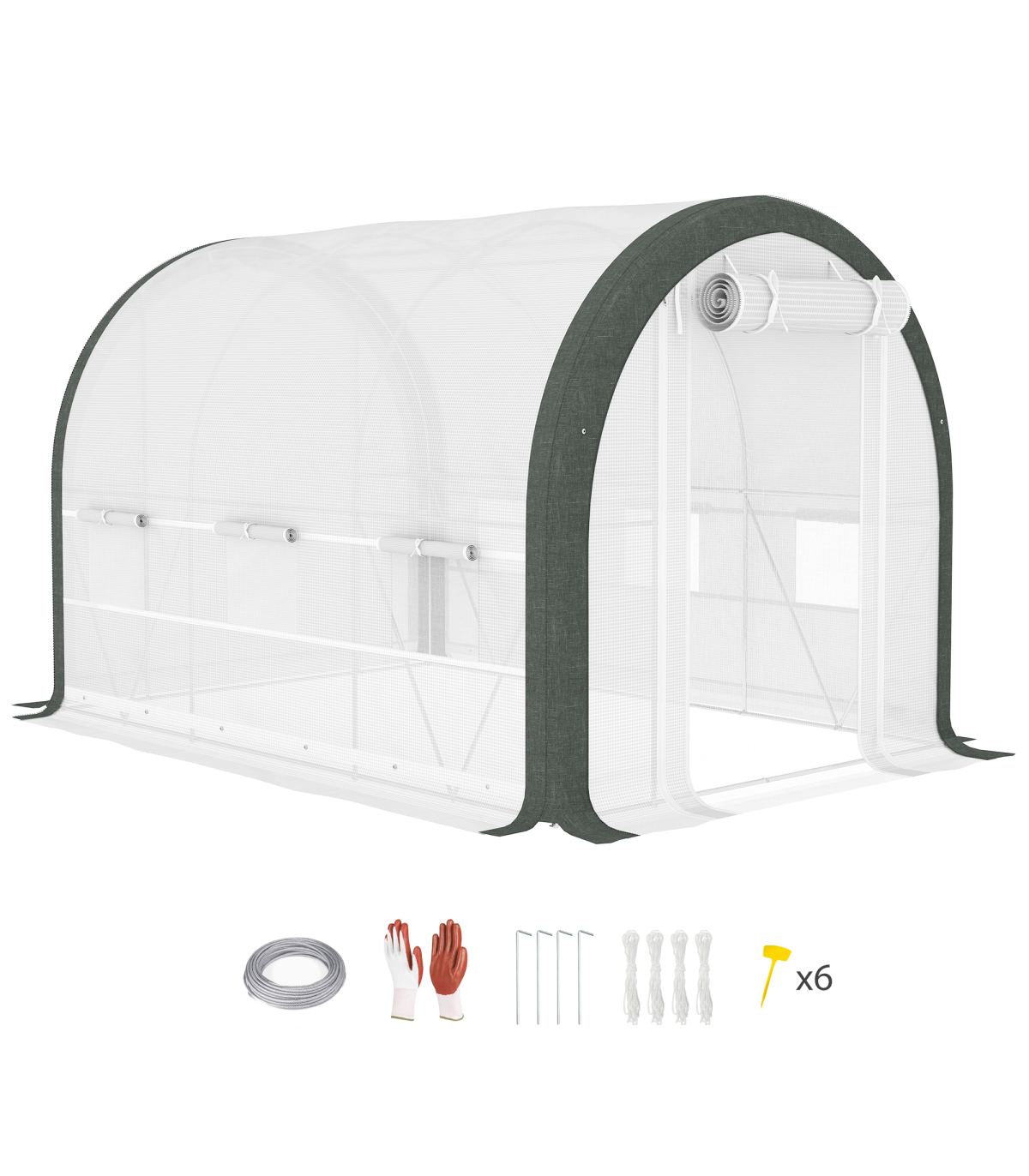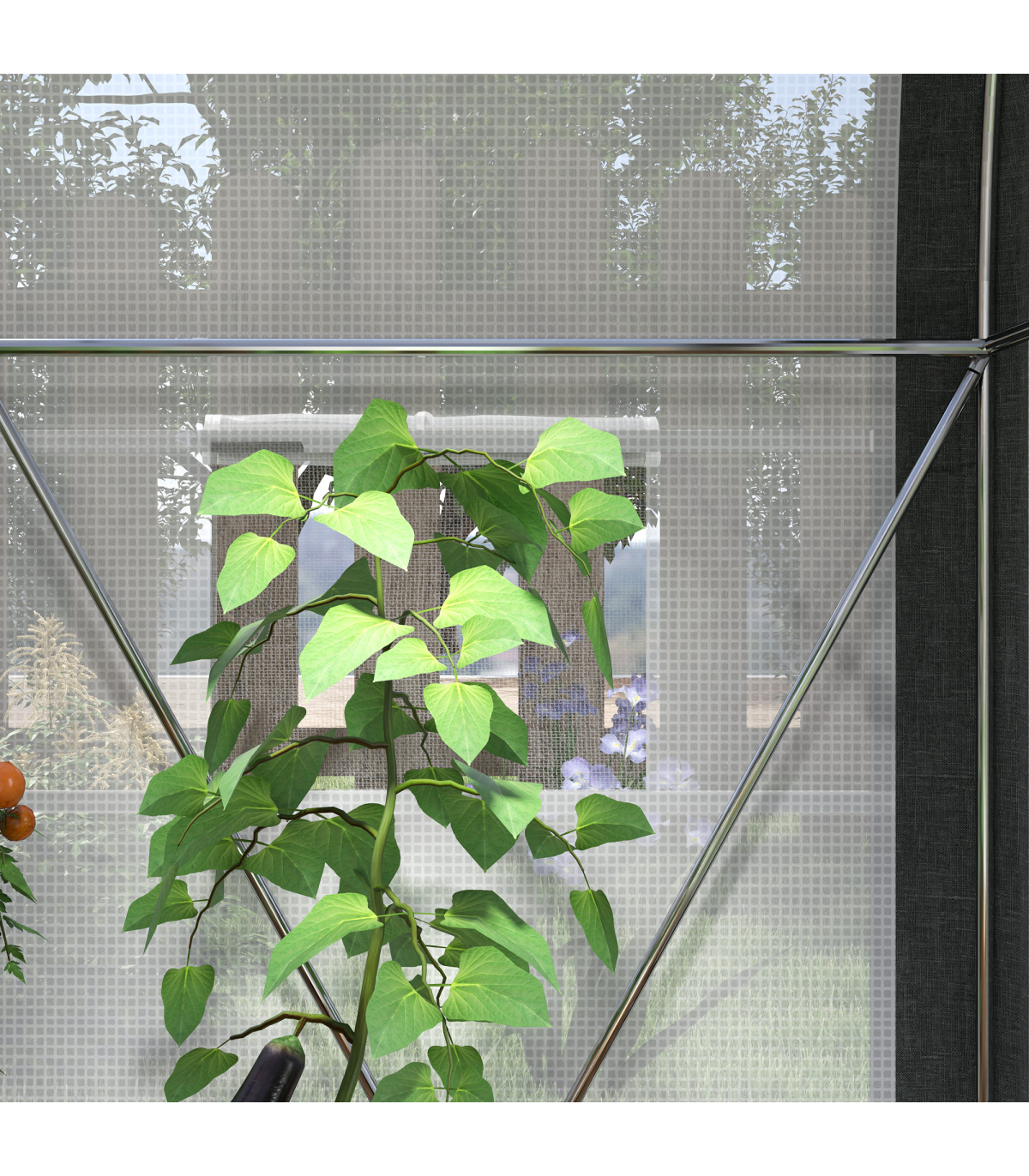the middle reinforcement makes the cover extra tough. A large door for easy access, with six windows to bring fresh air in easily. Set comes with 4x ground stakes, 4x guy ropes, 10x plant labels and 1x pair of gloves.
