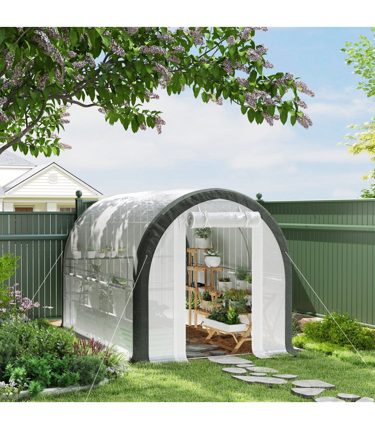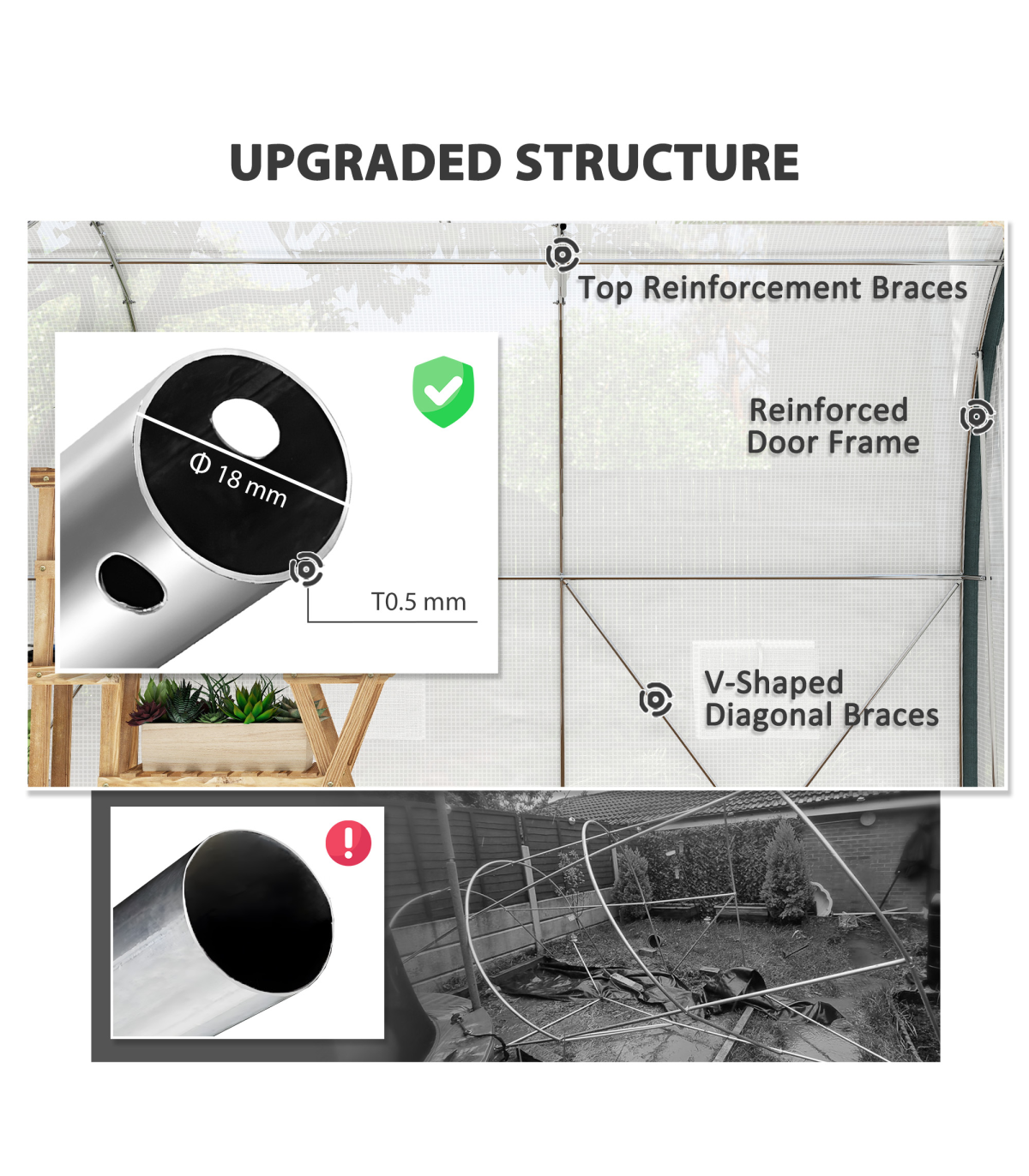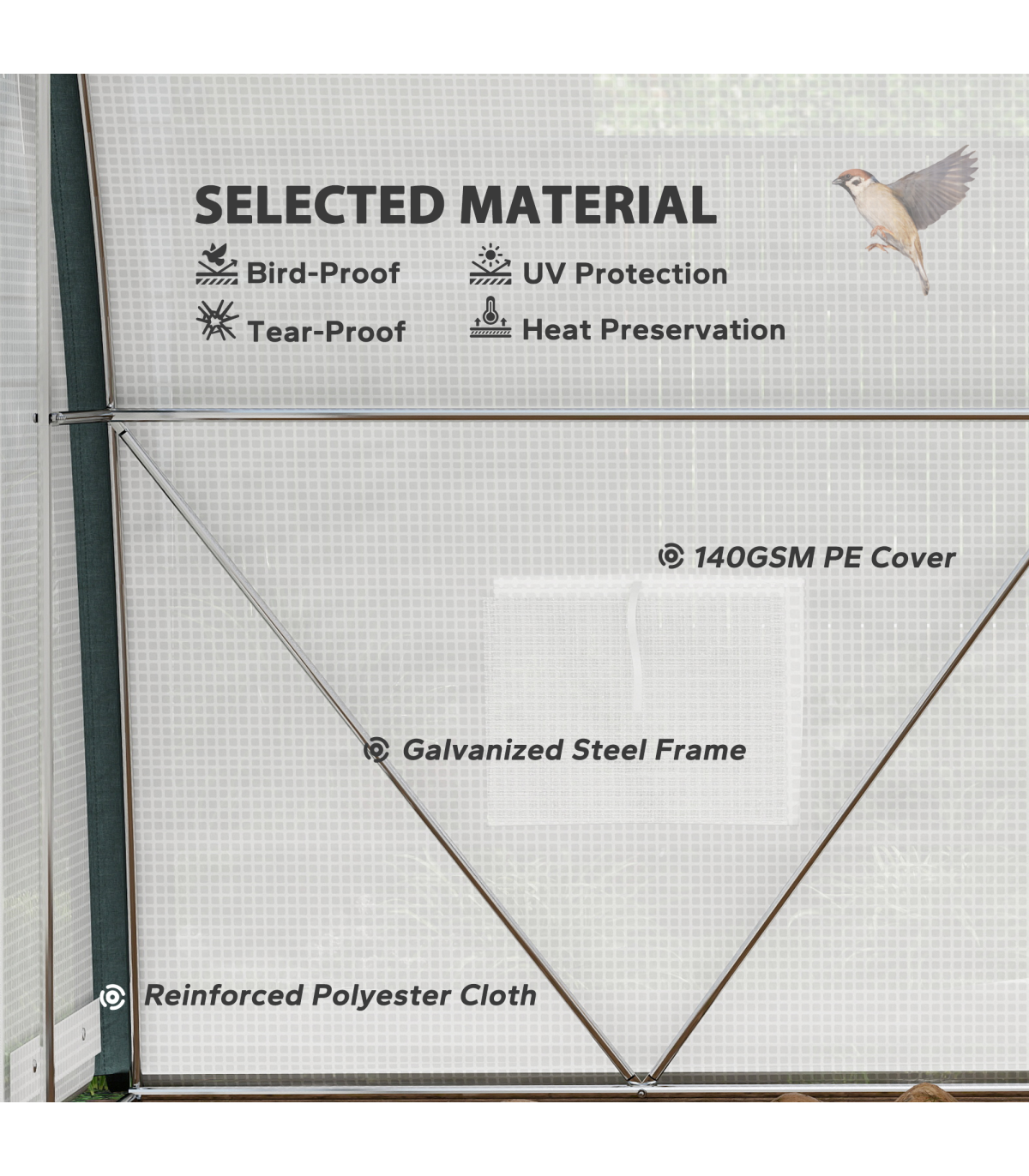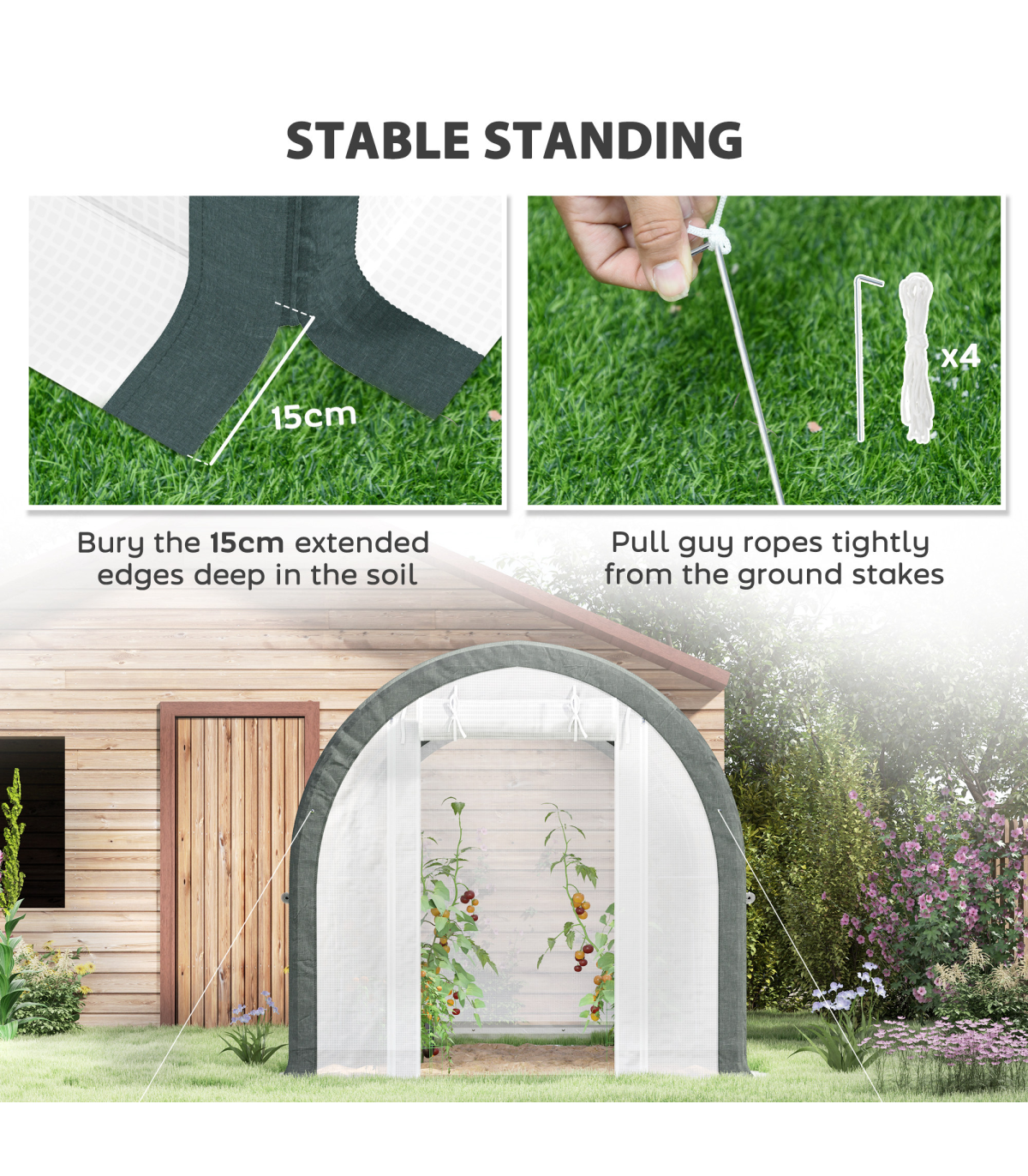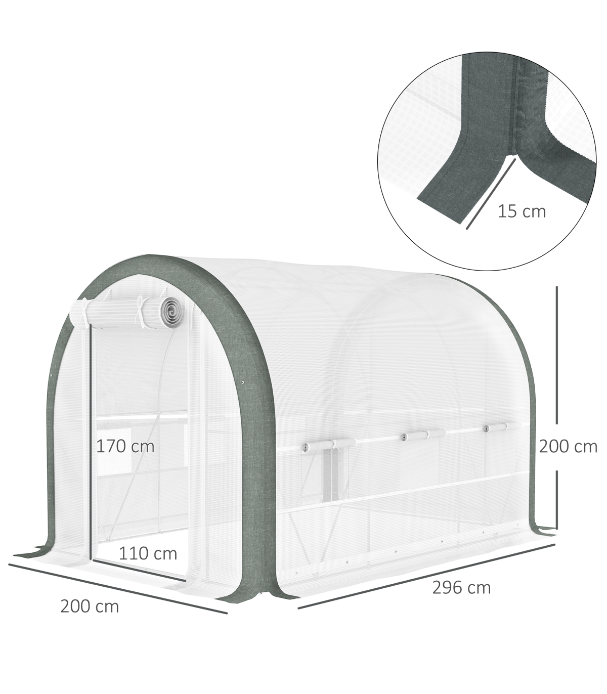 the middle reinforcement makes the cover extra tough. A large door for easy access, with six windows to bring fresh air in easily. Set comes with 4x ground stakes, 4x guy ropes, 10x plant labels and 1x pair of gloves.