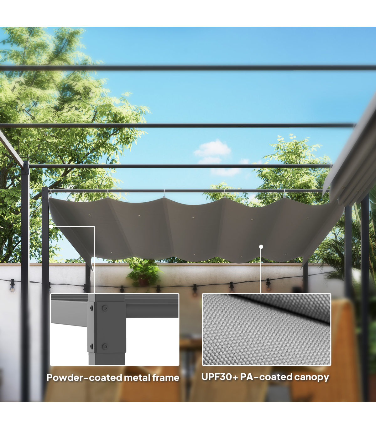 Transform your garden into a blissful escape with the Outsunny retractable pergola. Featuring a 180gsm PA-coated canopy with UPF30+ protection and a magnetic pad for secure placement, this steel pergola ensures both comfort and convenience. Enjoy a smoother experience with upgraded canopy hanging hooks, making this garden pergola with roof great for any outdoor cement or grass setup.