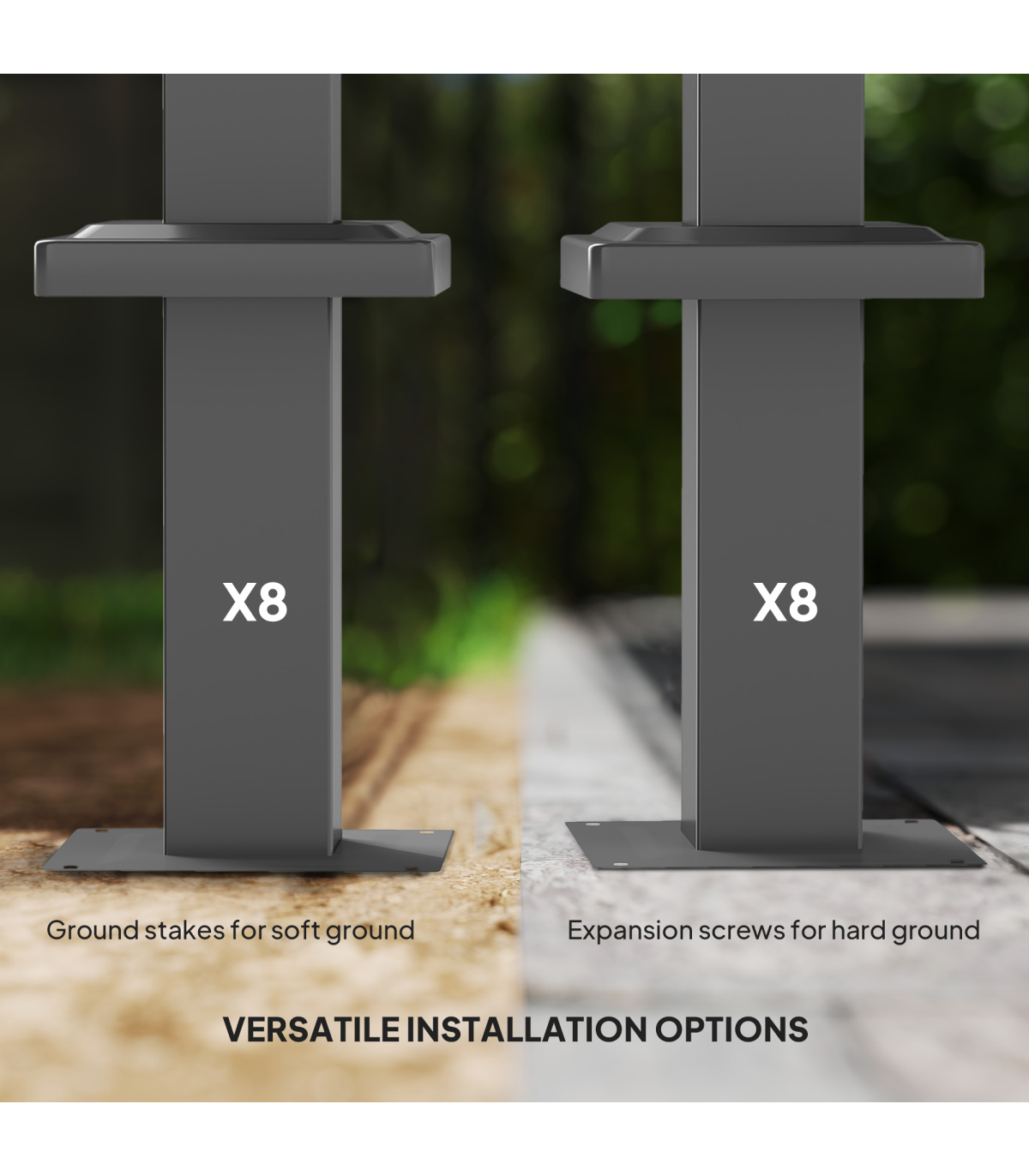 ● Includes ground stakes and anchor bolts for versatile installation